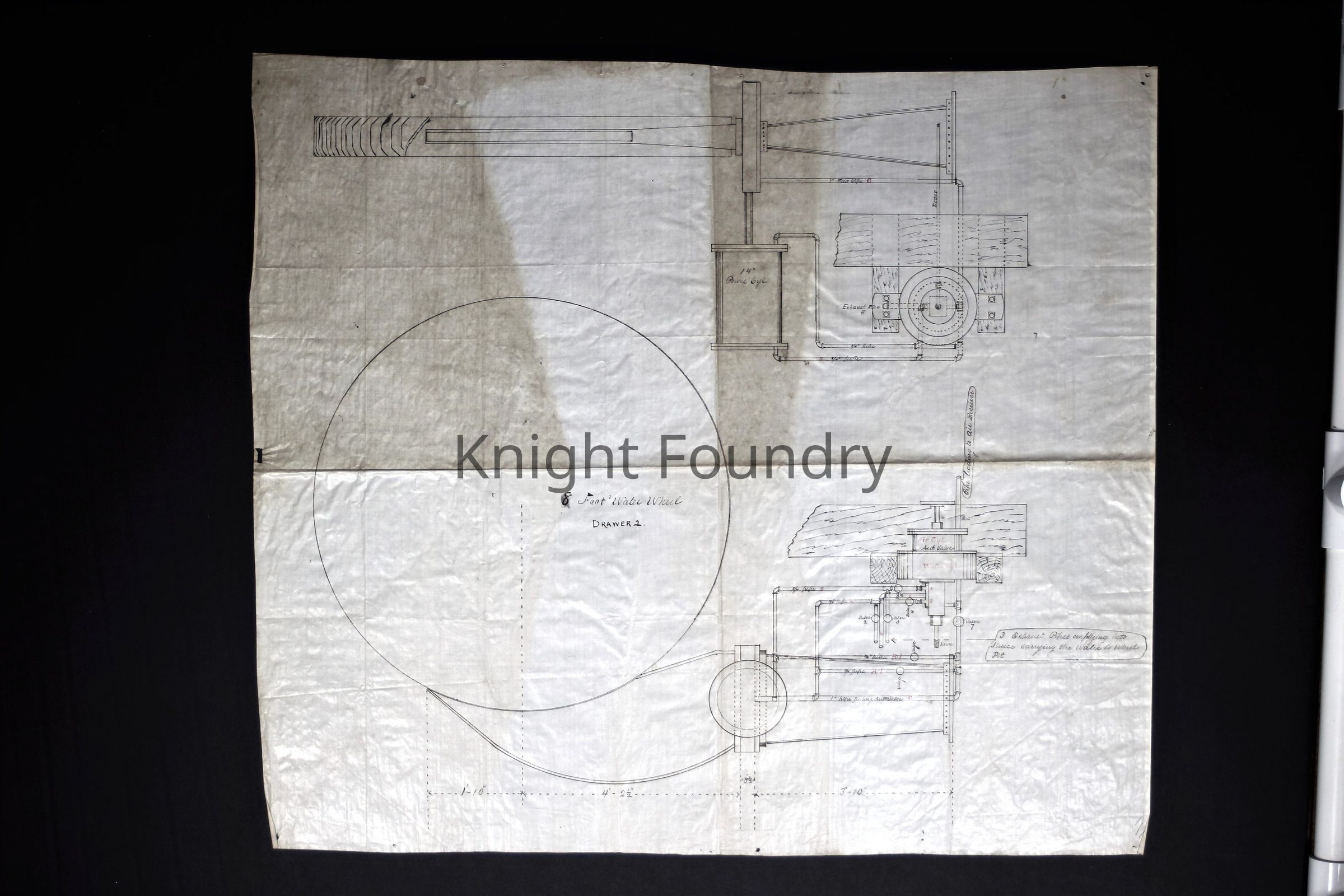 A drawing of an 8 foot waterwheel showing details of air and water cylinders and exhaust pipes for speed control. A note on the drawing reads "3 exhaust pipes emptying into sluice carrying the water to wheel pit." The drawing is marked drawer 2.Collection