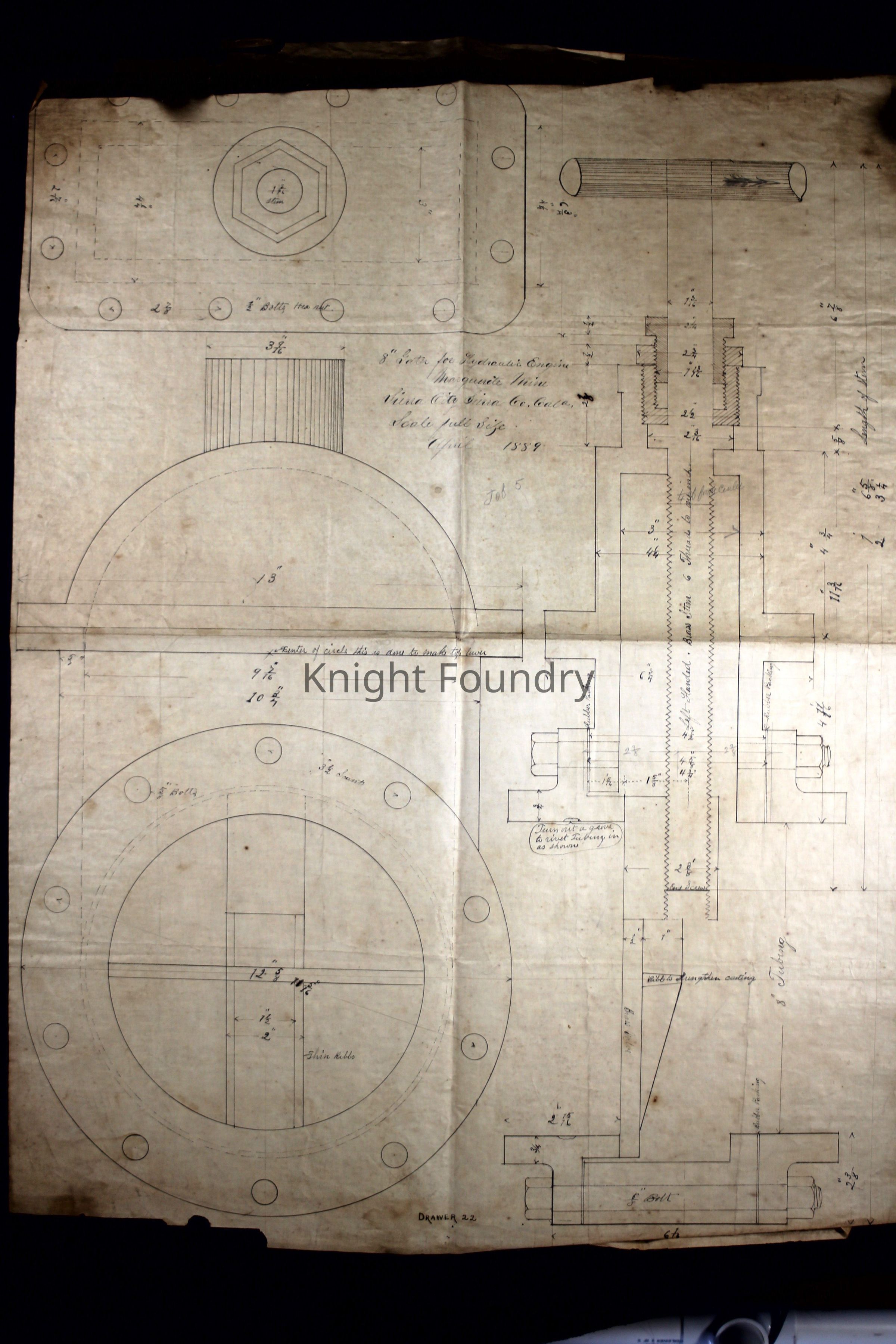 A drawing of an 8 inch gate valve for a hydraulic engine made for the Marguerite Mine in Sierra City, California. The drawing is dated April 1889 and notes drawer 22.Collection