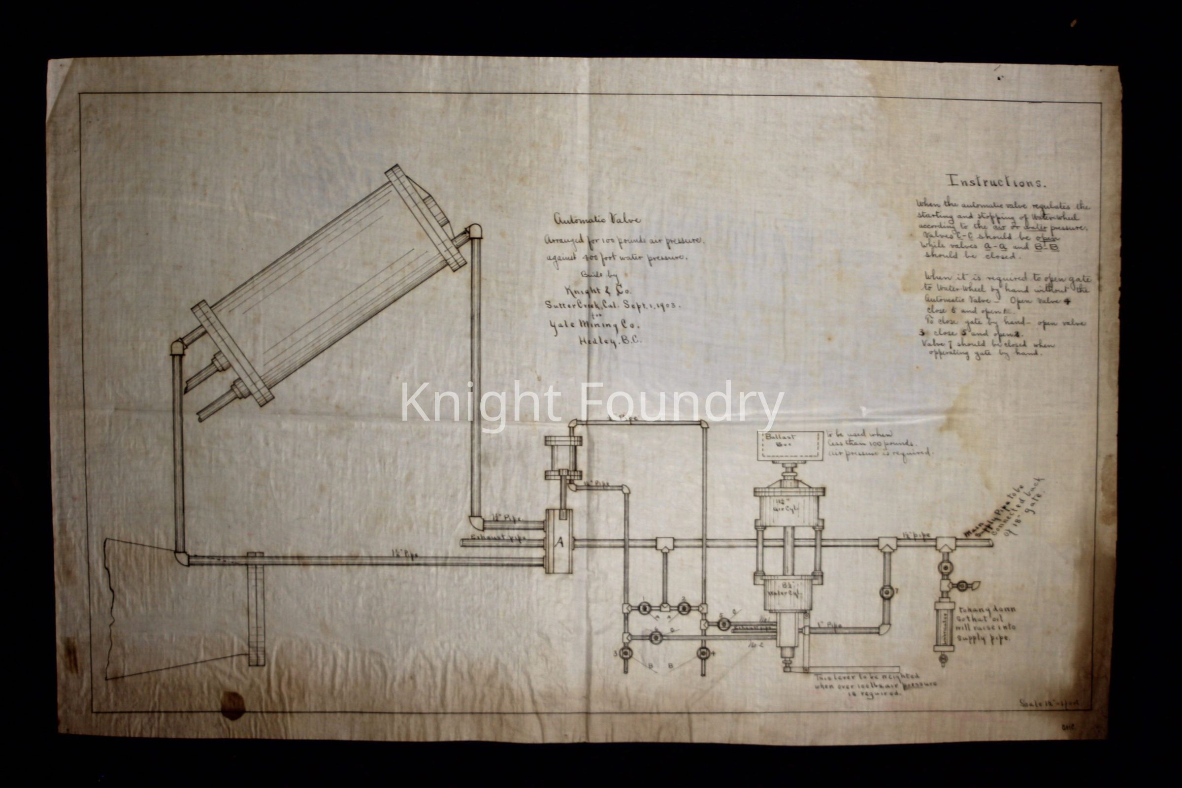 Drawing of an automatic valve assembly for the Yale Mining Company in Hedley, British Columbia. Includes instructions for use, multiple parts identified. Built by Knight & Co. Sutter Creek, Cal.Collection