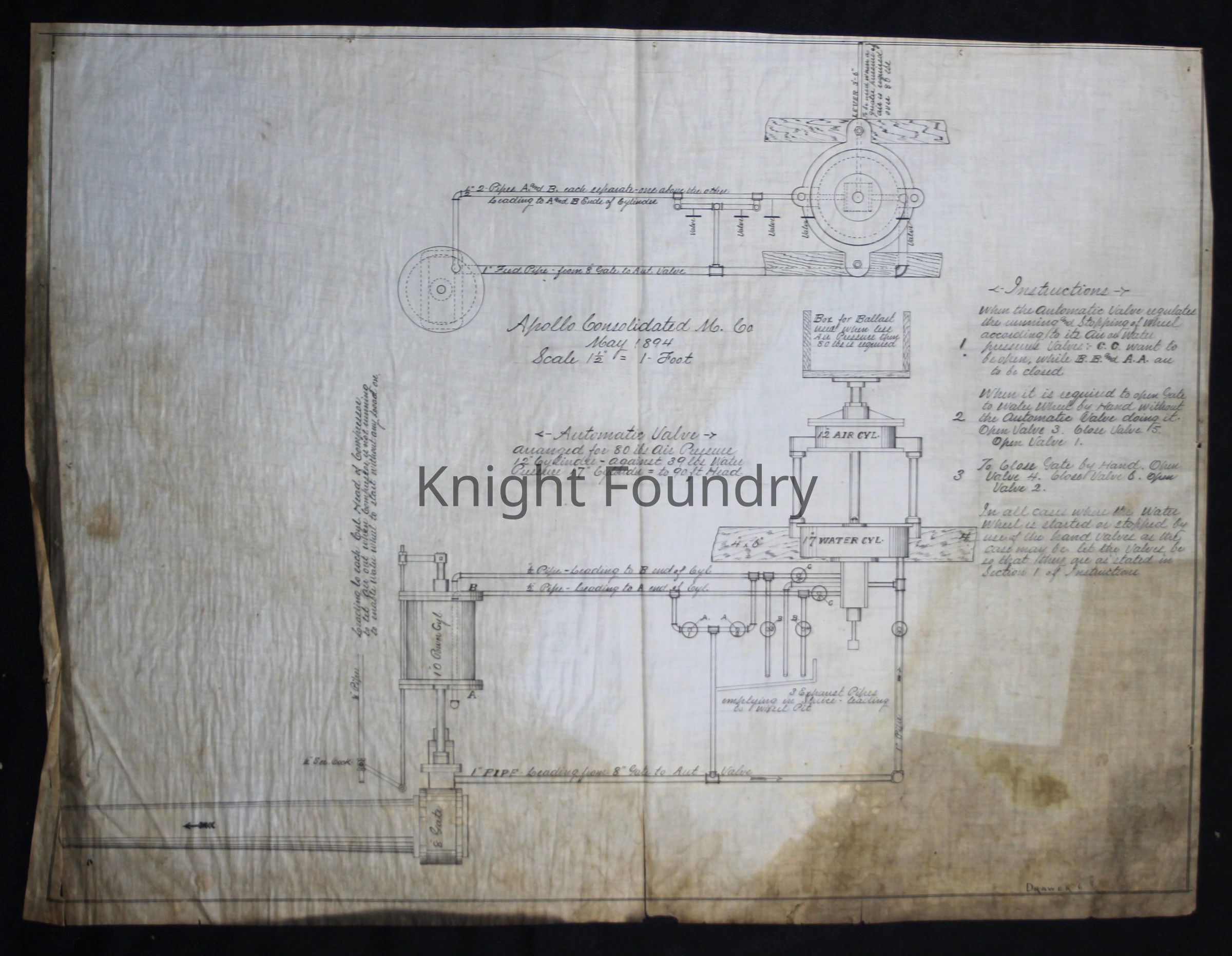 Drawing of an automatic valve assembly arranged for 80 pounds of air pressure, 12 inch cylinder against 39 lbs. water pressure created for the Apollo Consolidated Mining Company with instructions .The drawing is marked drawer 6.Collection