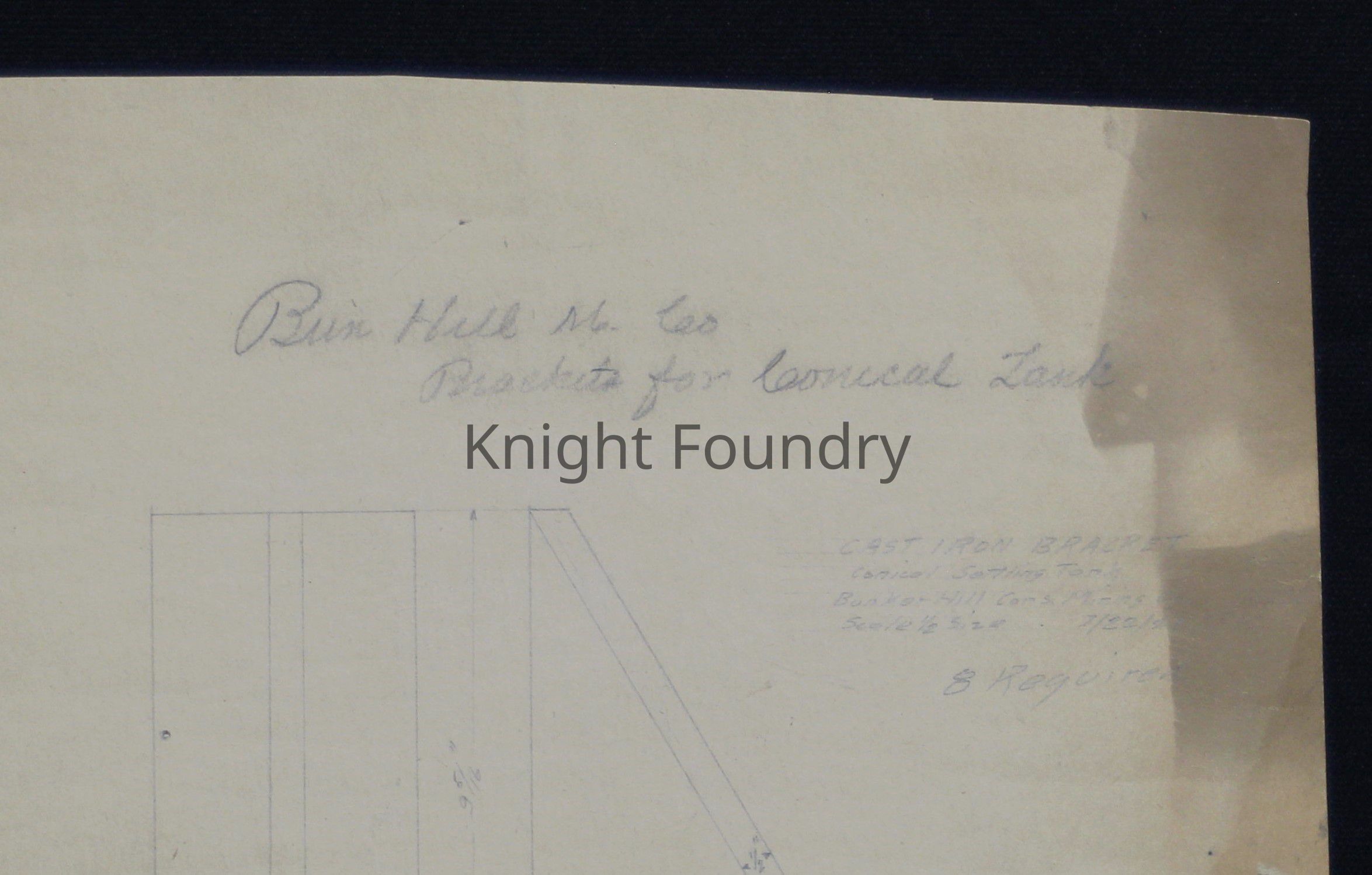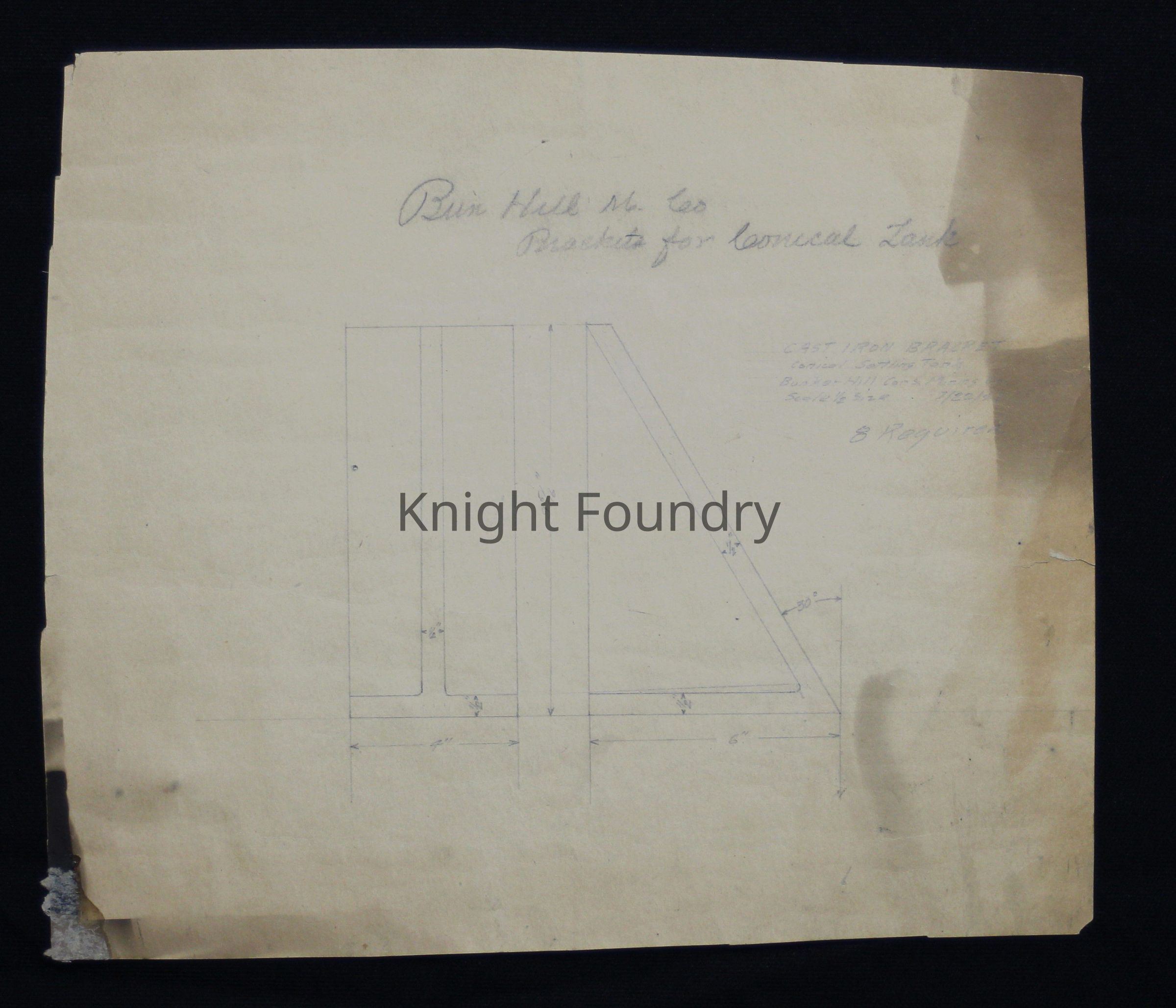 Drawing of cast iron brackets used for a conical settling tank made by Knight and Co. for the Bunker Hill Consolidated Mining Company. A note reads "8 required."Collection