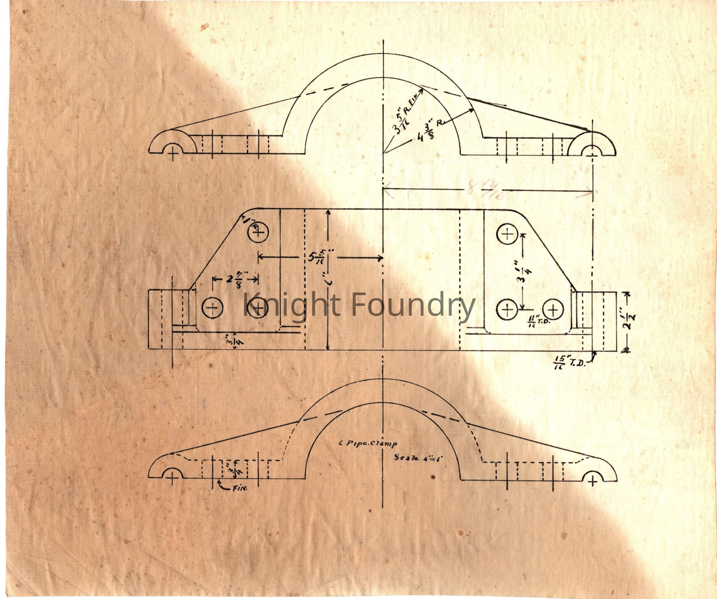 A drawing with 3 views of C pipe clamp with measurements.Collection