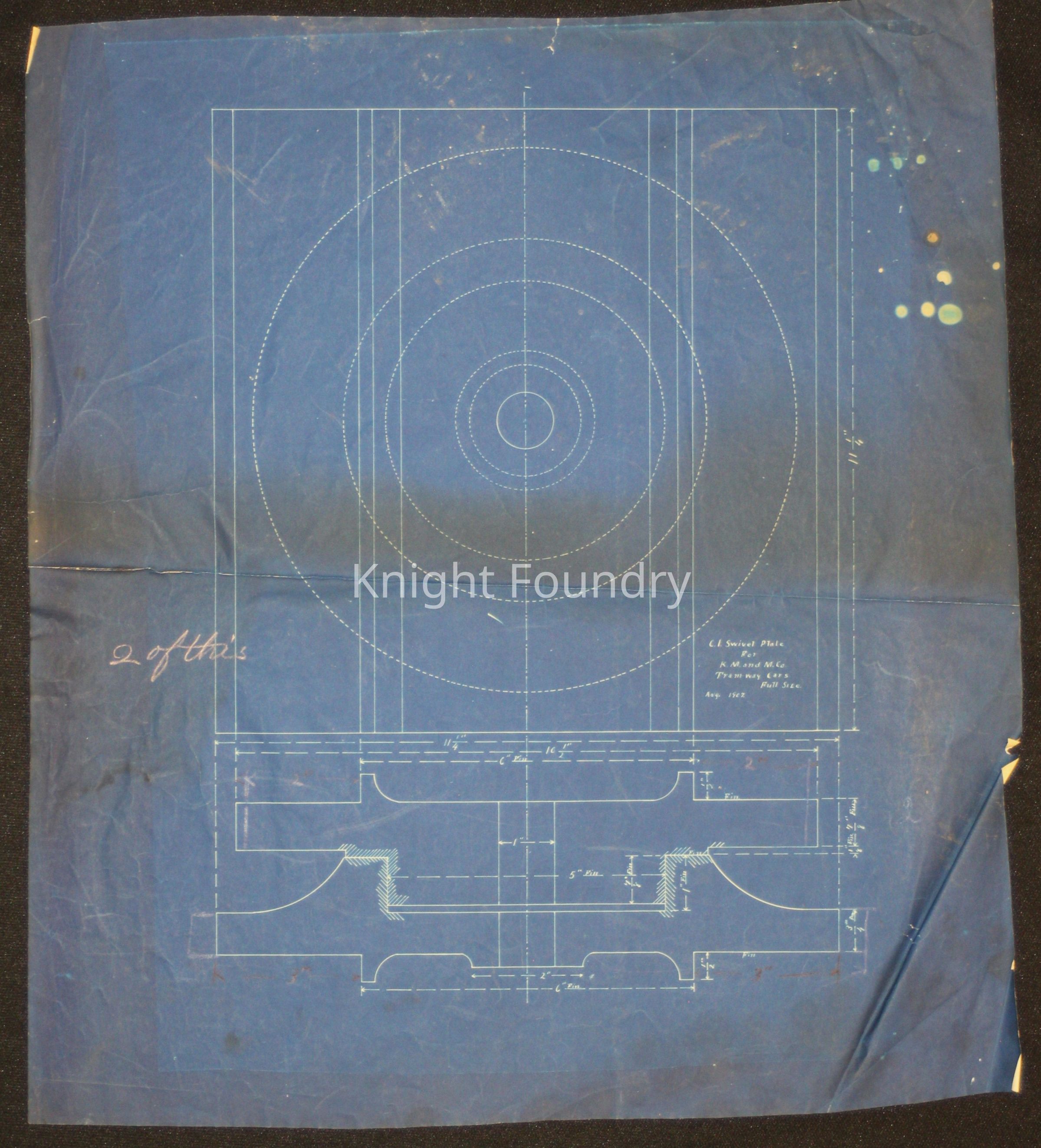 Blueprint of cast iron swivel plate for K. M. and M. Co. tram-way cars. Notes 2 of these.