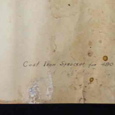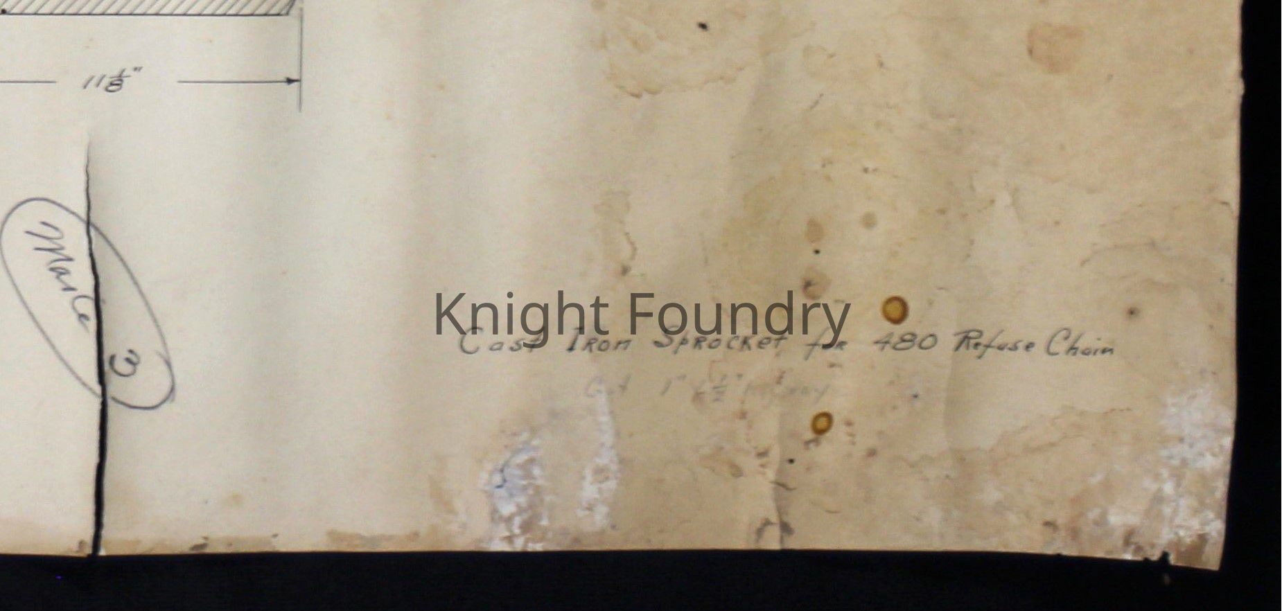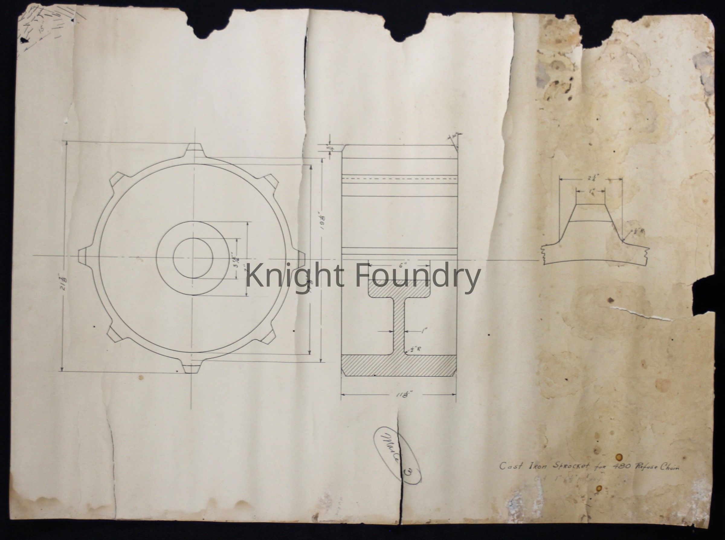A drawing of a cast iron sprocket for a 480 refuse chain. A note on the drawing reads "Make 3". Back of drawing notes " Calif Door Sprocket pistons" in faint red pencil.Collection