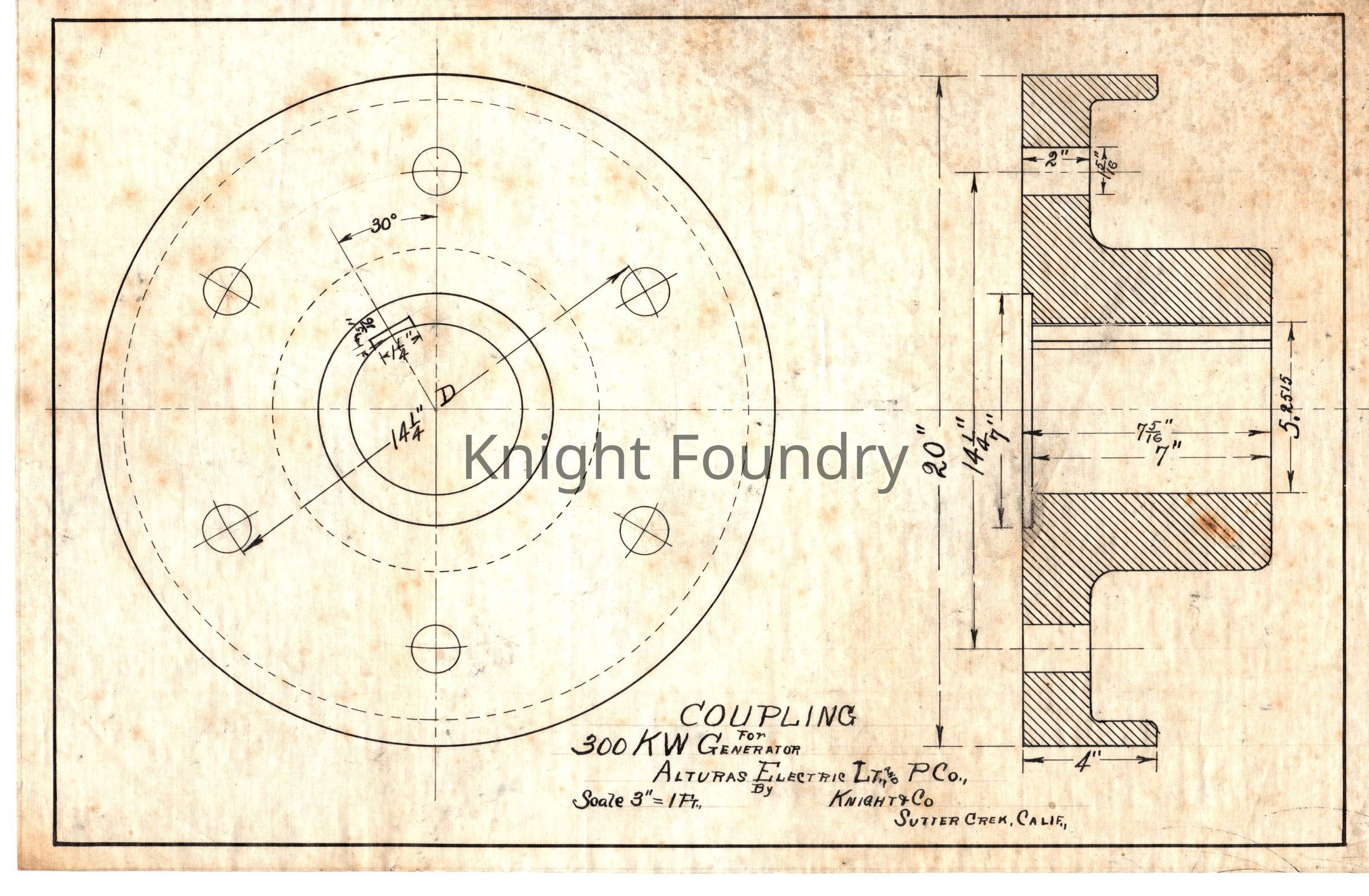 Drawing of a coupling for a 300 KW generator for the Alturas Electric Light and Power Co. Drawing notes " Knight & Co Sutter Creek, Calif."Collection