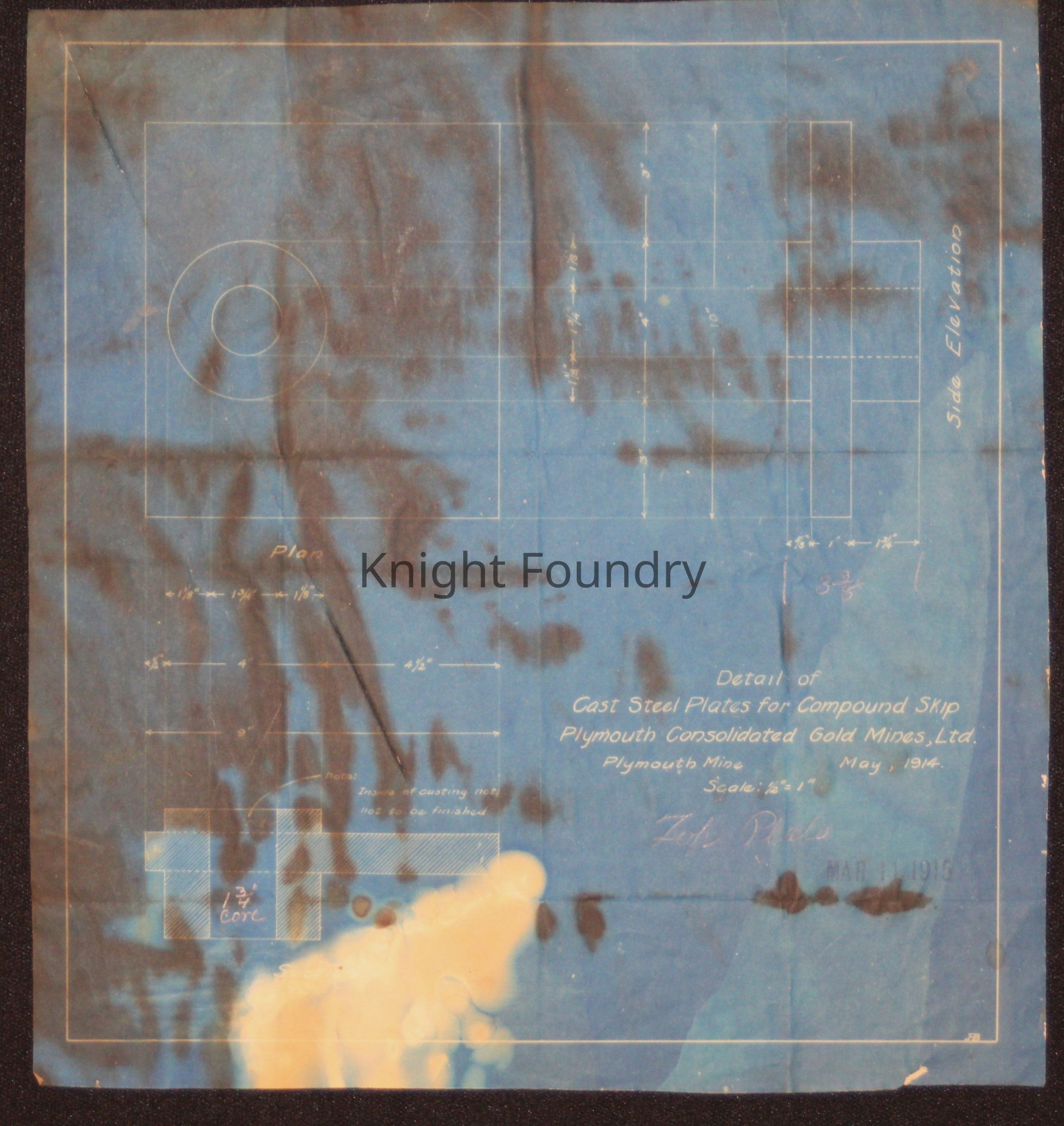 Blueprint of detail of cast steel plates for Compound skip for Plymouth Consolidated Gold Mines, Ltd. Written on drawing "Top Plate" and "1 3/4 in core". Stamped on drawing March 11, 1915Collection