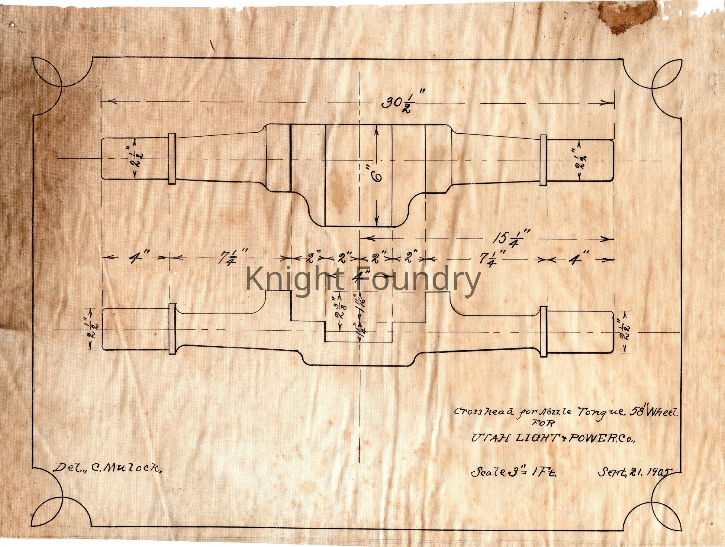 Drawing of a crosshead for a nozzle tongue, 58" wheel for the Utah Light and Power Co. Framing embellishment is shown on the drawing.Collection