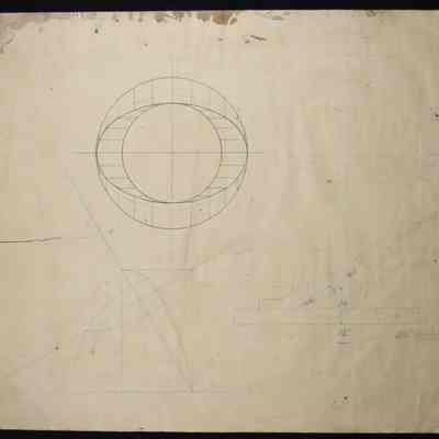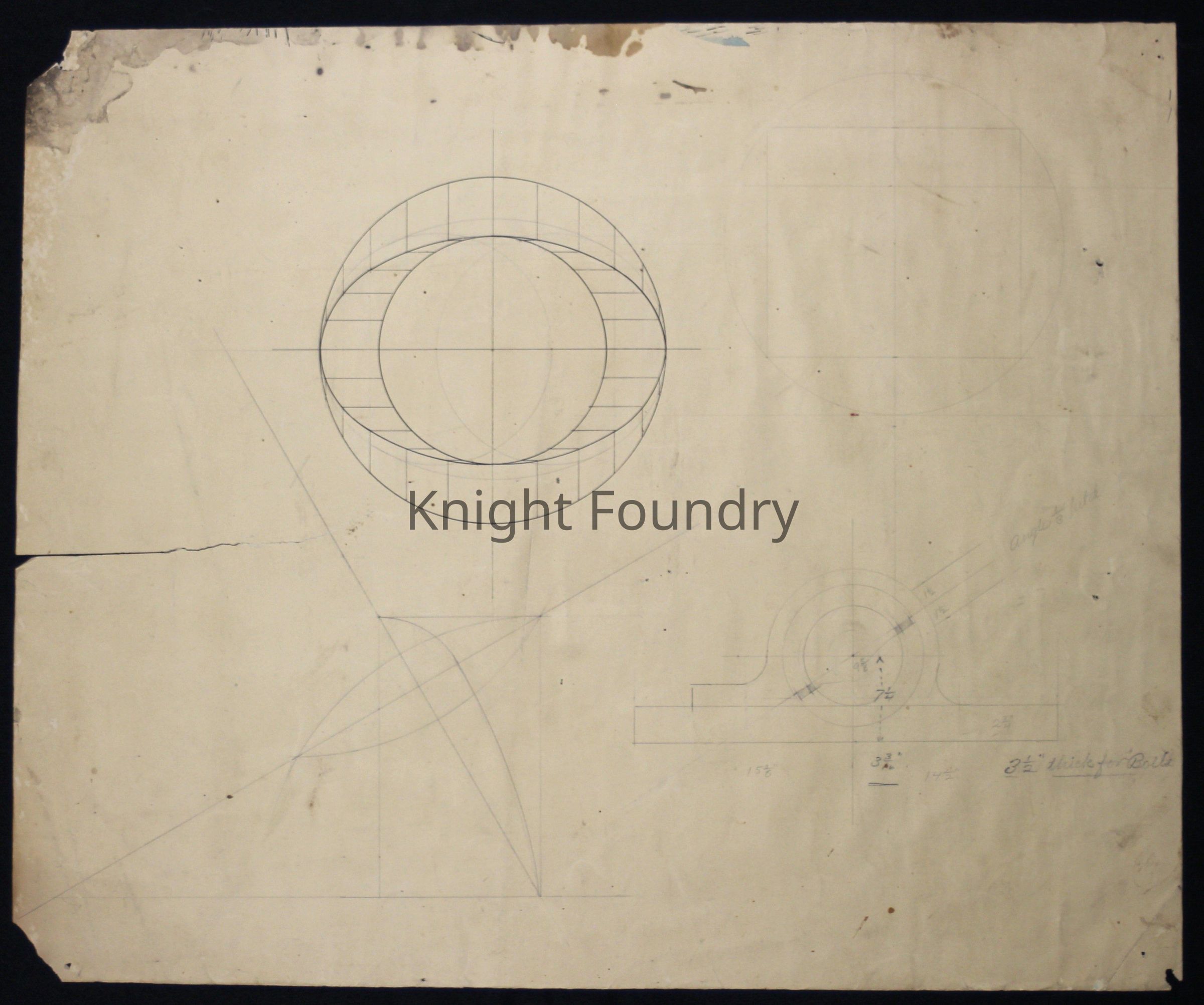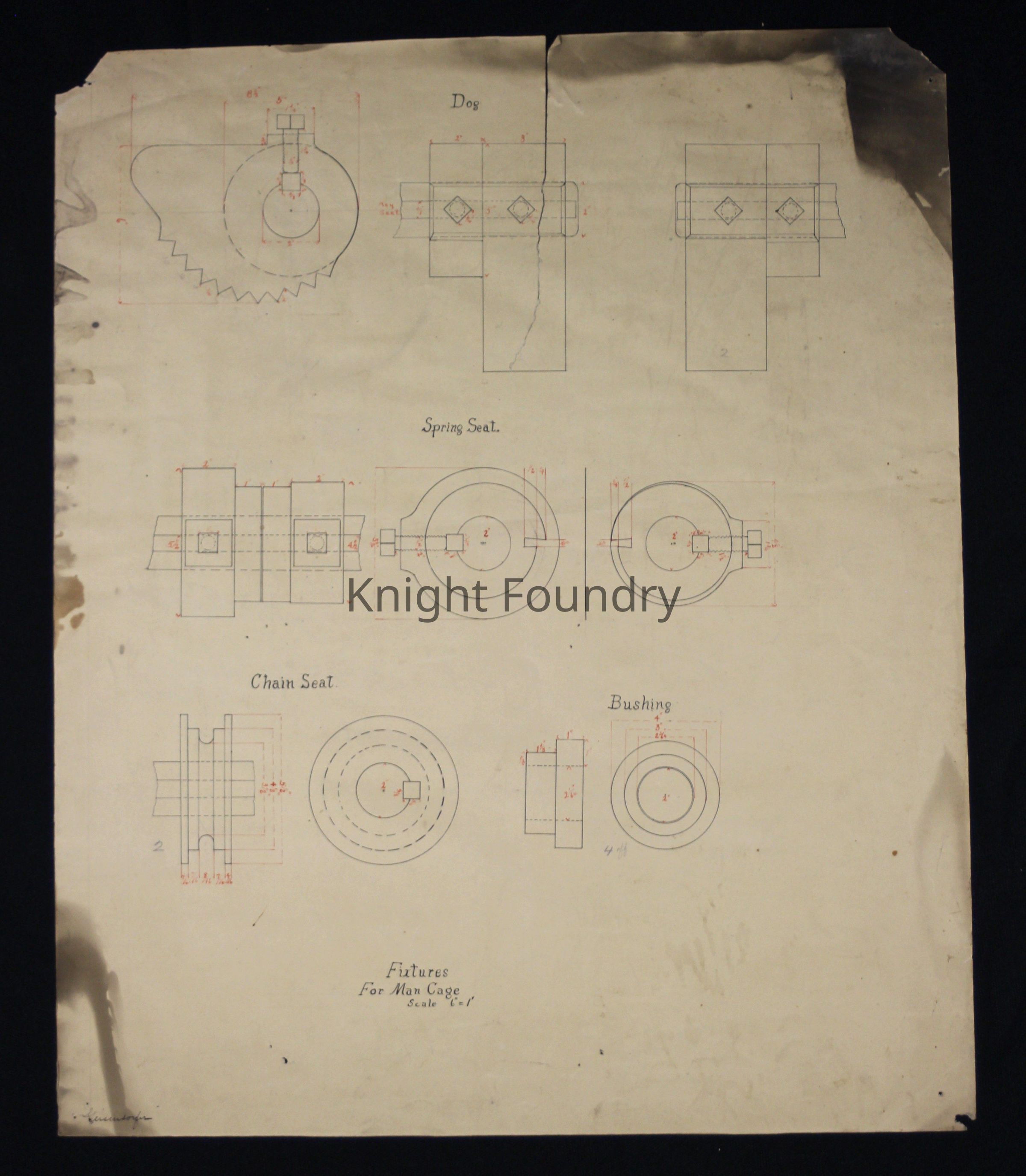A two-sided drawing. Front: A drawing of the fixtures for a "Man Cage". The fixtures are labeled dog, spring seat, chain seat, and bushing. Scale is 6 inches equals 1 foot. Back: drawing of a pillow block and a transition piece.Collection