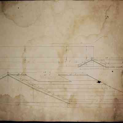 A two-sided drawing. Front: a drawing of a gear assembly with swinging gears. Back: drawing of a roof profile noting "this space is left out on each side of this roof."Collection