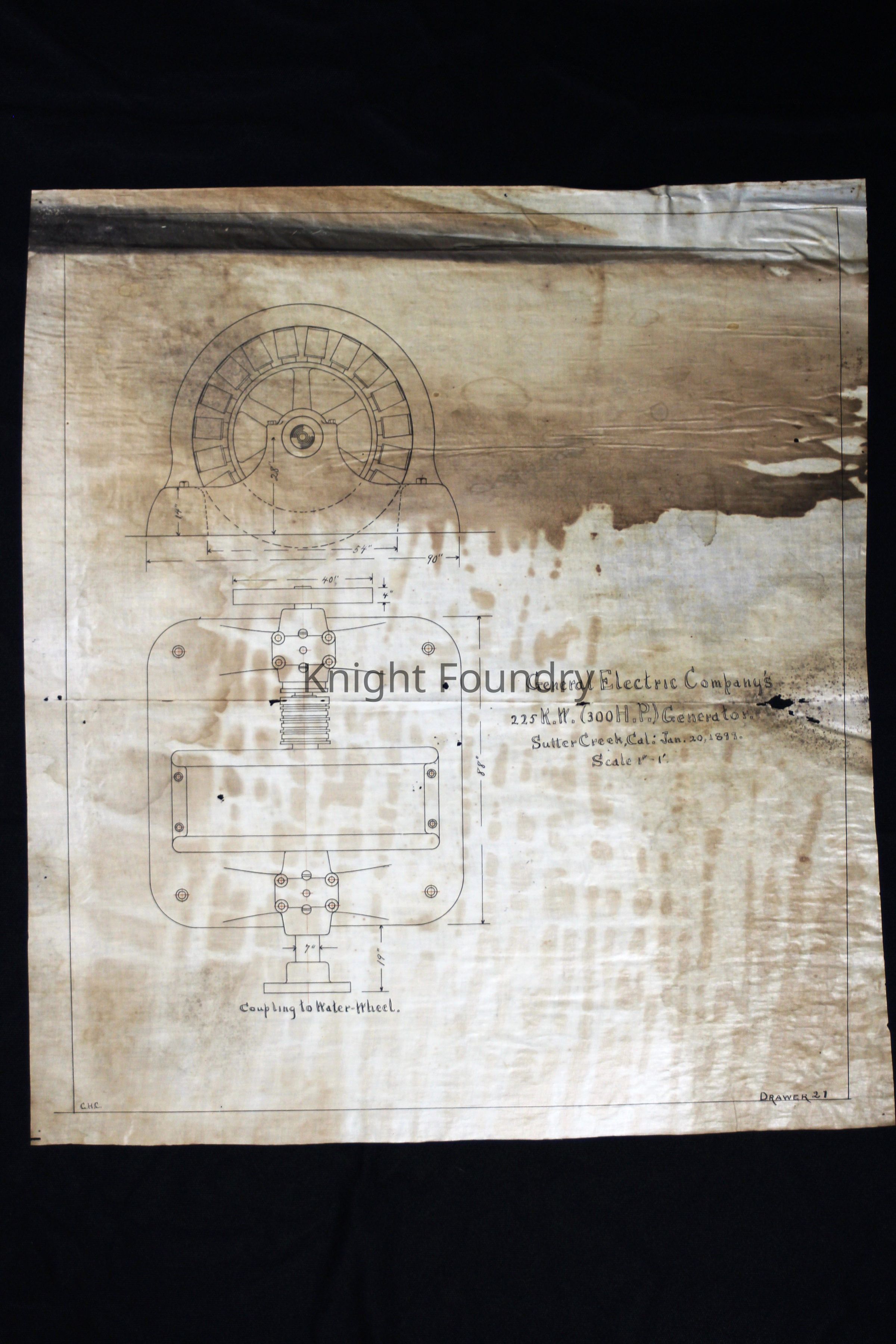 Drawing of a 225 kilowatt(300 H.P.) generator for the General Electric Company showing coupling to waterwheel. The drawing is marked drawer 21.
