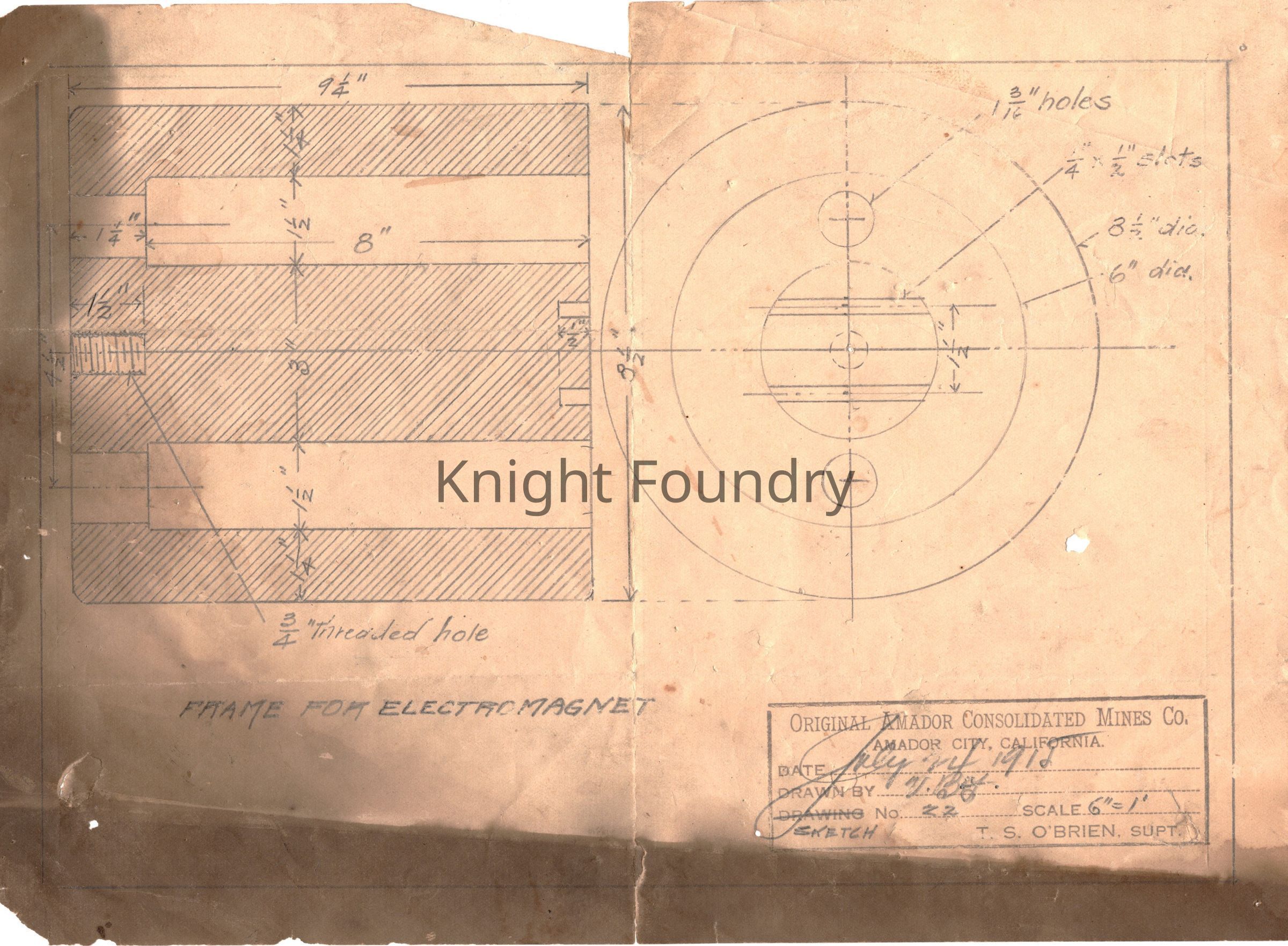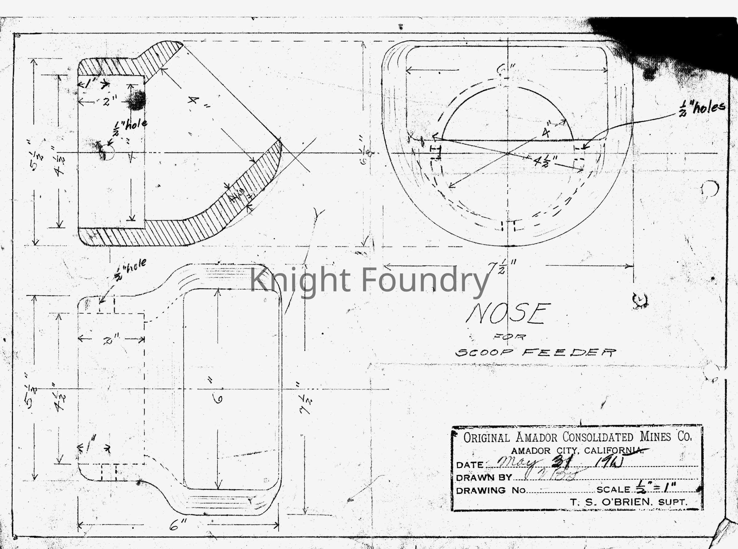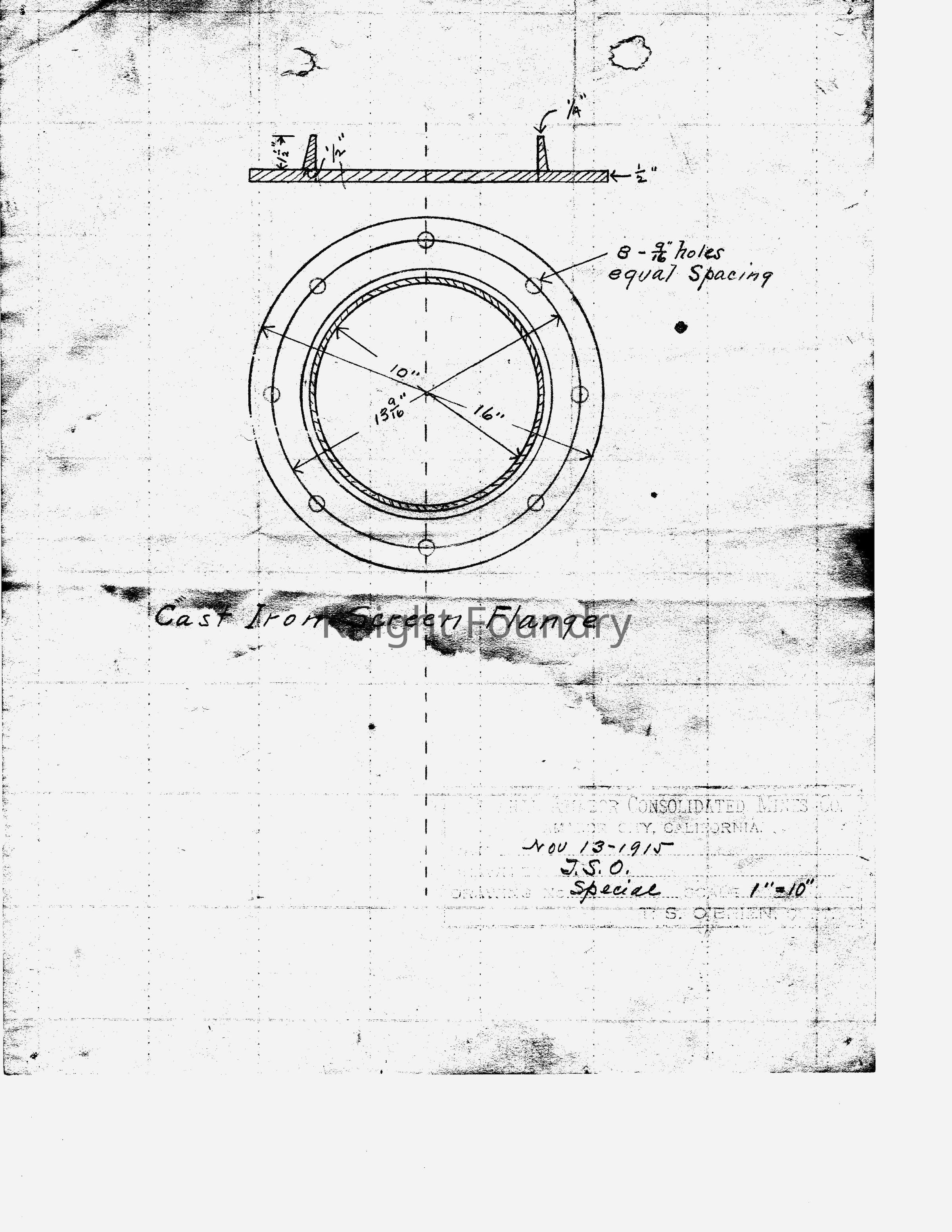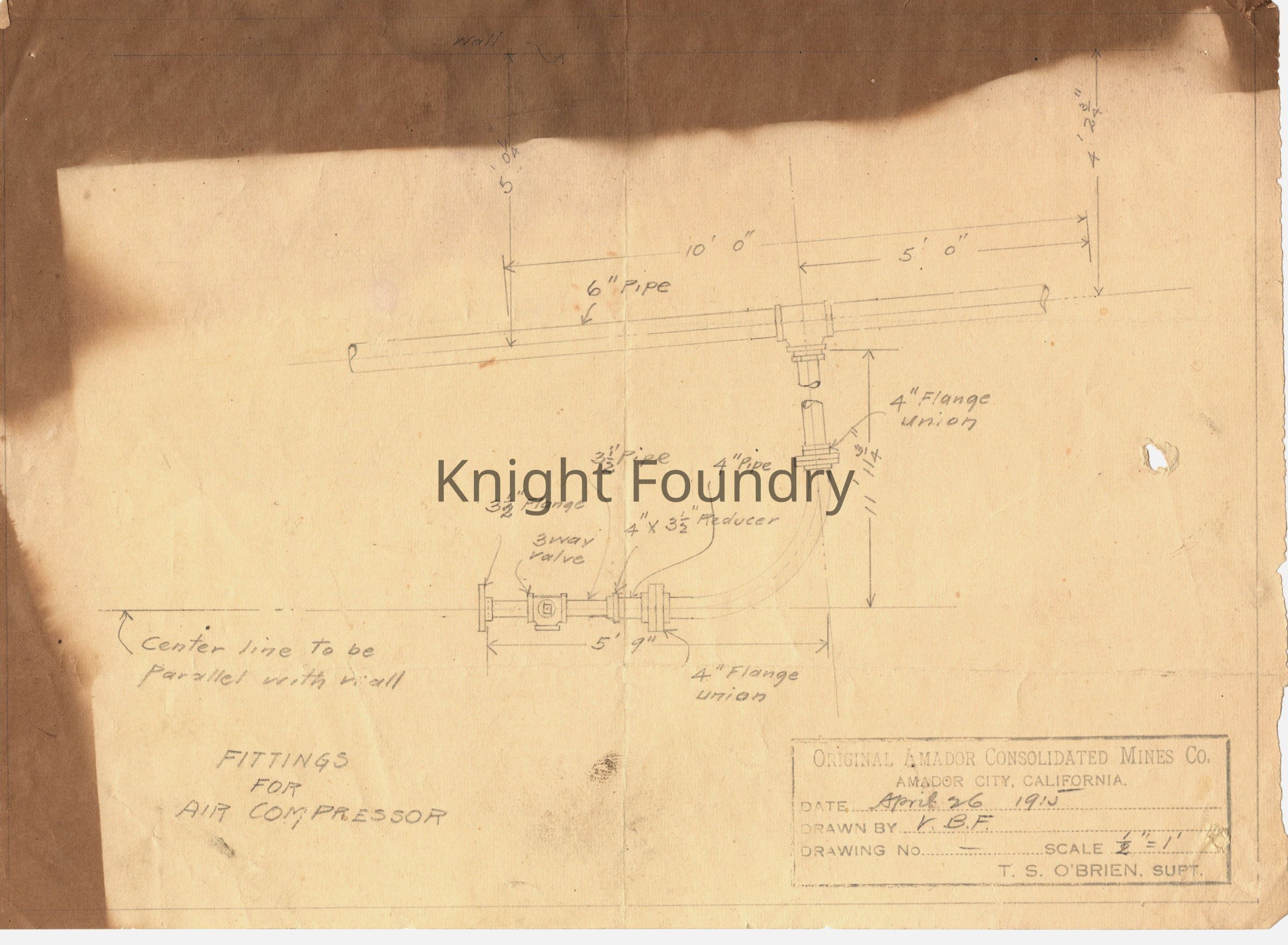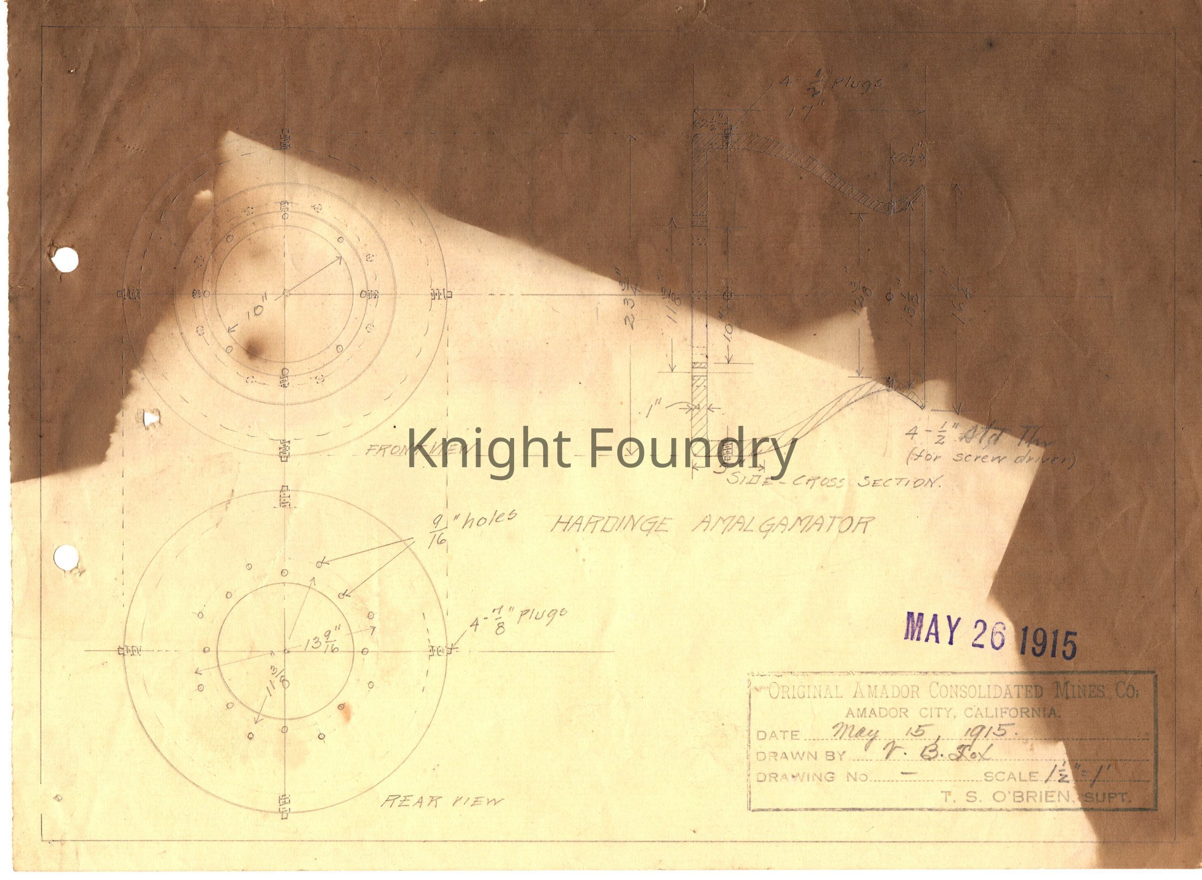 A group of 11 drawings by the Original Amador Consolidated Mines Company provided to The Knight Company for construction. Includes Hardinge amalgamator (sic), fittings for air compressor, a nose for a scoop feeder, eccentric shaft and a cast iron screen flange.Collection