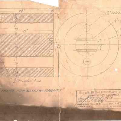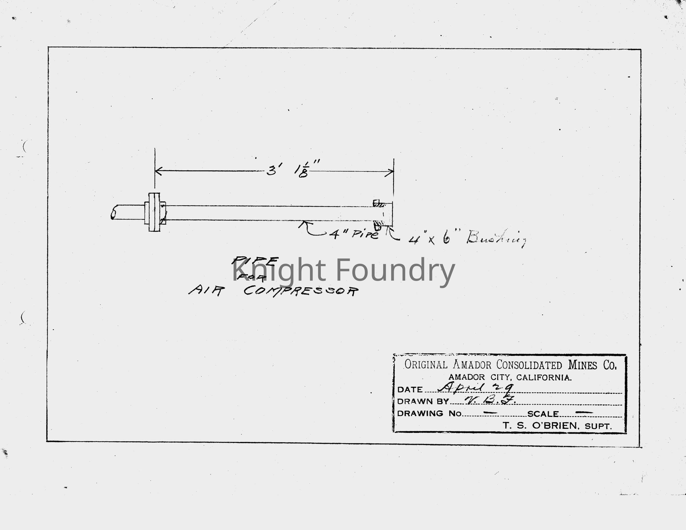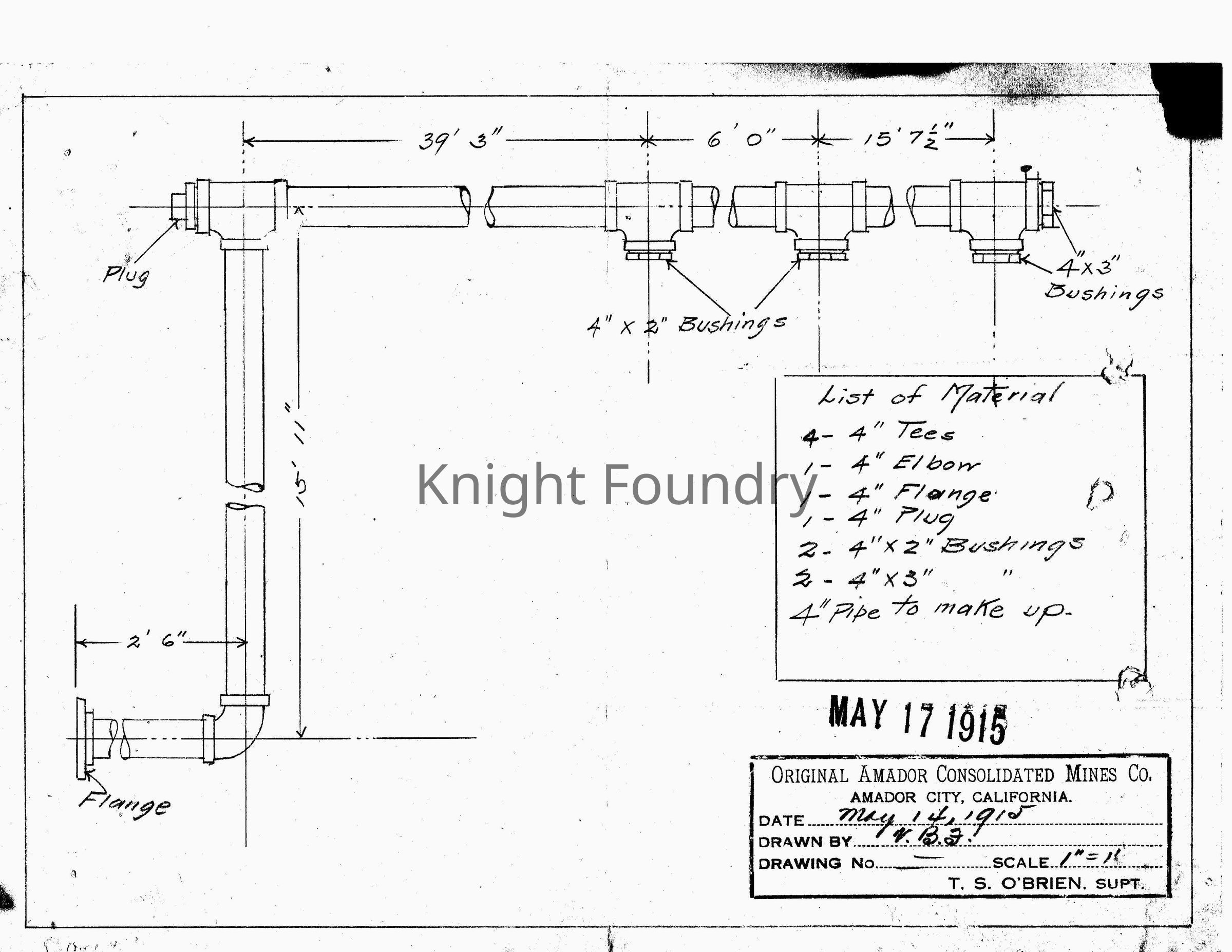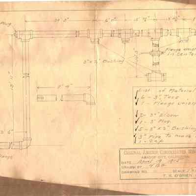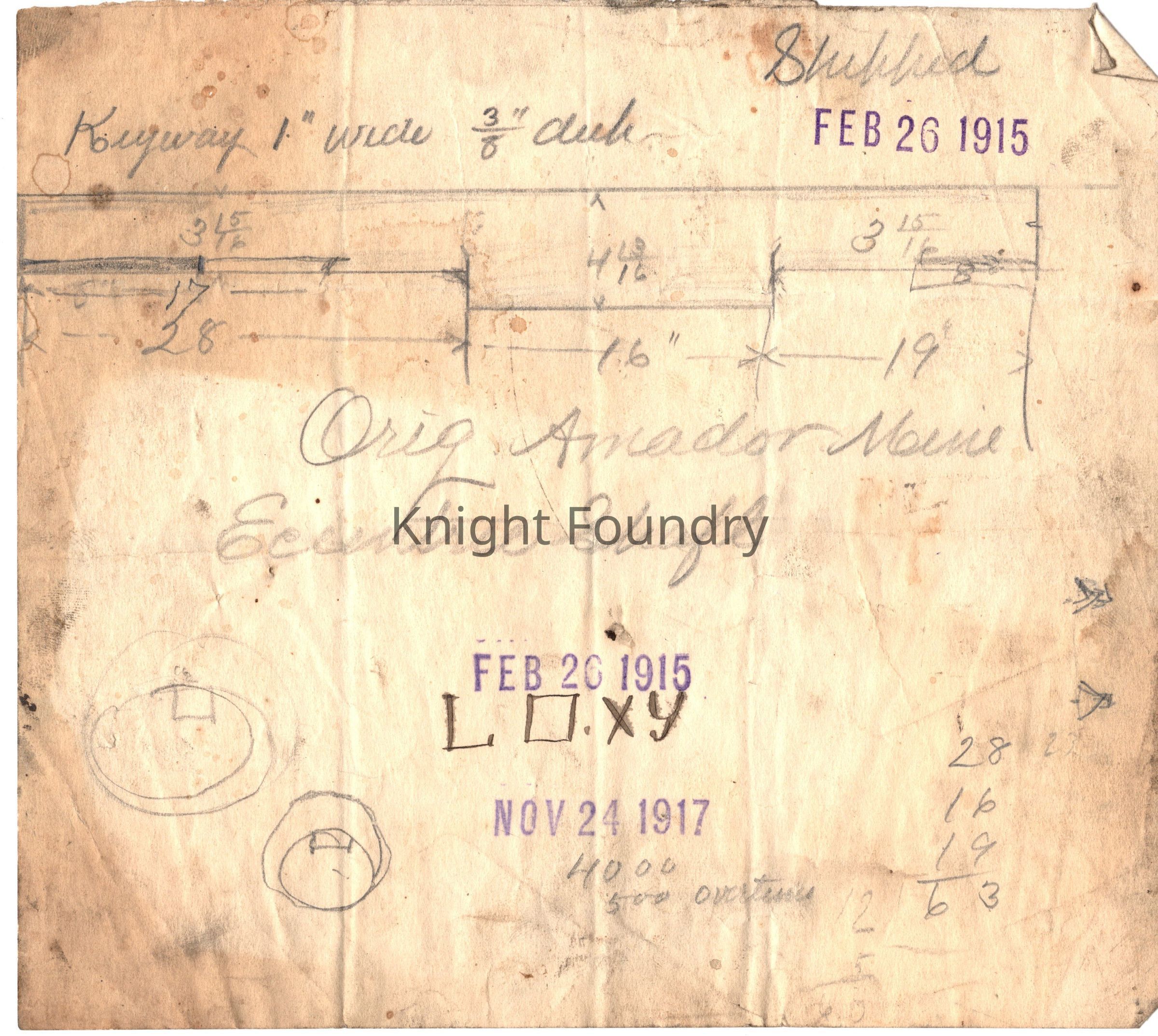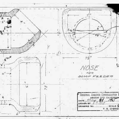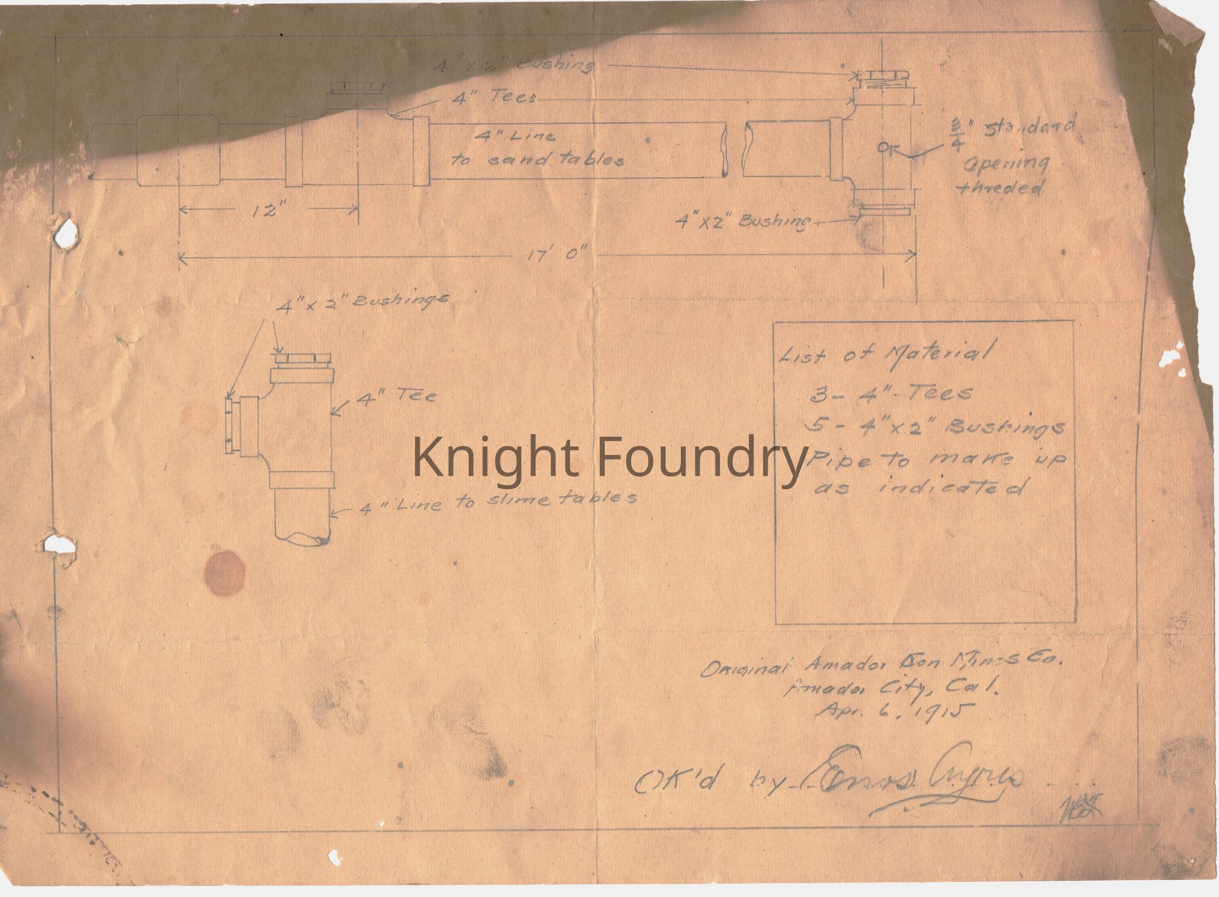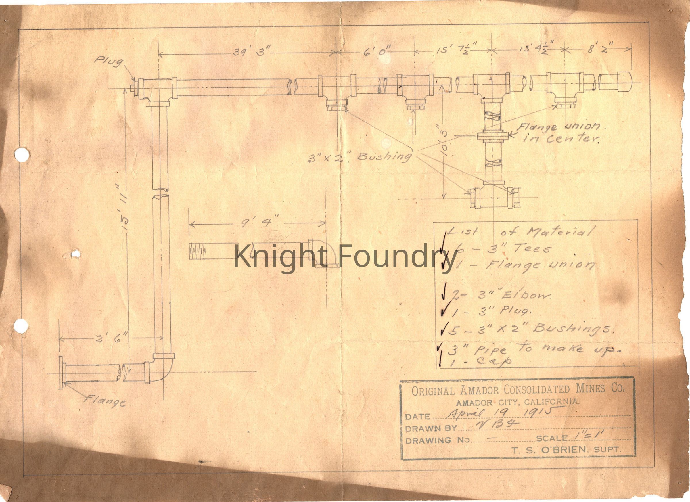 A group of 11 drawings by the Original Amador Consolidated Mines Company provided to The Knight Company for construction. Includes Hardinge amalgamator (sic), fittings for air compressor, a nose for a scoop feeder, eccentric shaft and a cast iron screen flange.Collection