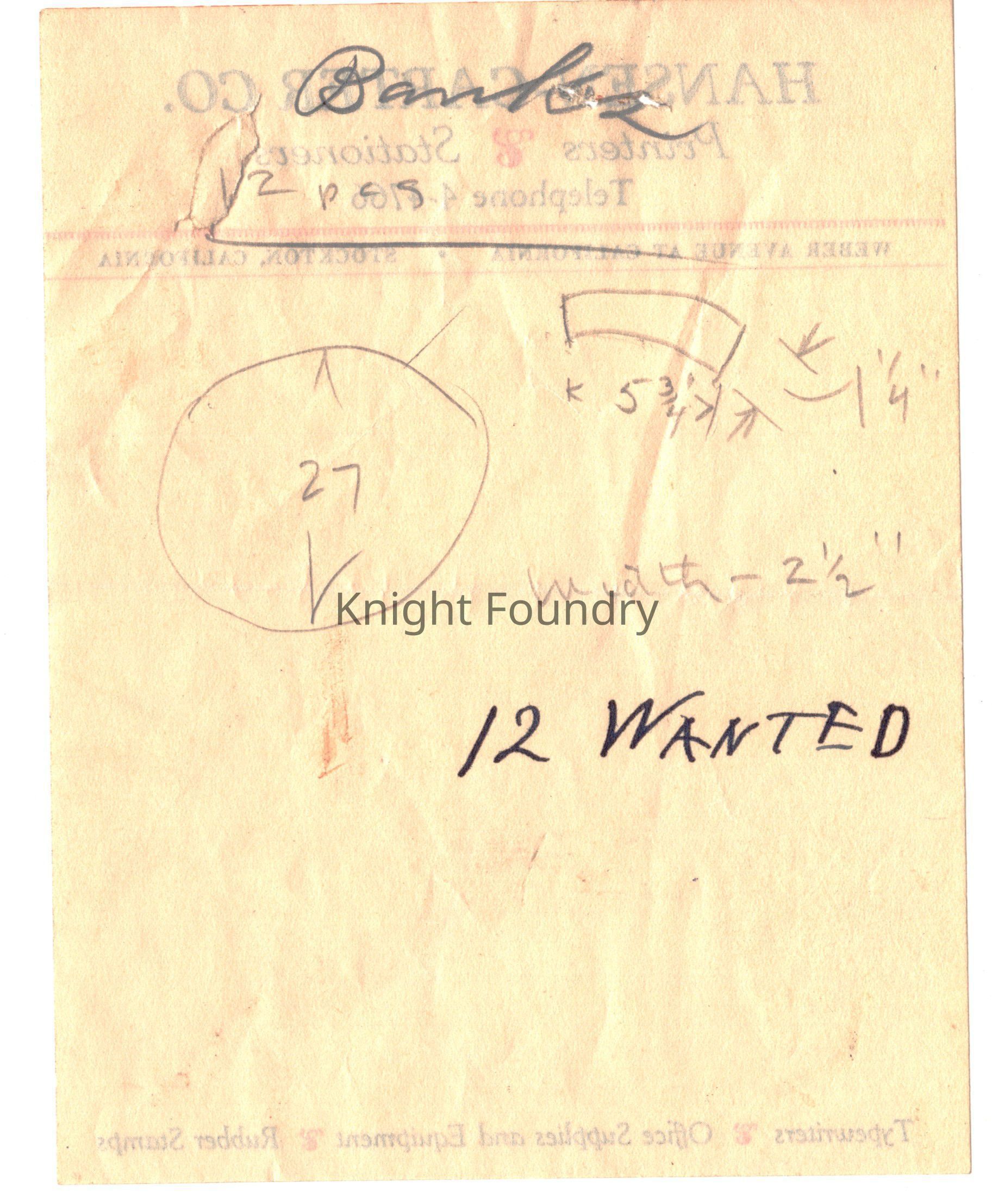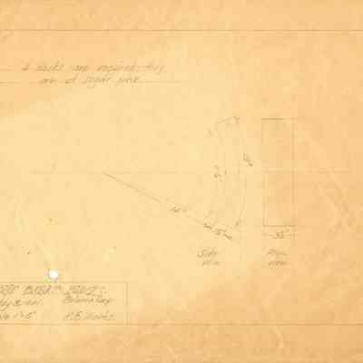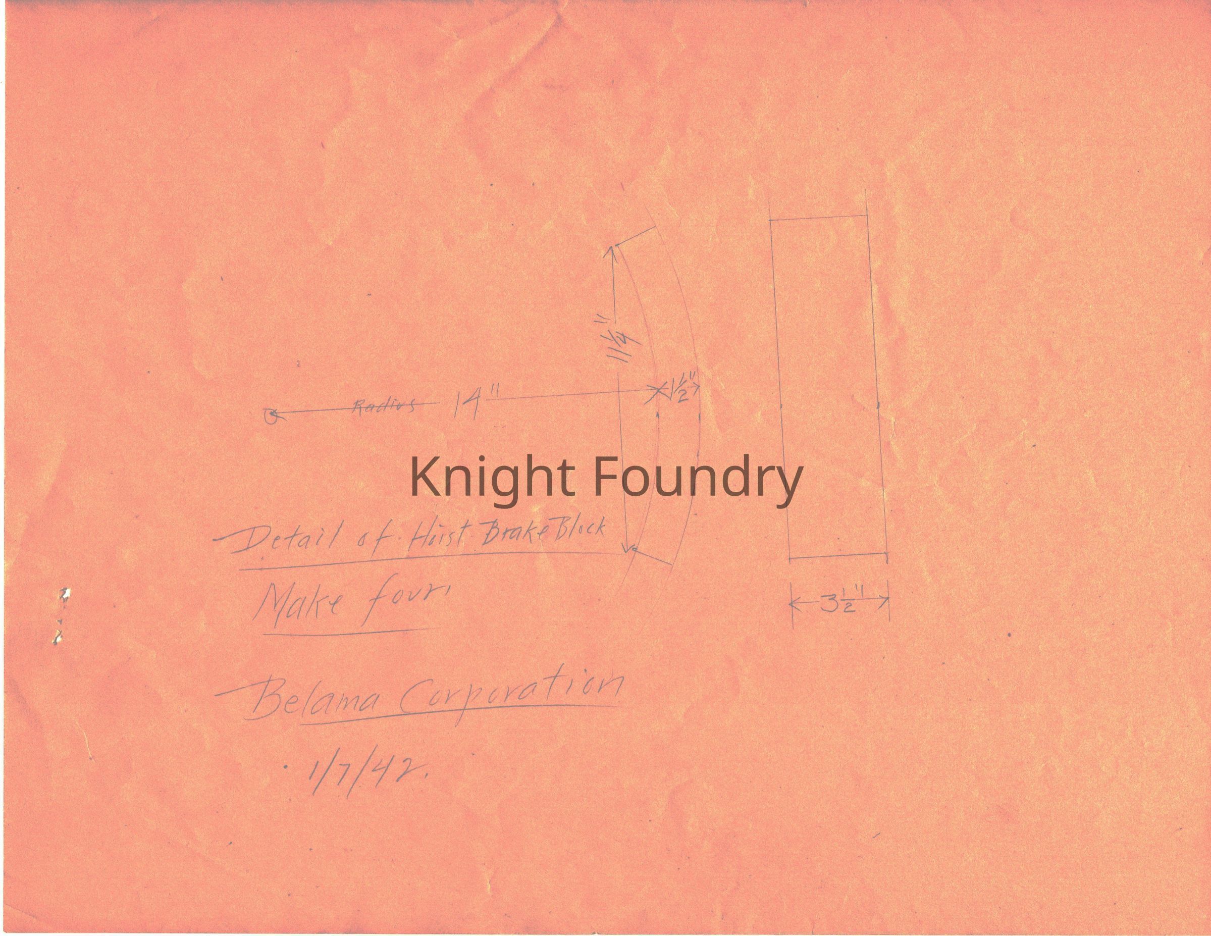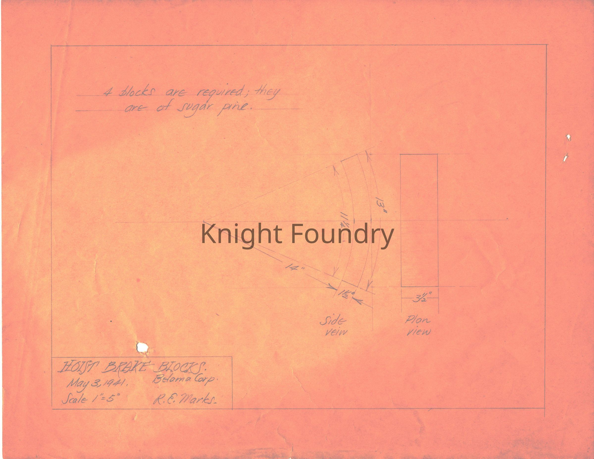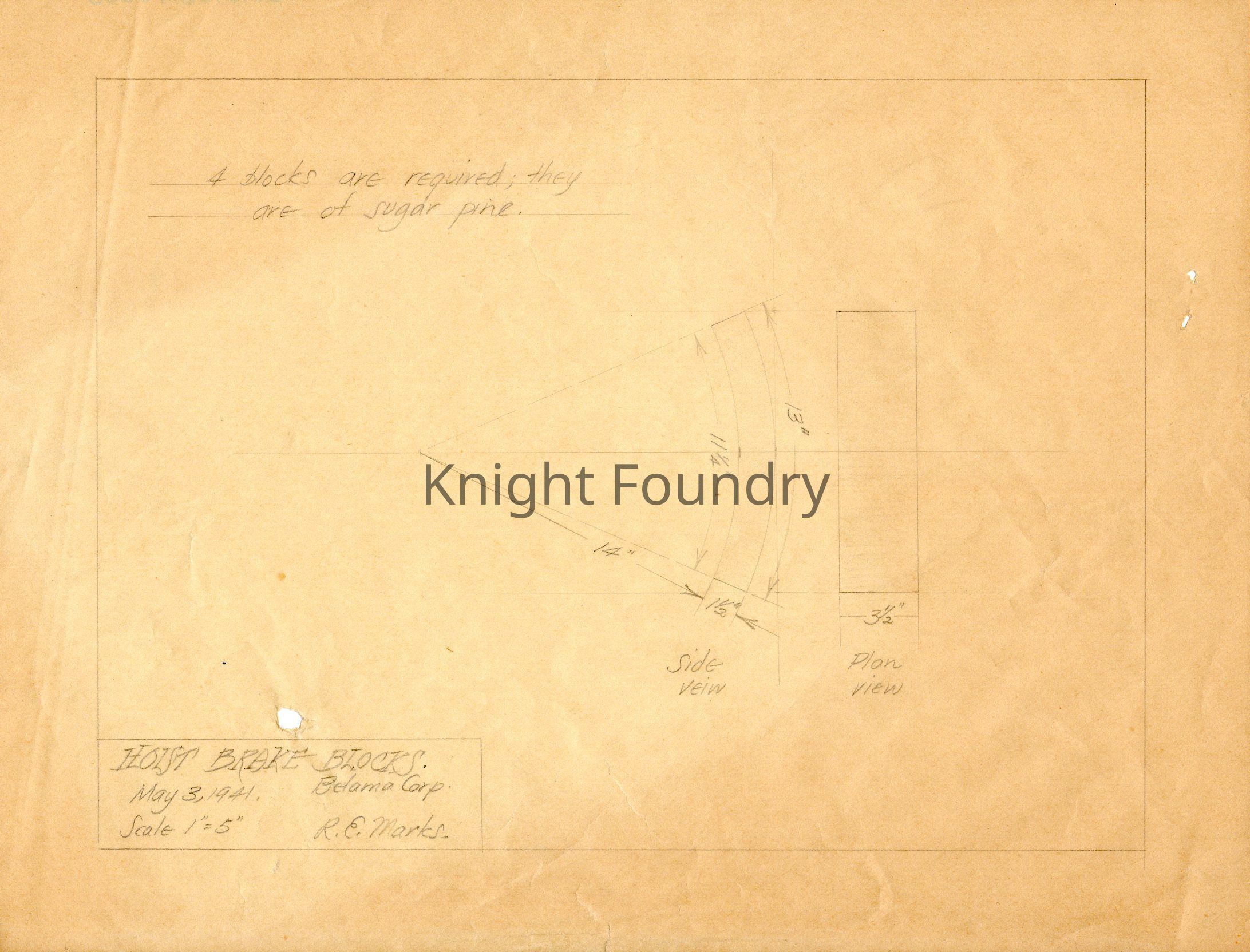 Three faint pencil drawings of hoist brake blocks for the Belama Corporation. One drawing notes "4 blocks are required; they are of sugar pine", dated May 3, 1941. Another drawing dated 1/7/42 notes "Detail of hoist brake block, make four". Third smaller paper was in group, appears to show hoist brake blocks also, notes "12 wanted".Collection
