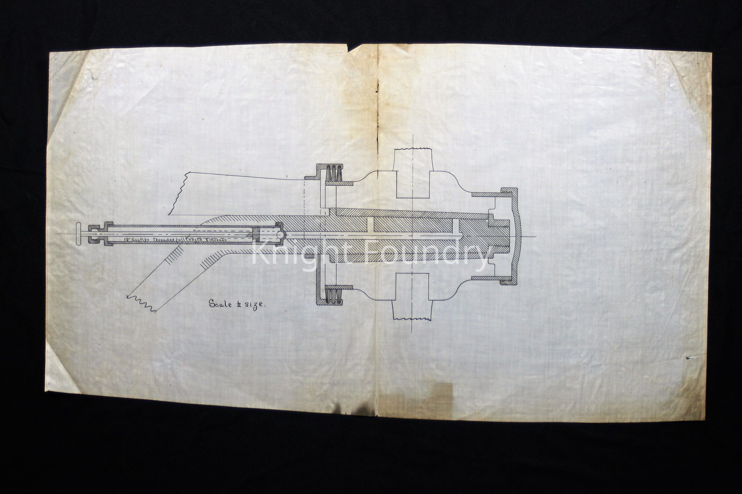 A drawing of a hub assembly with greasing piston. A label on the drawing reads "1 1/4" Gas Pipe Threaded full length, 8 threads". The scale is half the actual size.Collection