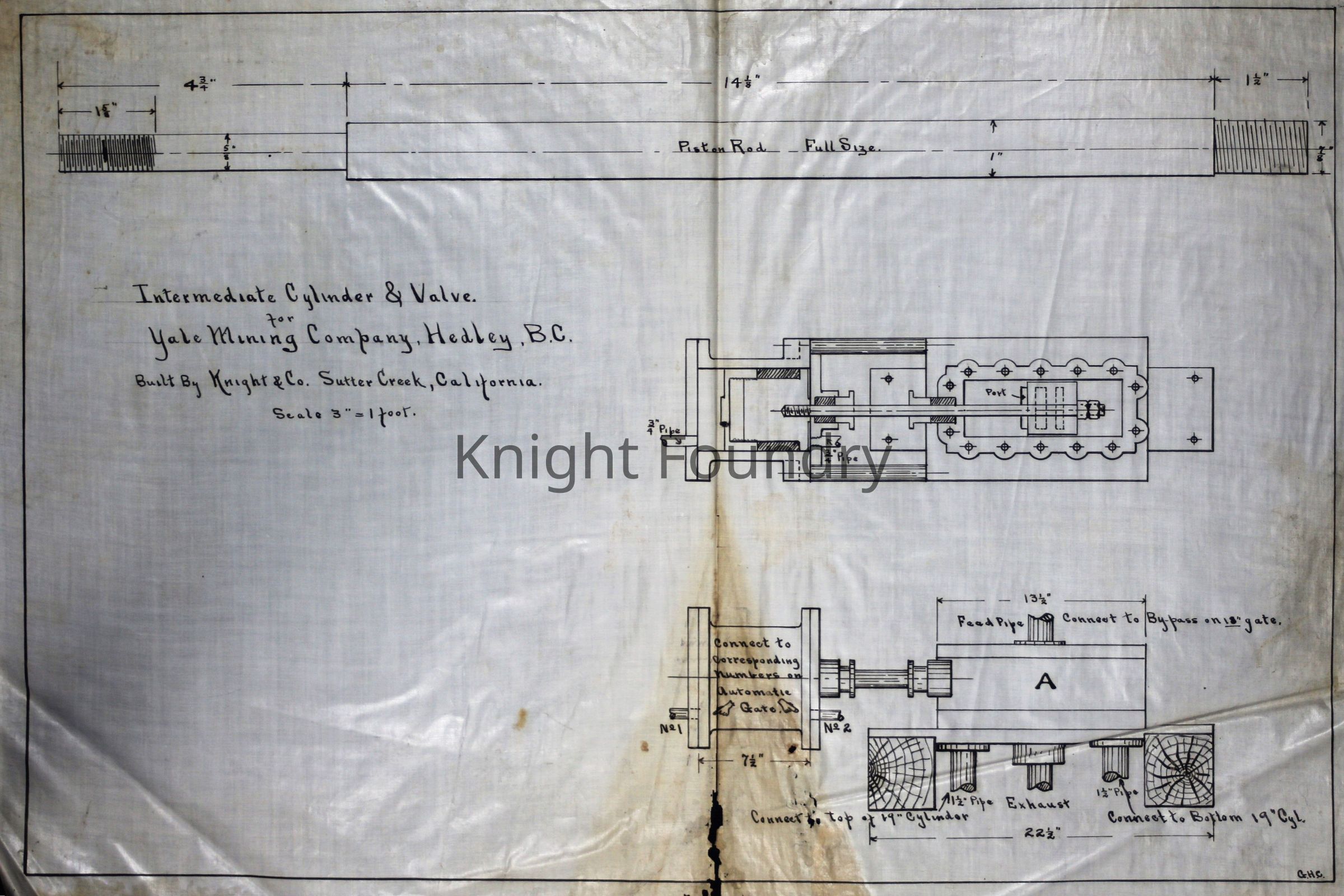 A drawing of an intermediate cylinder and valve produced for the Yale Mining Company in Hedley, British Columbia. Text on the drawing shows it was built by Knight and Company.Collection