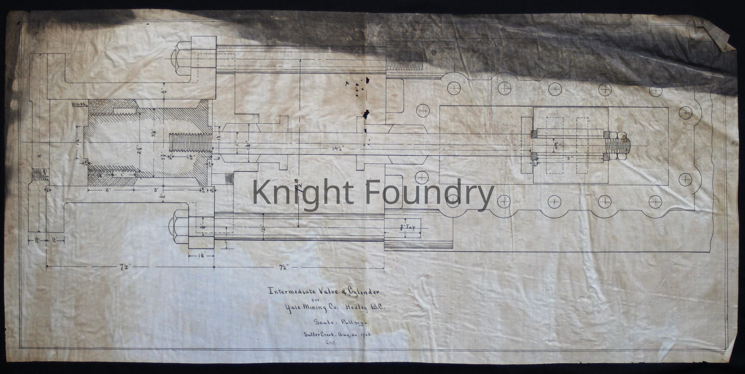 A drawing of an intermediate cylinder and valve produced for the Yale Mining Company in Hedley, British Columbia. Text on the drawing shows it was built by Knight and Company.Collection