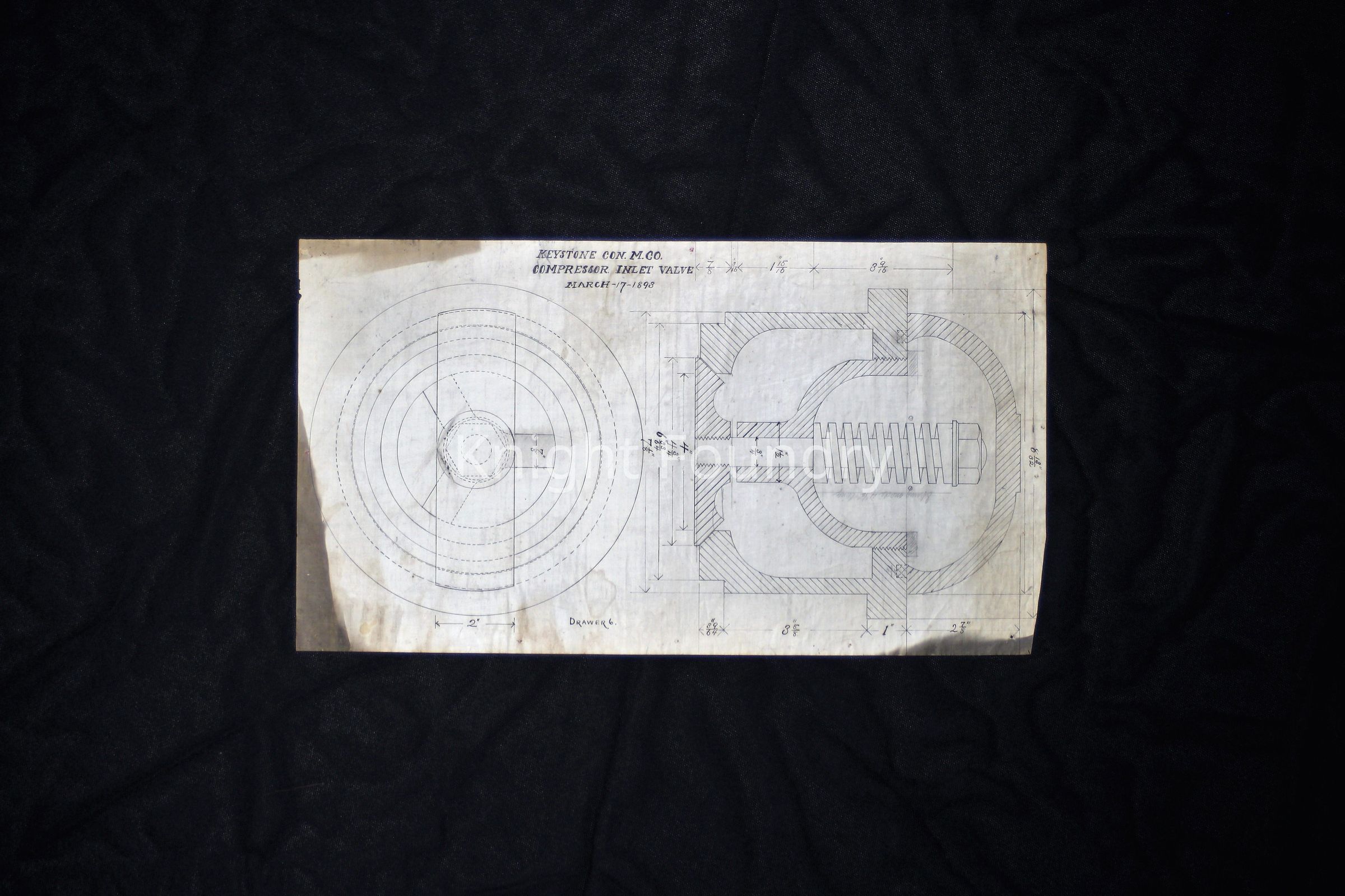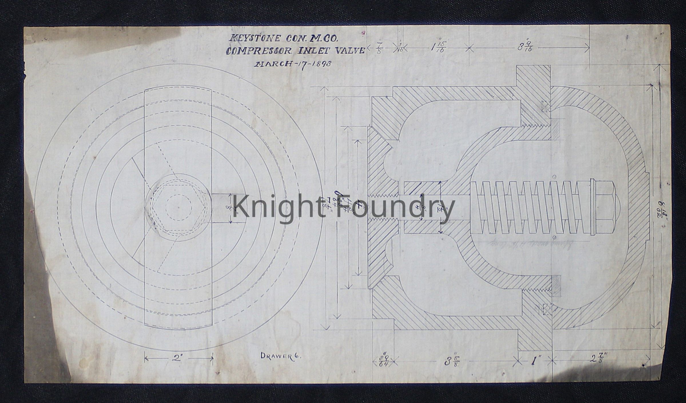 Drawing of a compressor inlet valve for the Keystone Consolidated Mining Company. The drawing is marked Drawer 6.Collection