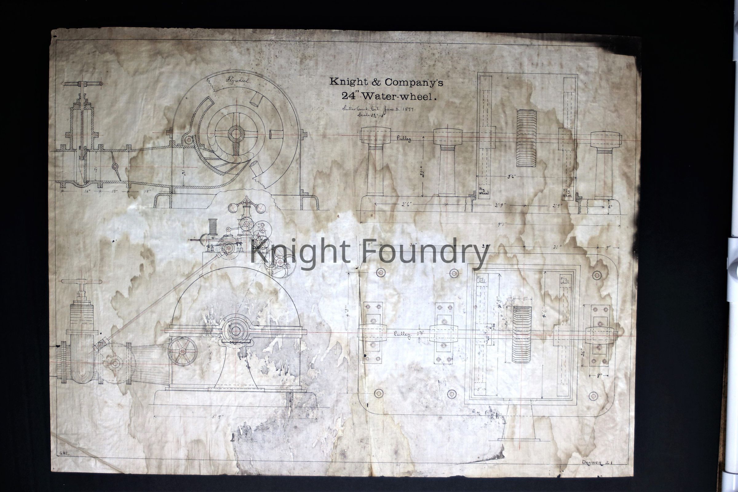 A drawing with 2 views of a 24 inch waterwheel produced by Knight and Company. The drawing is marked drawer 21.