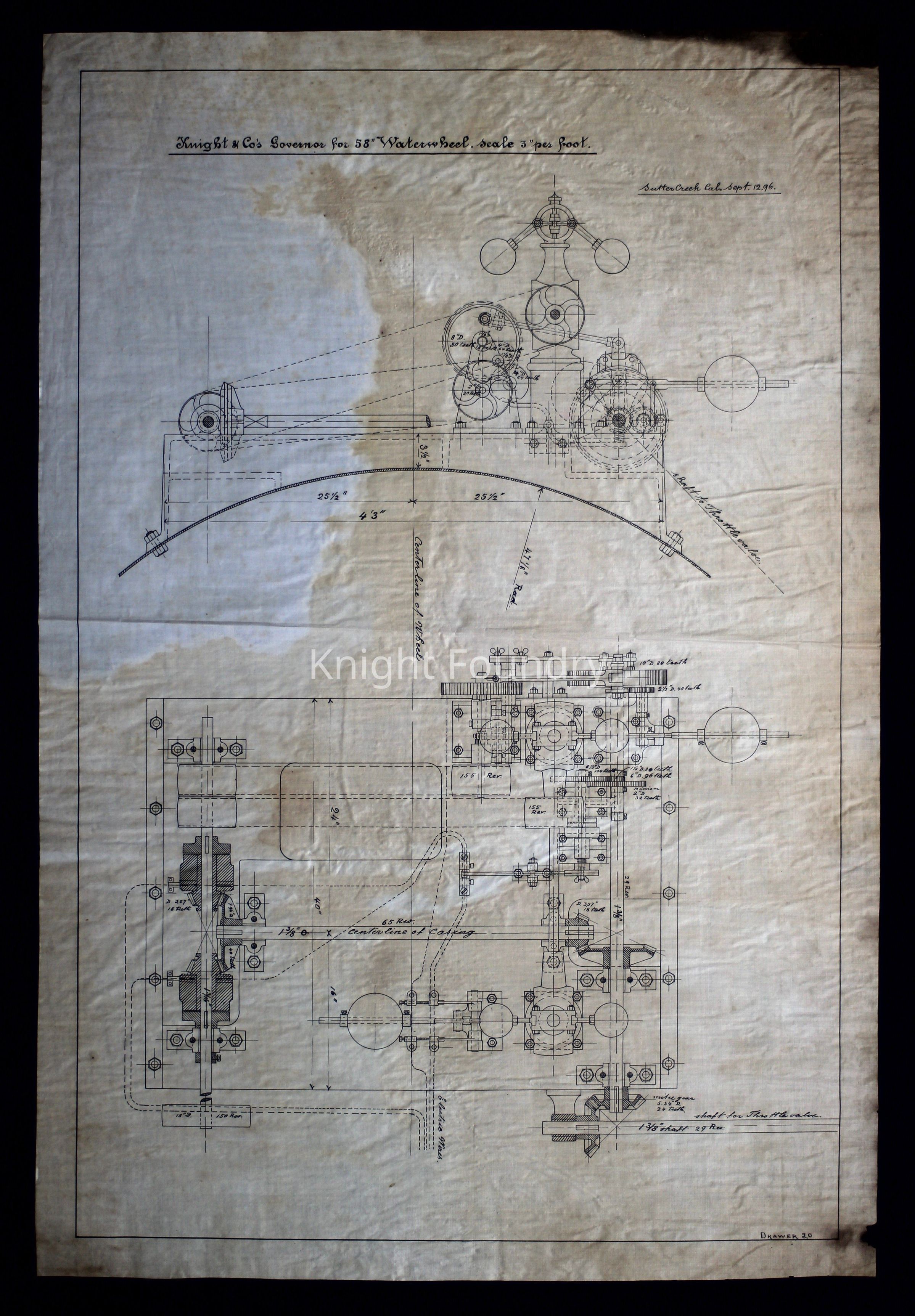 A drawing of a Knight and Company governor for a 58 inch waterwheel. The scale is 3 inches equals 1 foot. The drawing is marked drawer 20 and Sutter Creek.