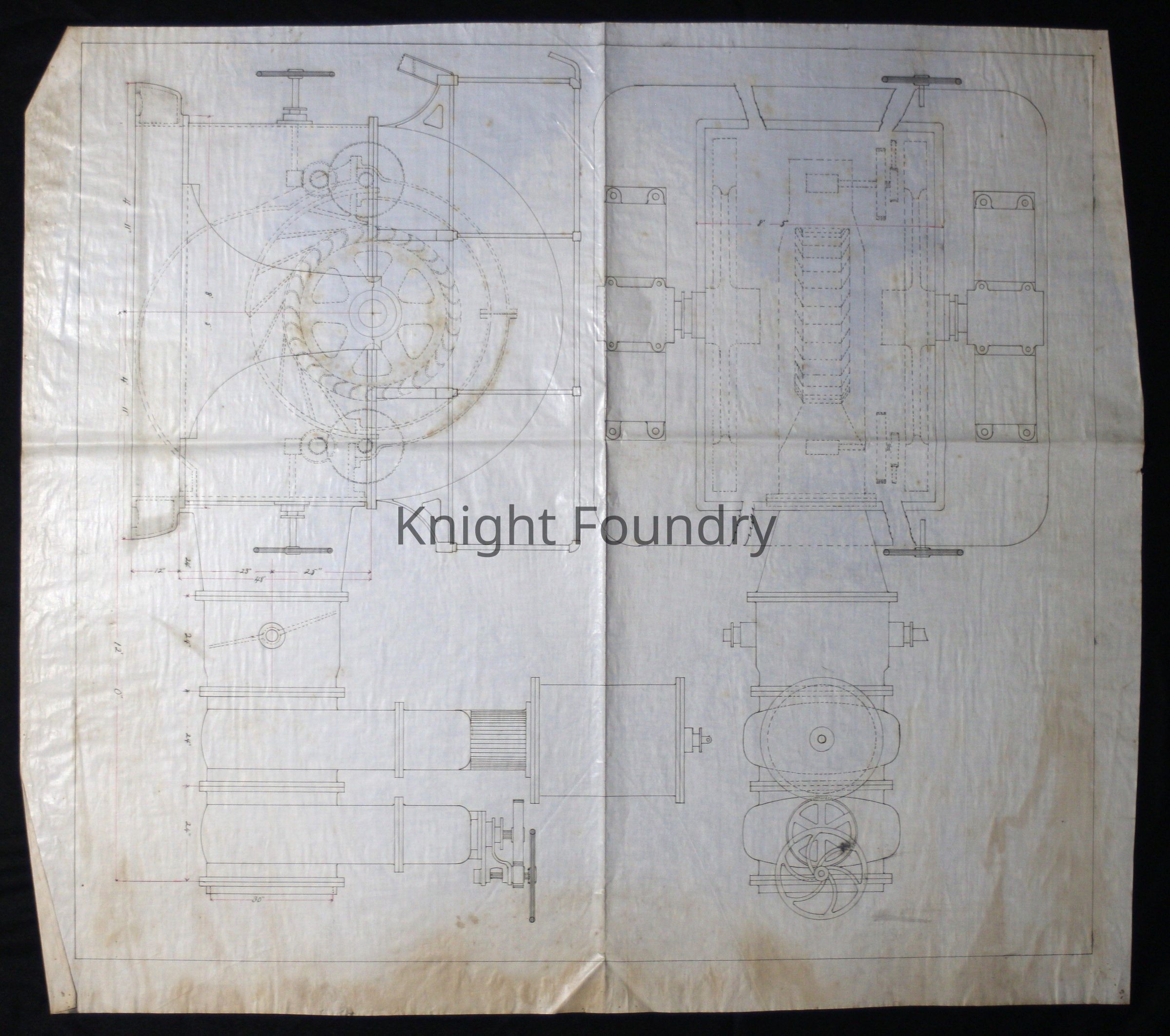 A drawing of a Knight waterwheel shown with two views.