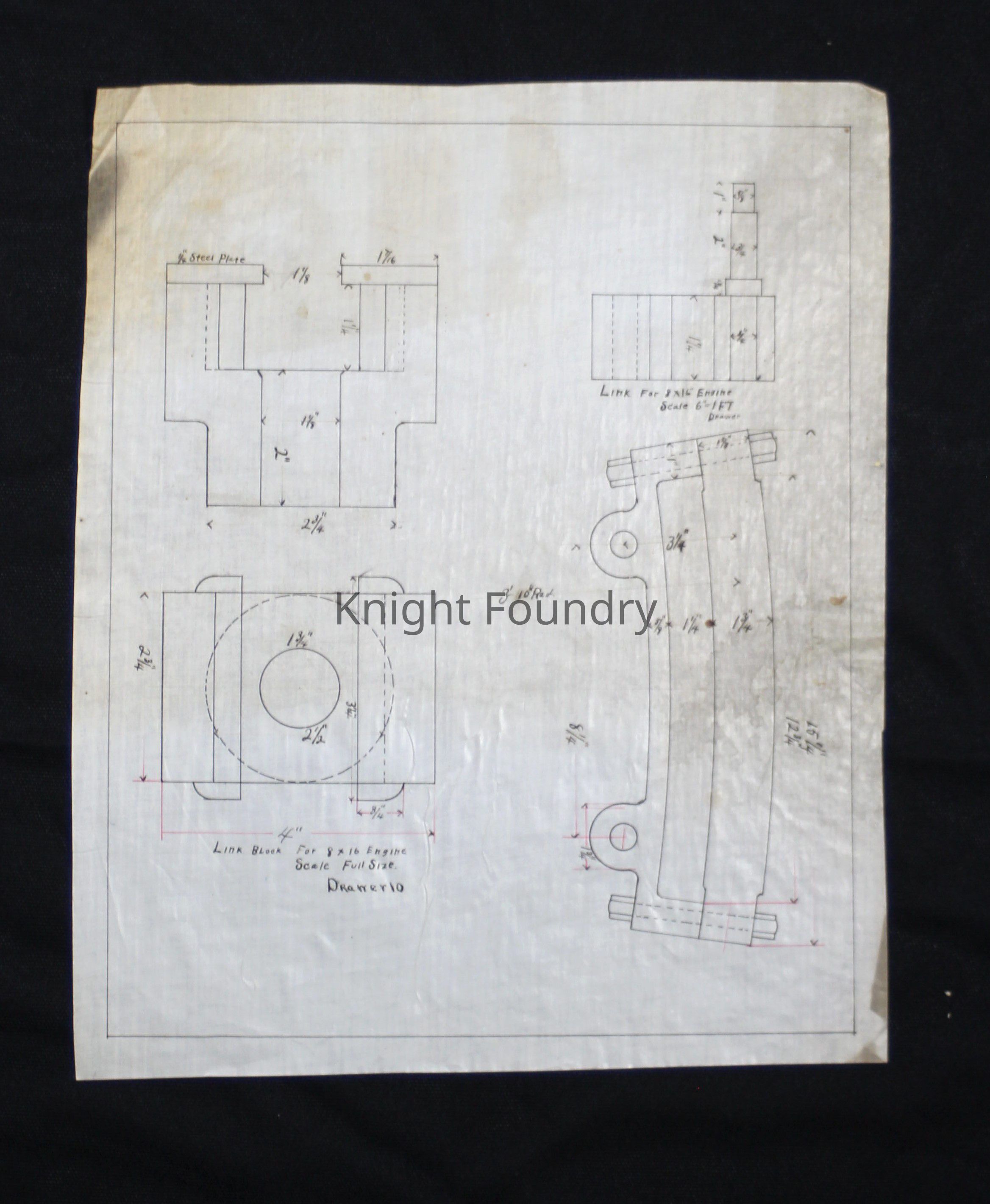 Drawing of a link block for an 8 x 16 Engine. The link block scale on the left is full size and on the right it is 6 inches equals 1 foot. The drawing is marked drawer 10.Collection