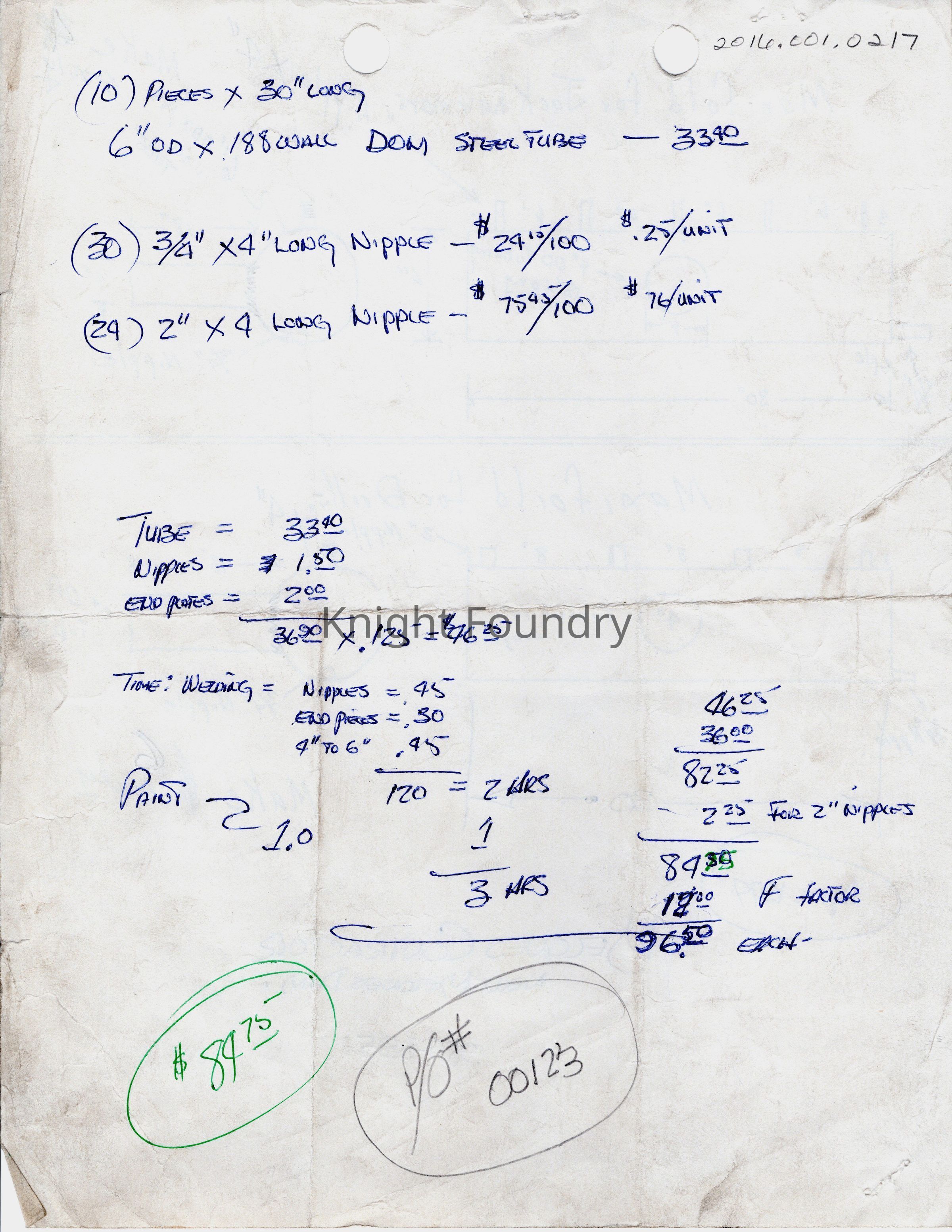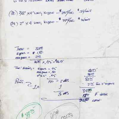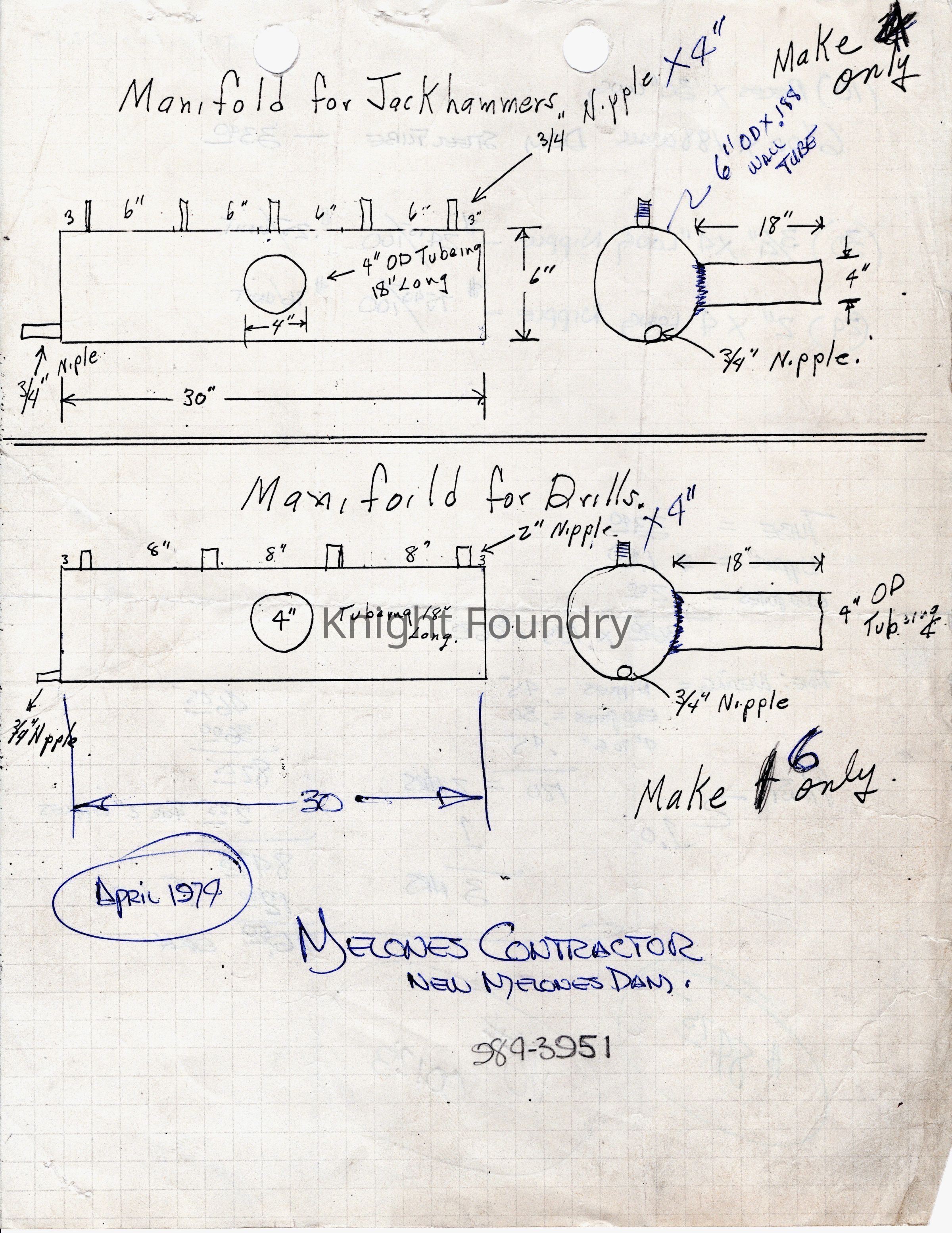 Drawings for the New Melones Dam. Front: drawings of a manifold for jackhammers and a manifold for drills showing measurements for both manifolds and nipples. Back: notes specifications and quantities for steel tubes and the nipples and the details of the project expense. P/O# 00123 and $84.75.Collection