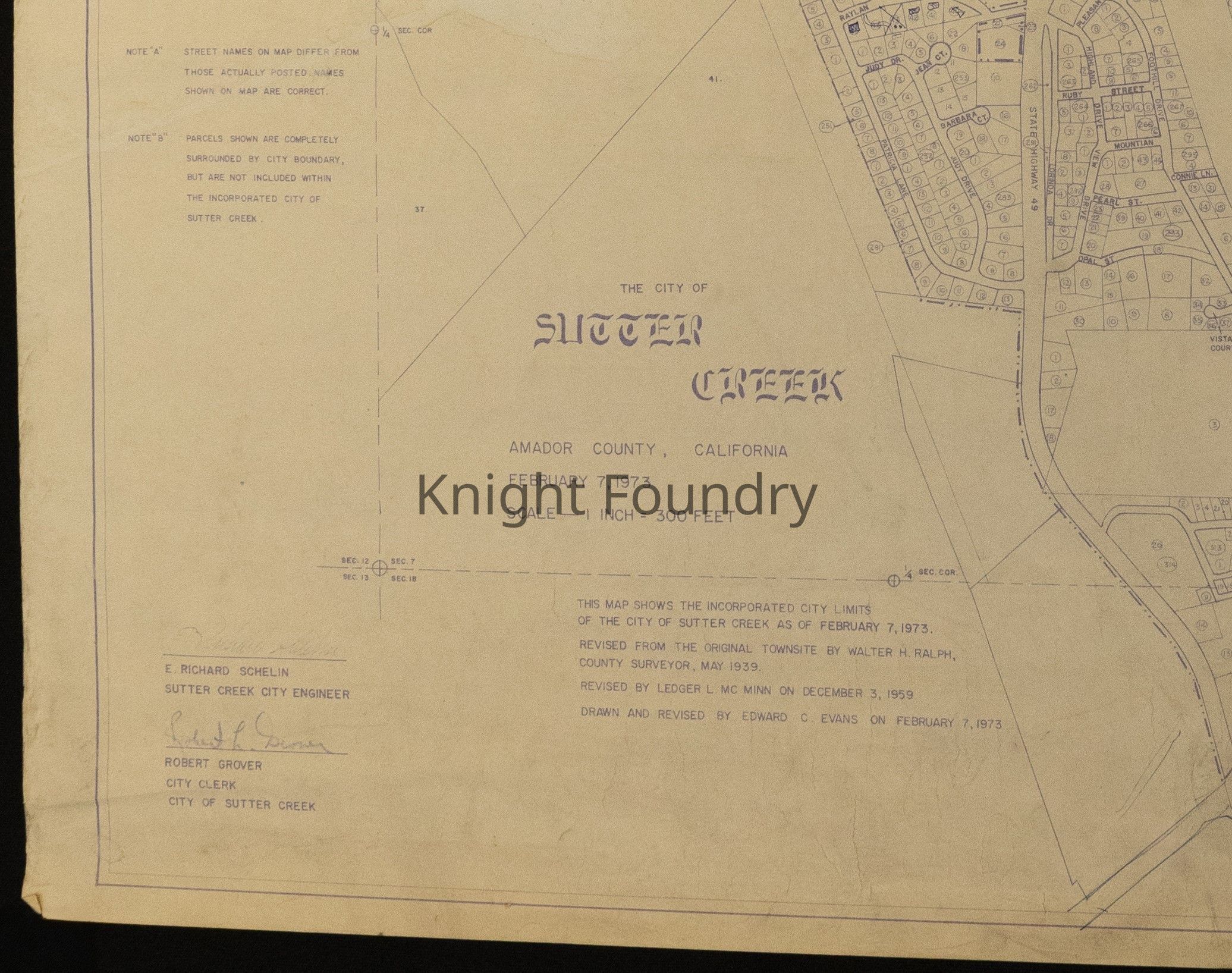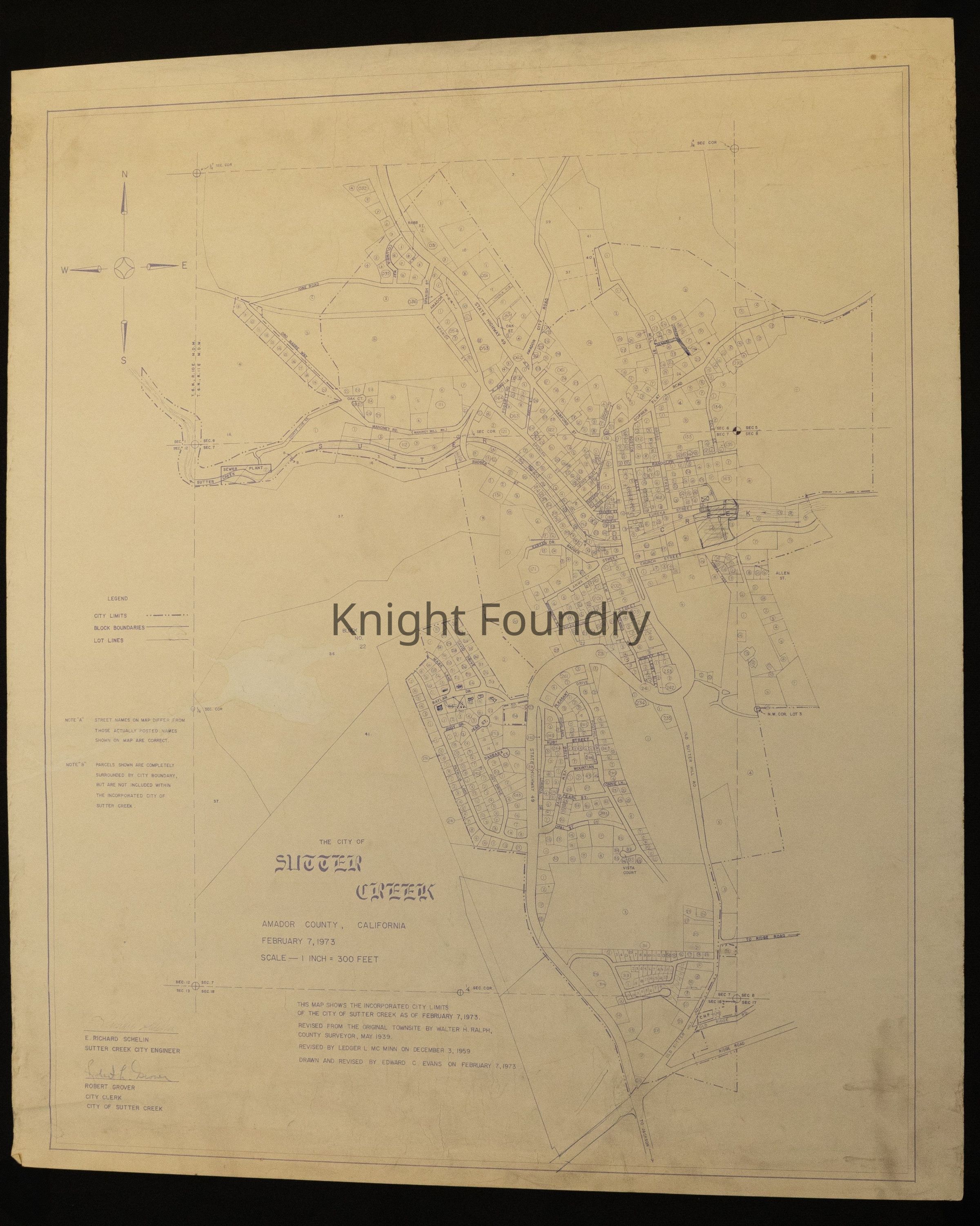 Townsite map of the City of Sutter Creek, the second revision since the townsite was mapped in 1939-05. The map has ink additions to the Knight Foundry site, Marre Street and Rylan Drive were marked in ink.Collection