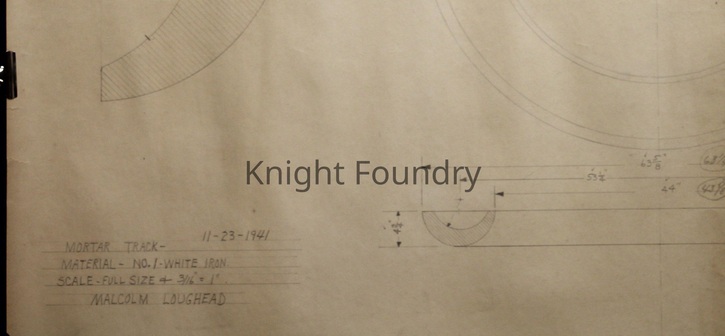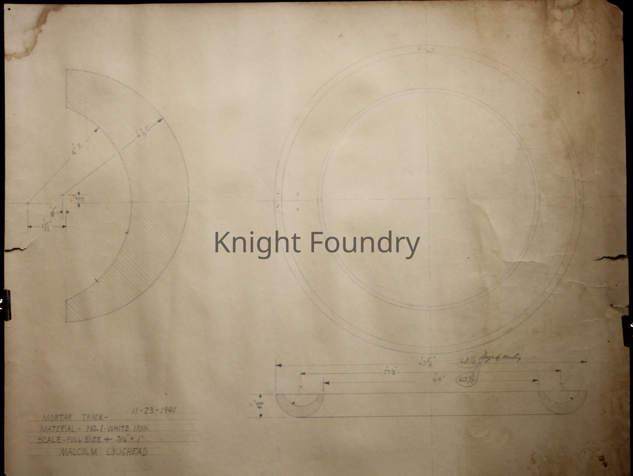 Details for a mortar track made of No. 1 White iron. Drawing states the scale is full size and 3/16 equals 1 inch. Malcolm Loughead was later known as Malcolm Lockheed and founded the company that went on to become the Lockheed CorporationArtwork Details