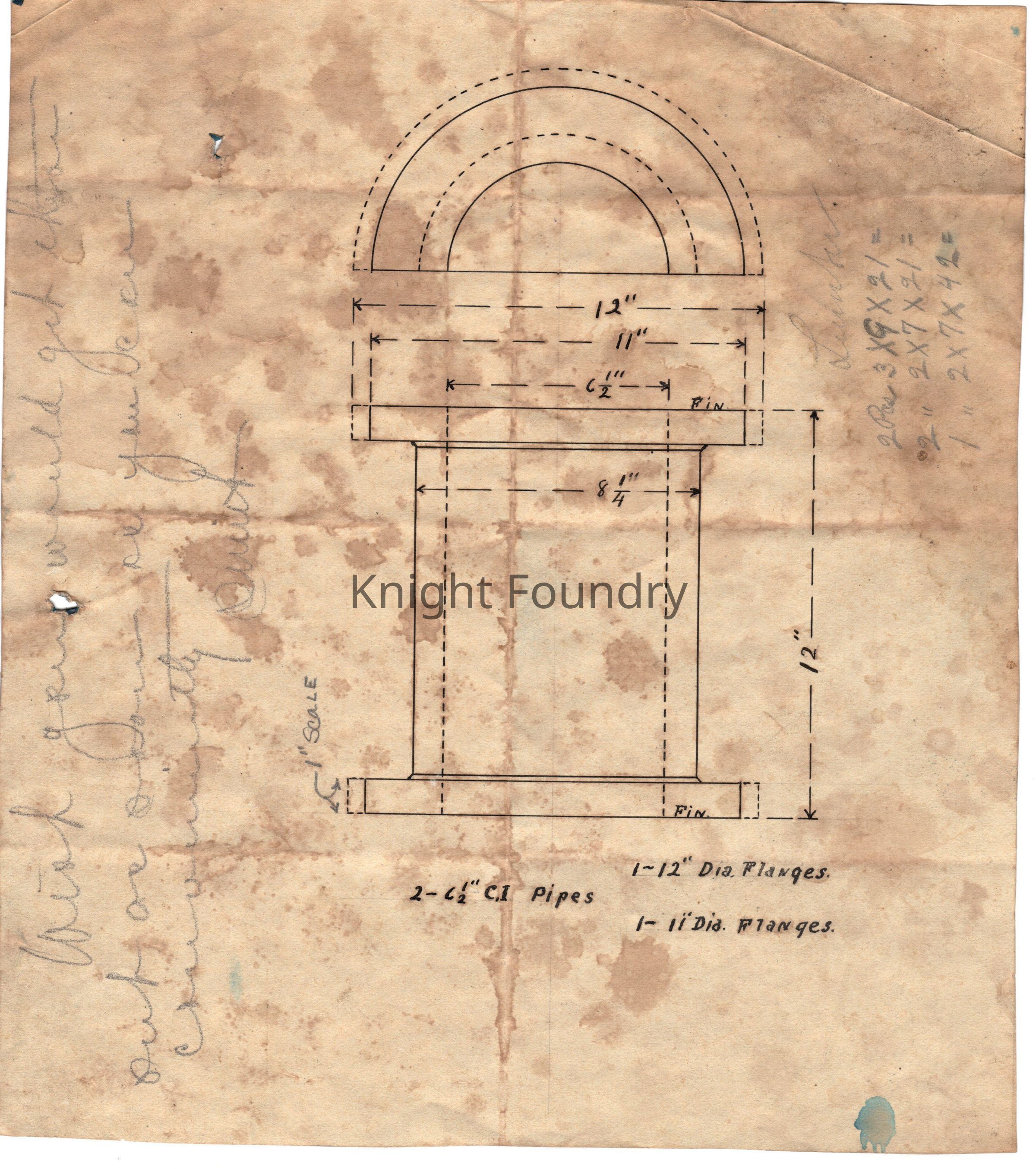 Drawing of a part that has 2 6 1/2 inch cast iron pipes, one 12 inch flange and one 11 inch flange. Drawing has note "Wish you would get these out as soon as you can conveniently." Signature with illegible.Collection