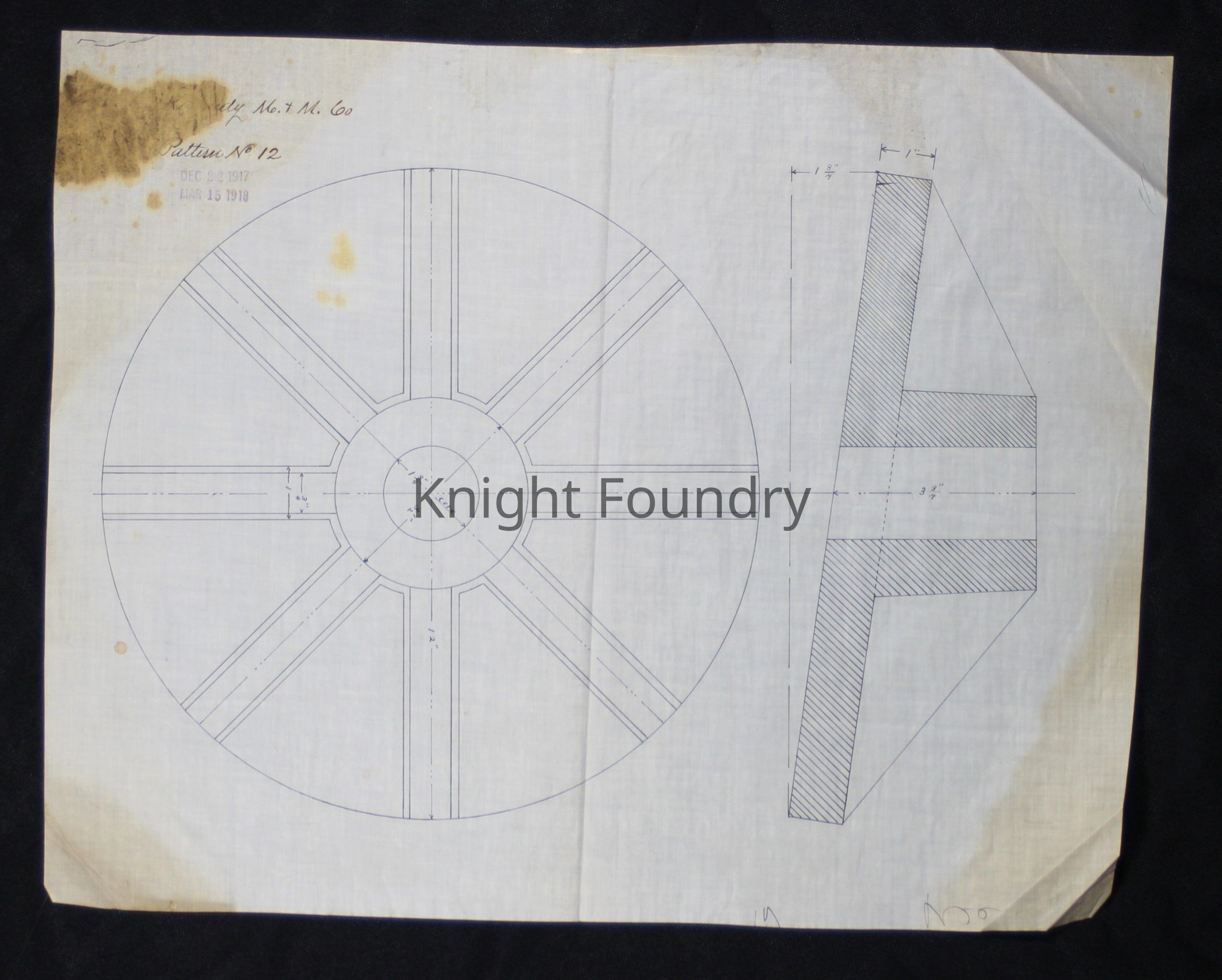 Drawing of 2 views of a pattern for a slanted wheel hub and spokes for the Kennedy Mine and Milling Company.Collection