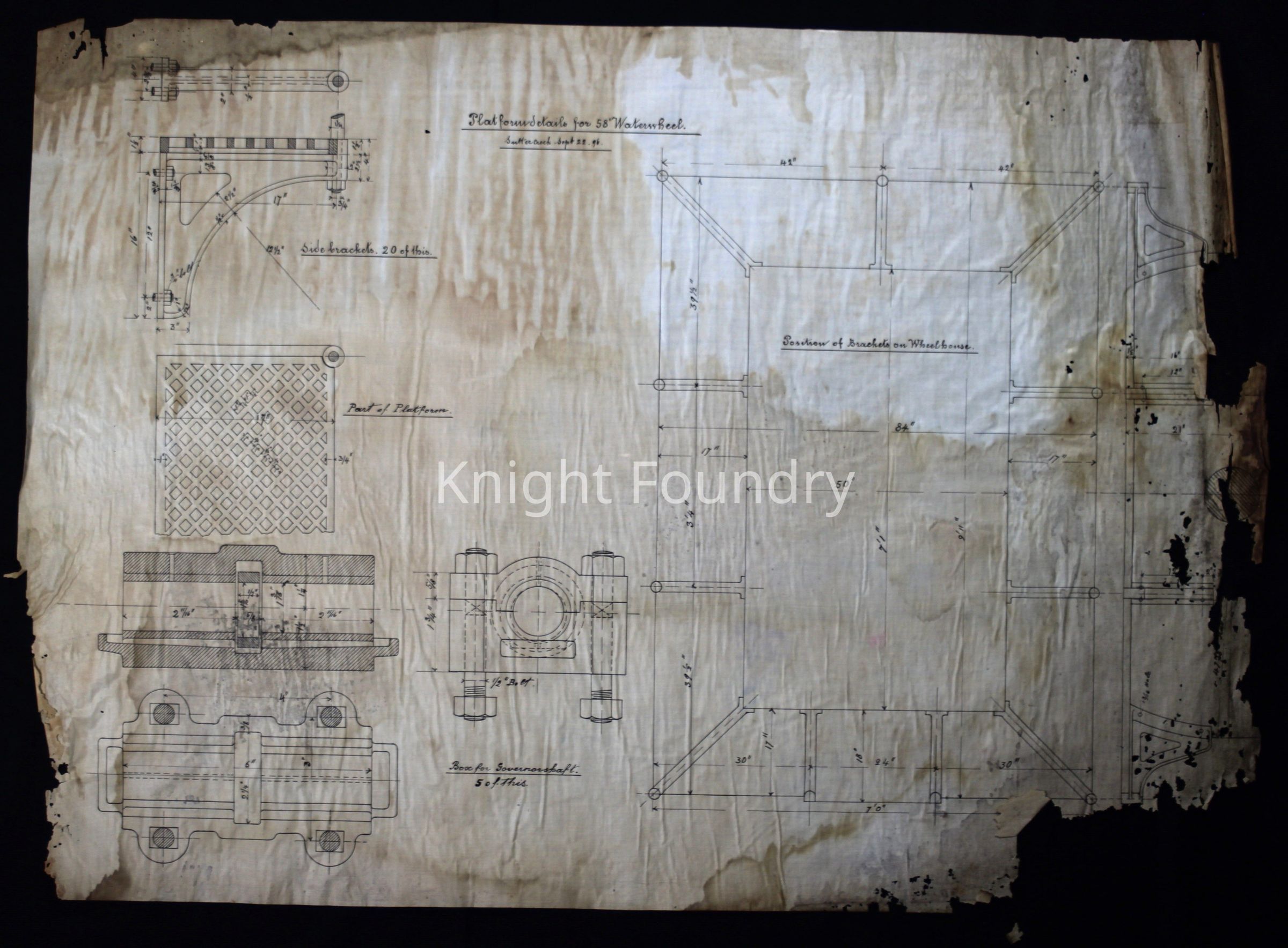 Drawing of a platform designed for a 58 inch water wheel including part of the platform, a box for the governor shaft and the position of the brackets on wheelhouse. Sutter Creek, September 22, 1896.Collection