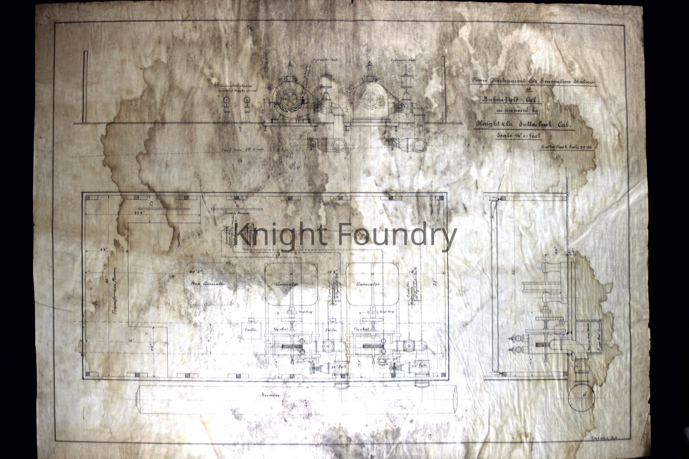 A drawing for the Power Development Company Generation Station in Bakersfield, California as proposed by Knight & Co., Sutter Creek, Cal. on July, 29, 1896. The drawing includes floor plan and elevations and notes Drawer 21.Collection