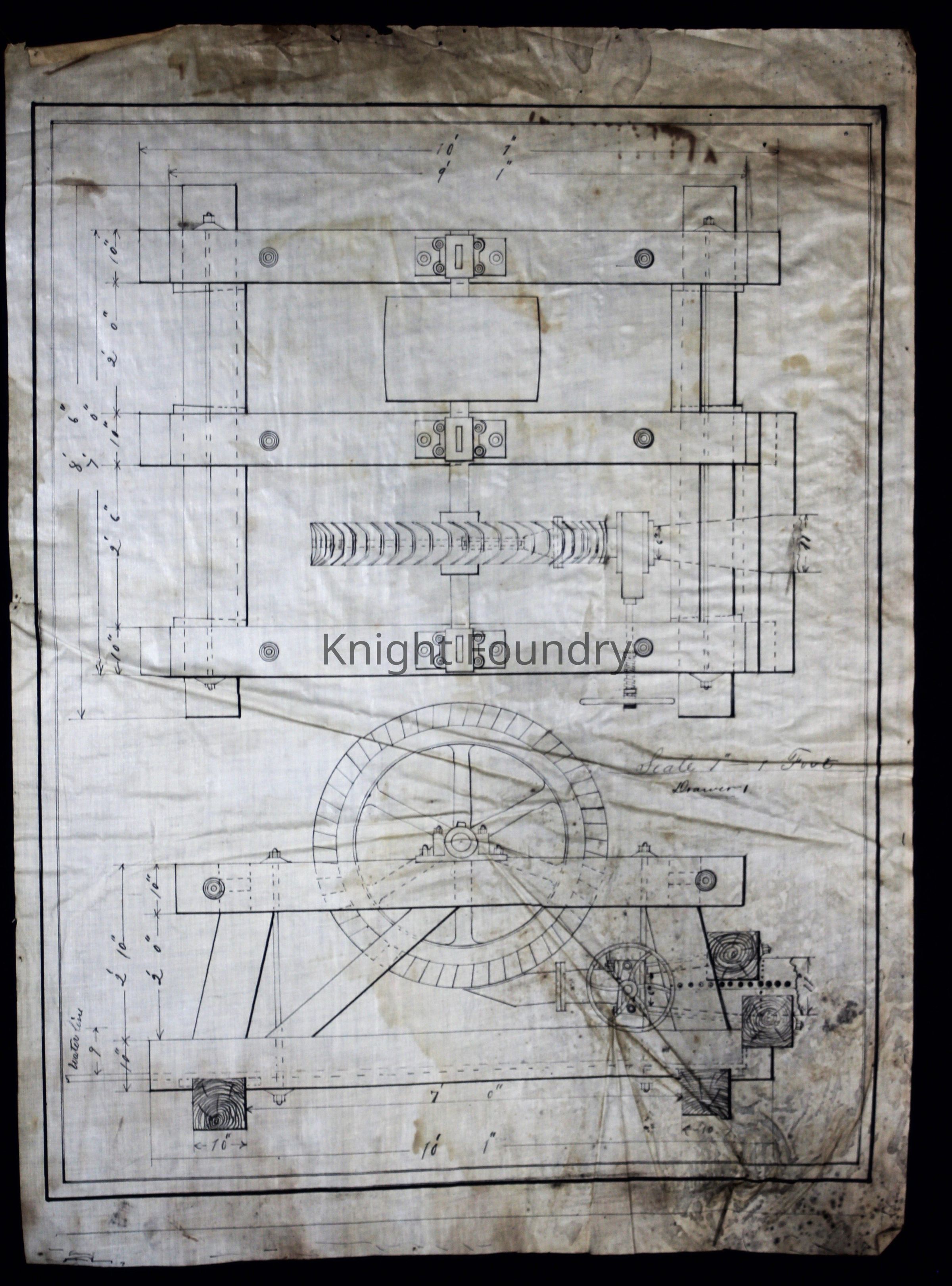 Drawing of 4 1/2 foot Knight water wheel and framework. It appears to be a preliminary drawing for 2016.001.0006. The scale is 1 inch equals 1 foot. The drawing is marked Drawer 1.