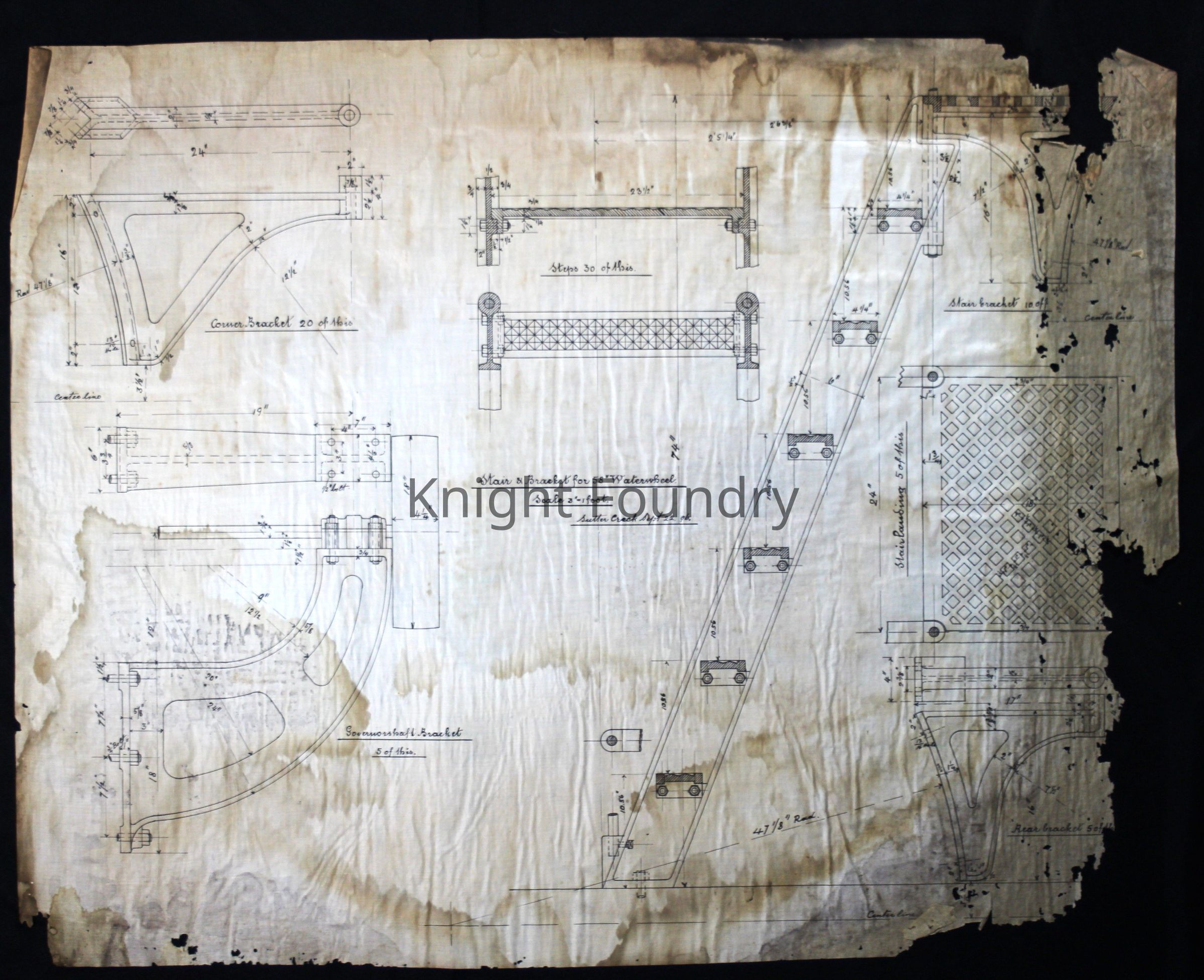 Drawing of stair and brackets designed for use by a 58 inch" waterwheel.