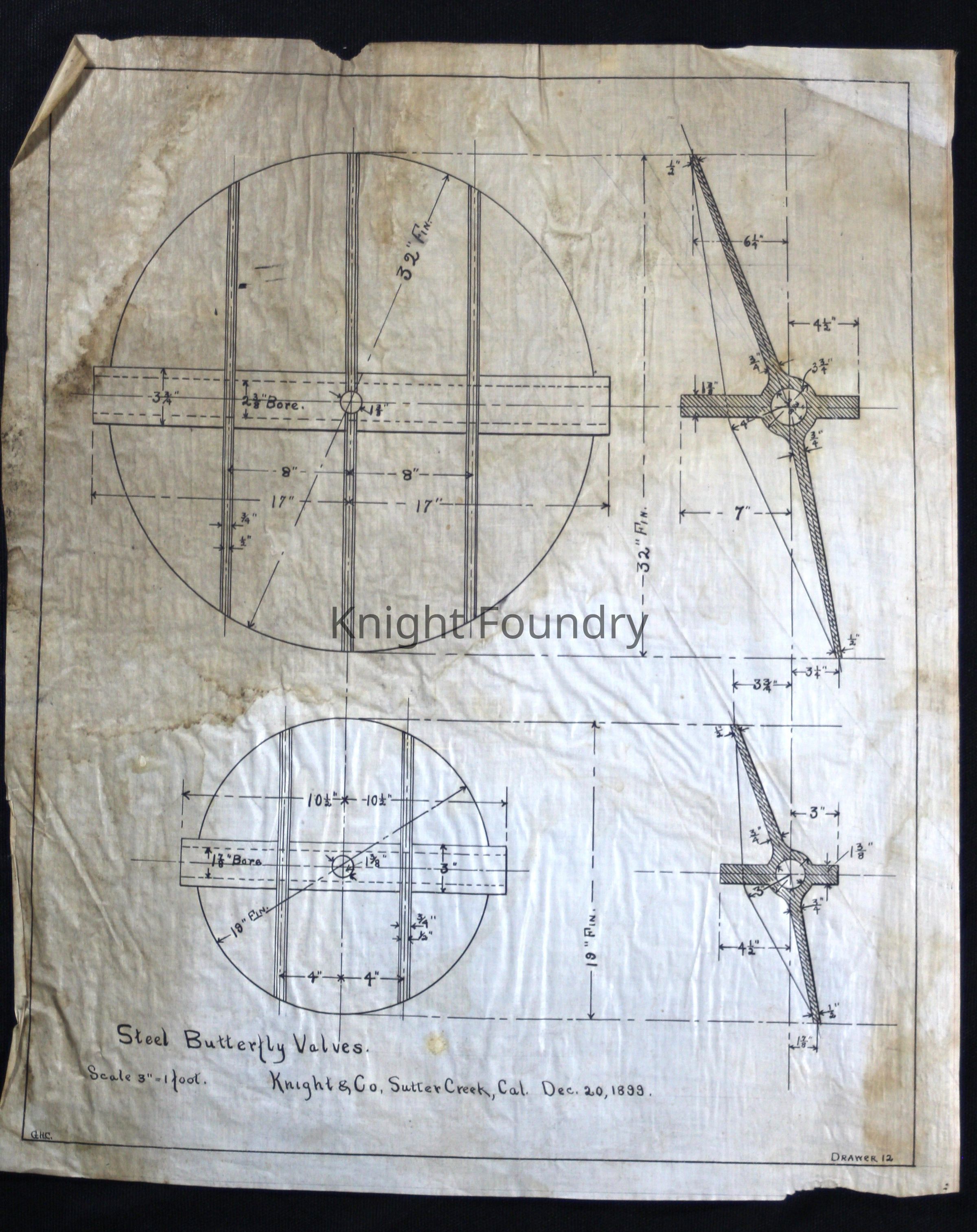Drawing of steel butterfly valves. Labeled as Knight & Co., Sutter Creek, Cal. One valve has a 19 inch finished diameter, the other has a 32 inch finished diameter. Marked Drawer 12.Collection
