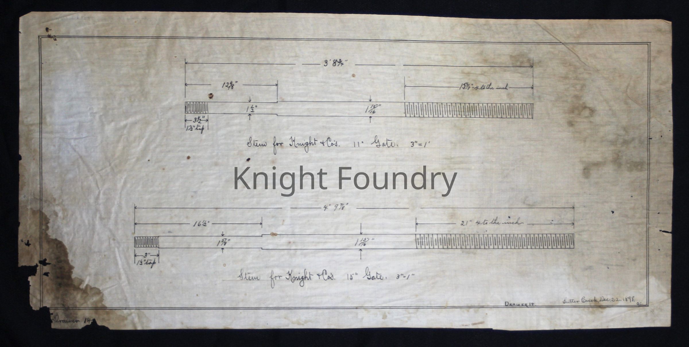 Drawing of stems for the Knight and Company's 11 inch and 15 inch gates. Including details of threading. The drawing is marked Drawer 14.Collection