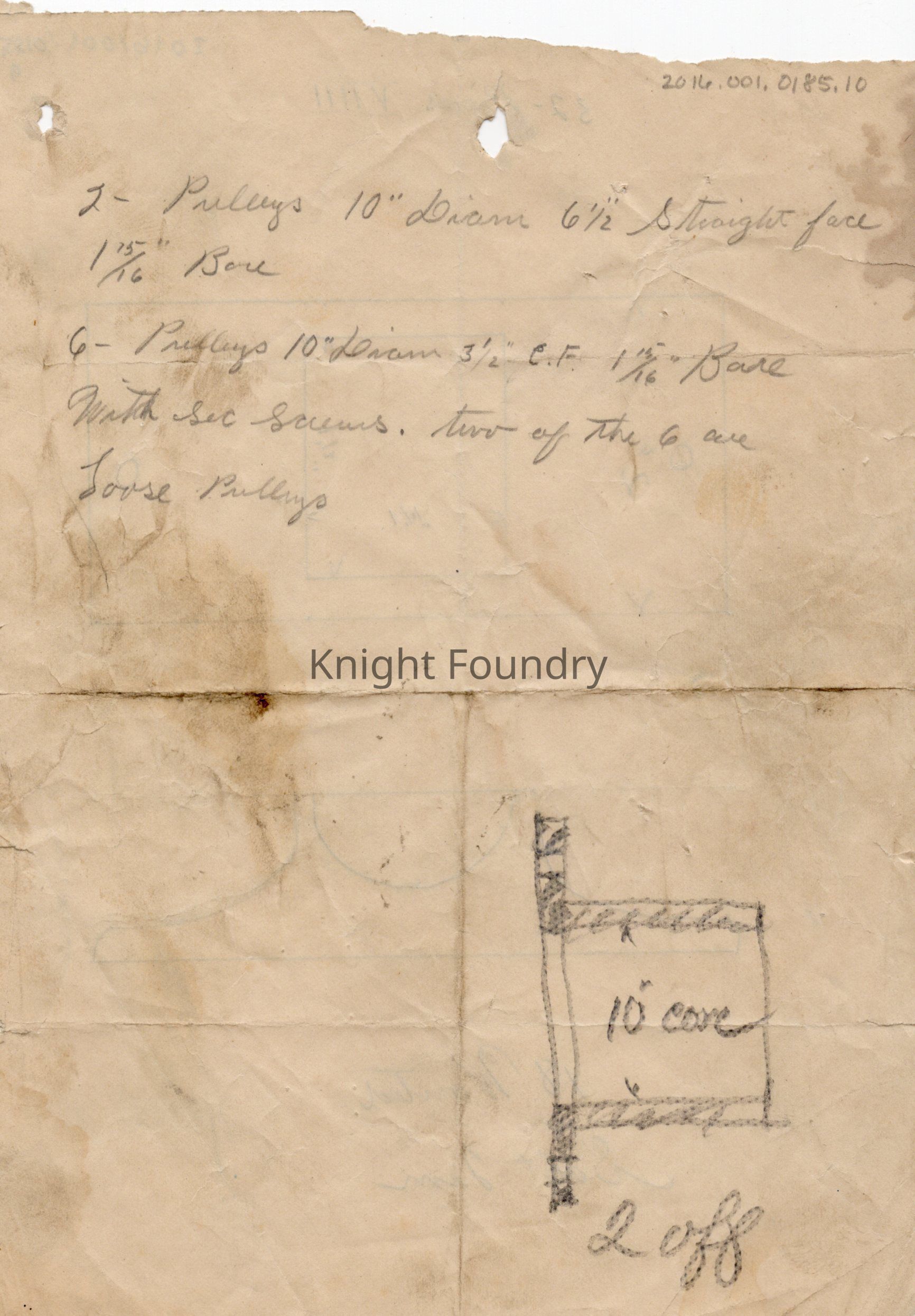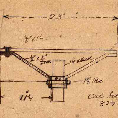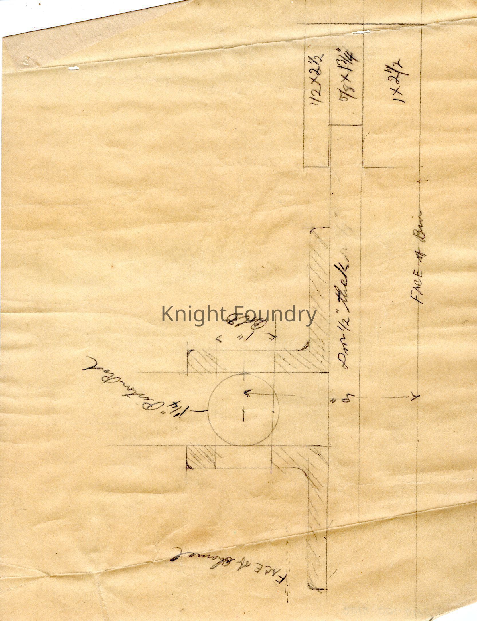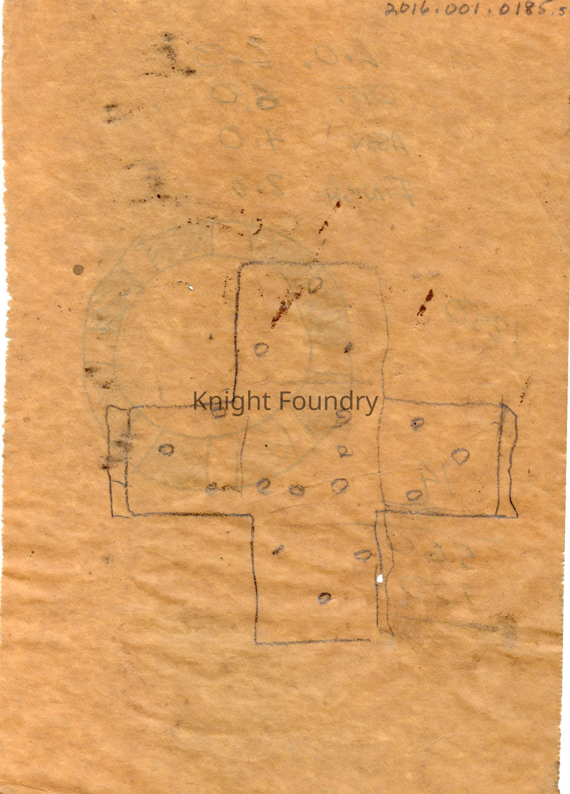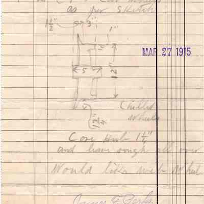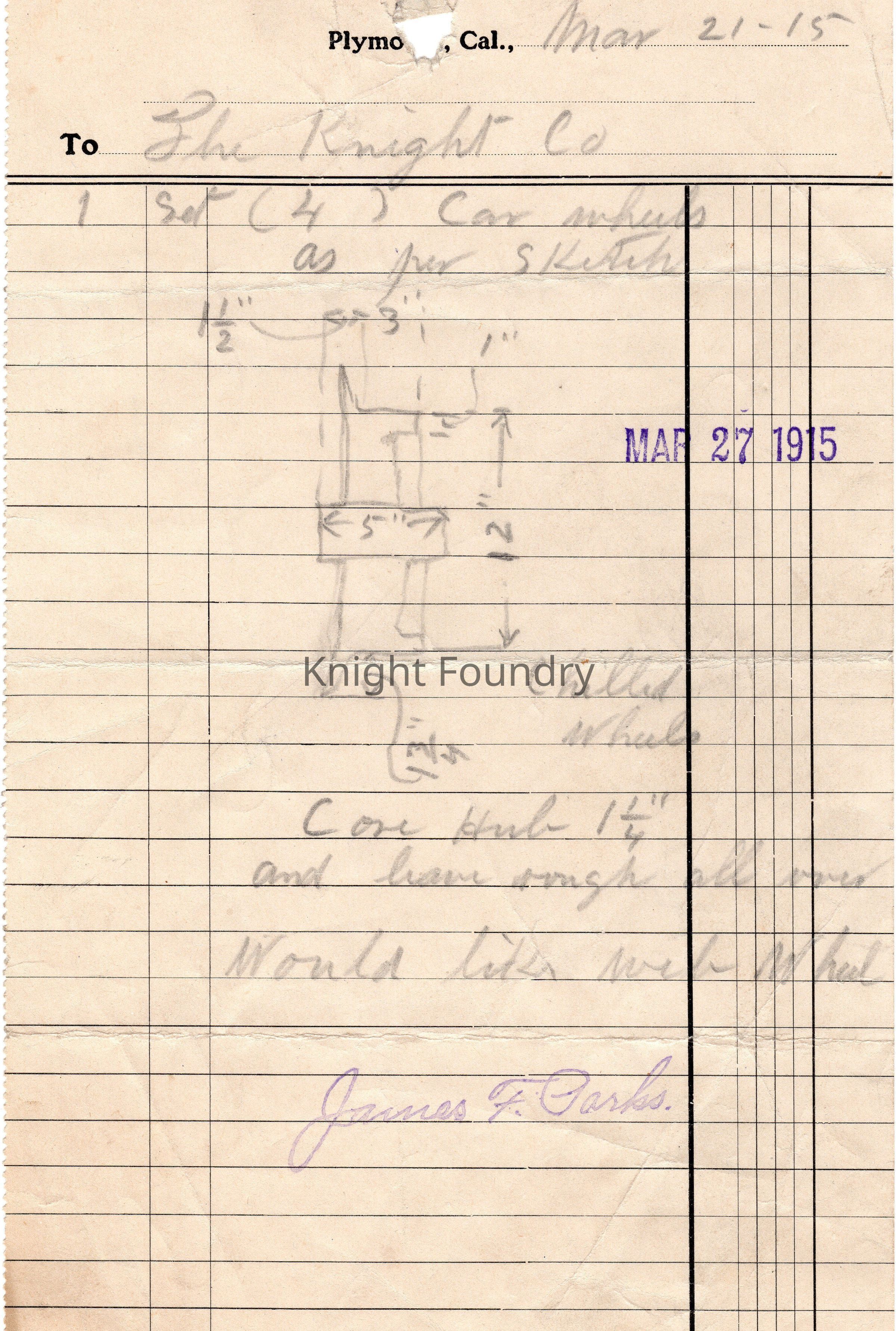 Template for a 9 inch circular part with bolt holes. One small drawing is of car wheels, requesting a set of 4, stamped with signature of James F. Parks, Plymouth, Ca. March 21, 1915. Other drawings show angled parts and piston rods. Drawings on different types of paper and cardboard.Collection