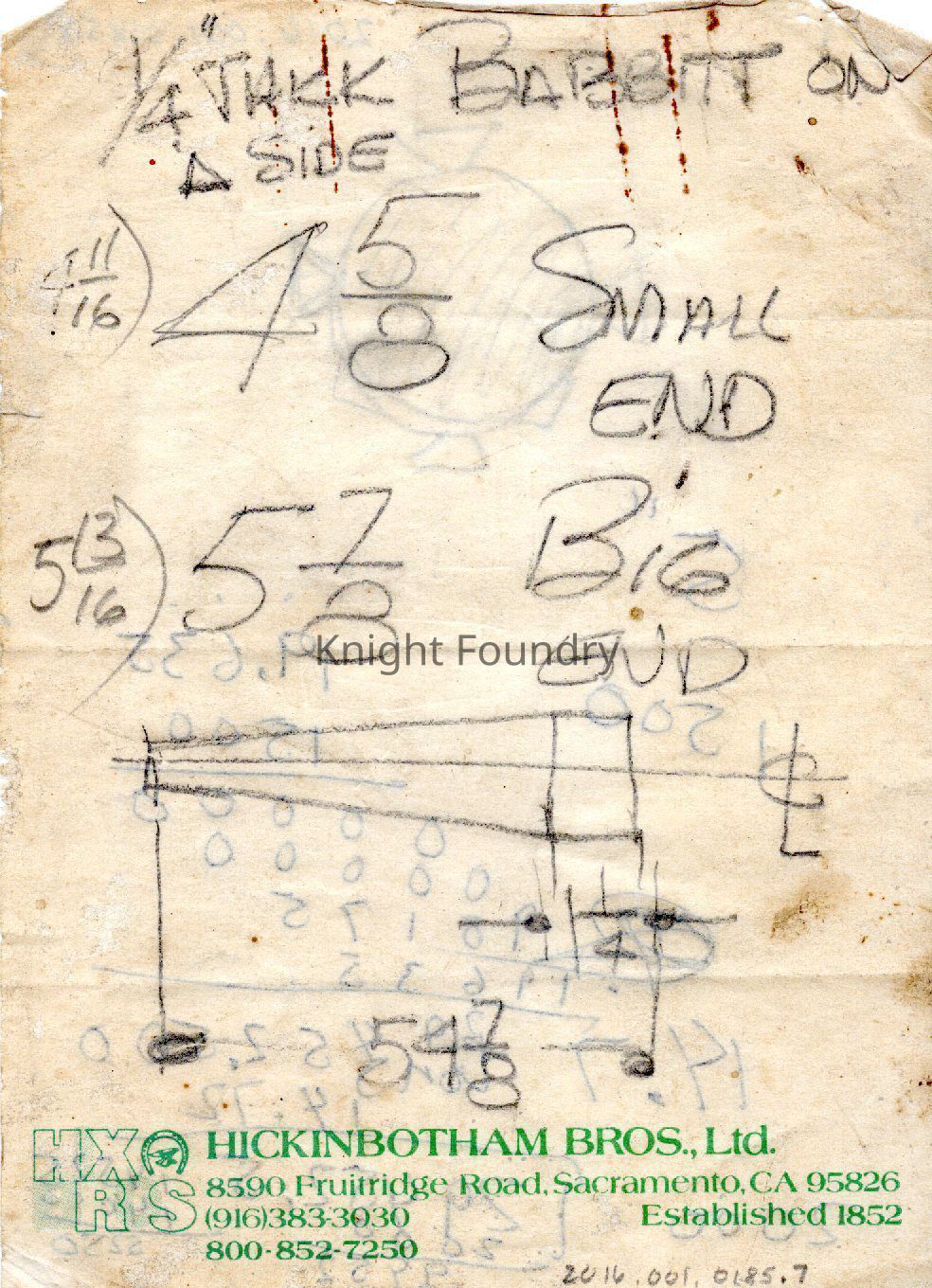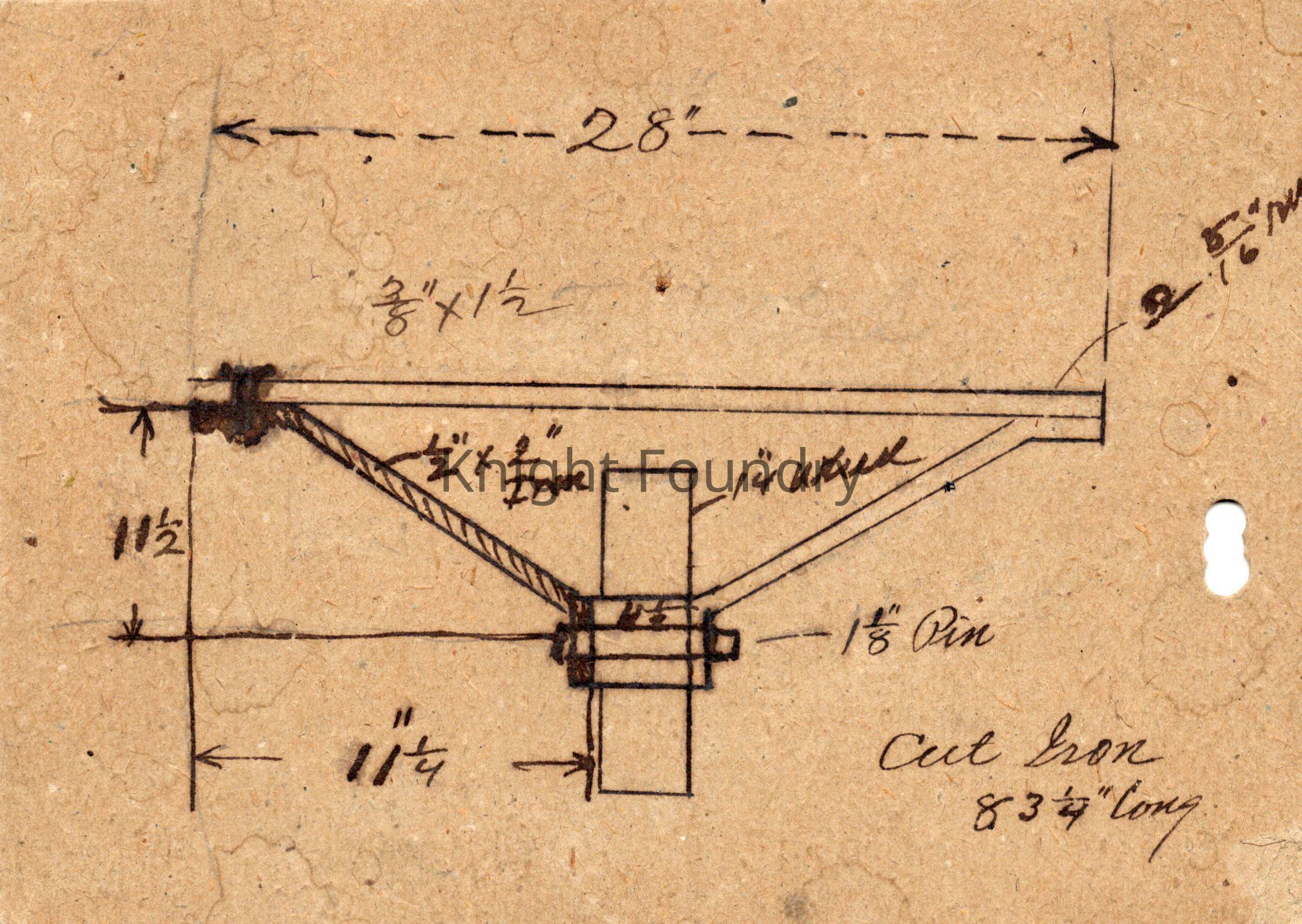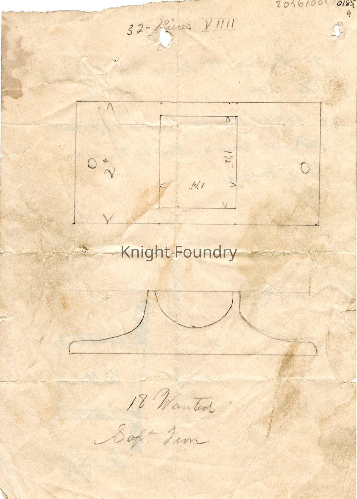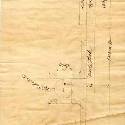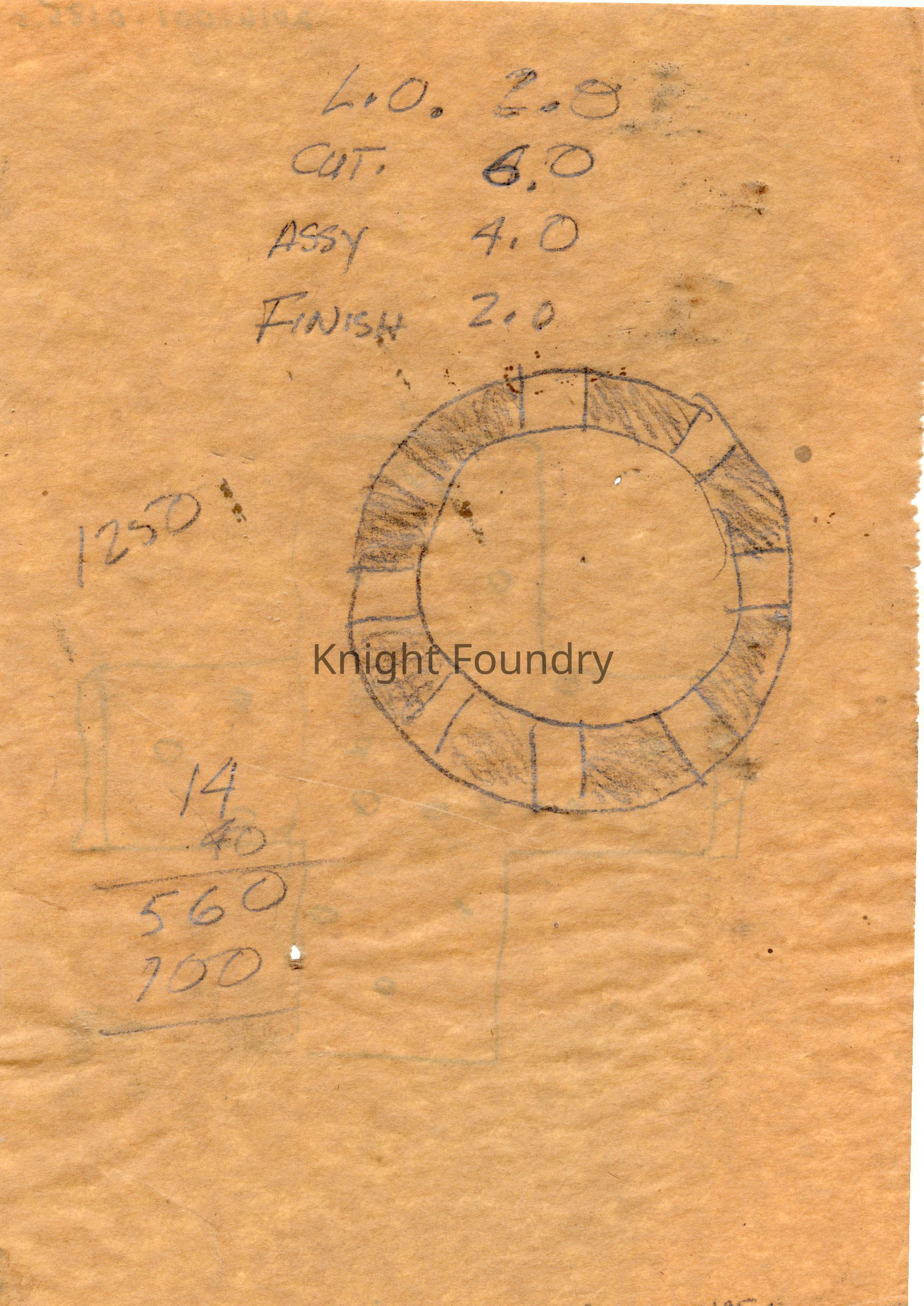 Template for a 9 inch circular part with bolt holes. One small drawing is of car wheels, requesting a set of 4, stamped with signature of James F. Parks, Plymouth, Ca. March 21, 1915. Other drawings show angled parts and piston rods. Drawings on different types of paper and cardboard.Collection