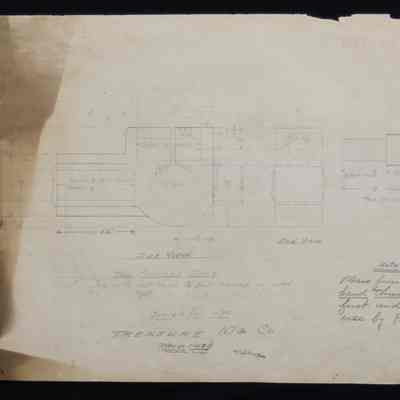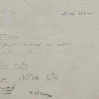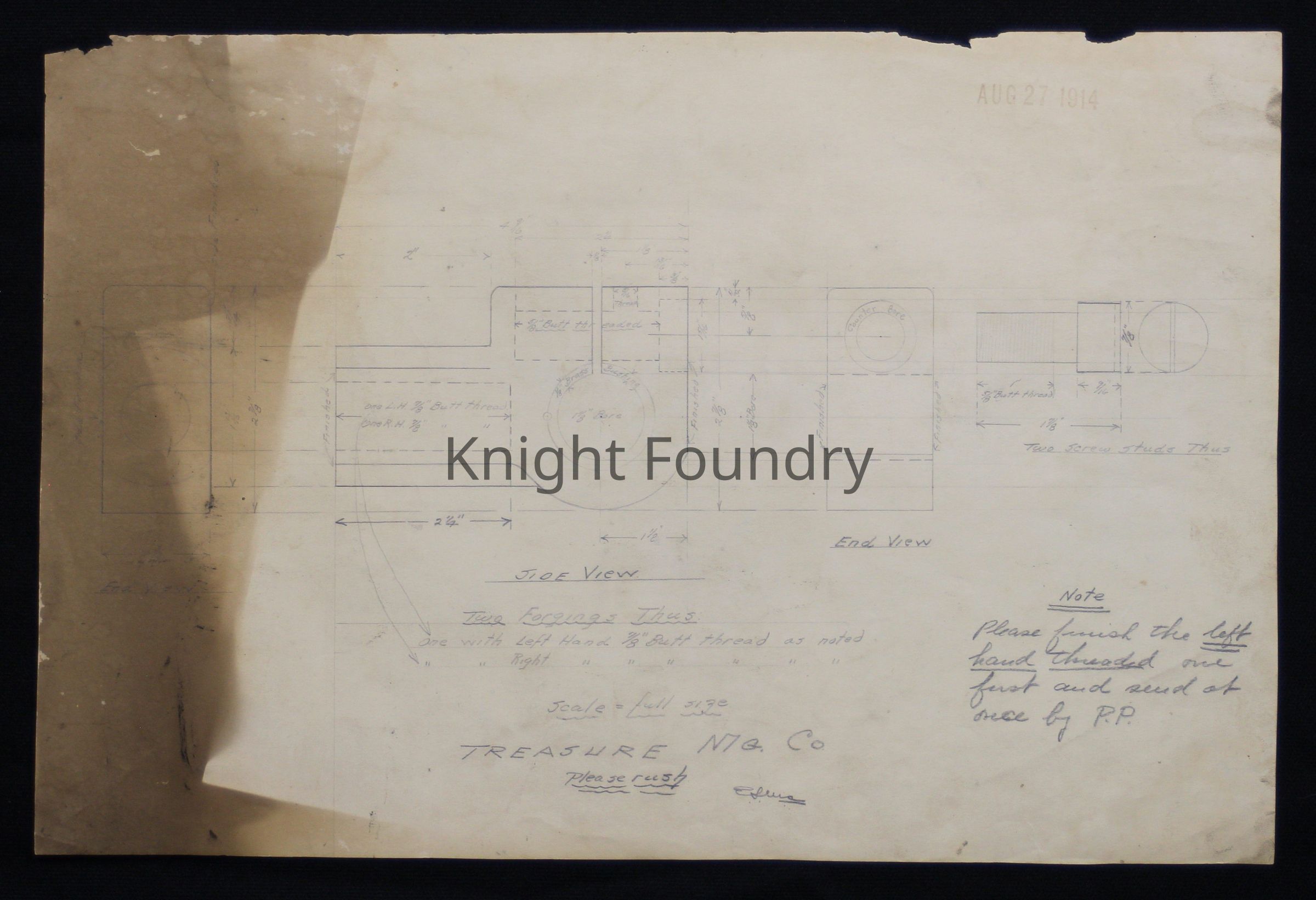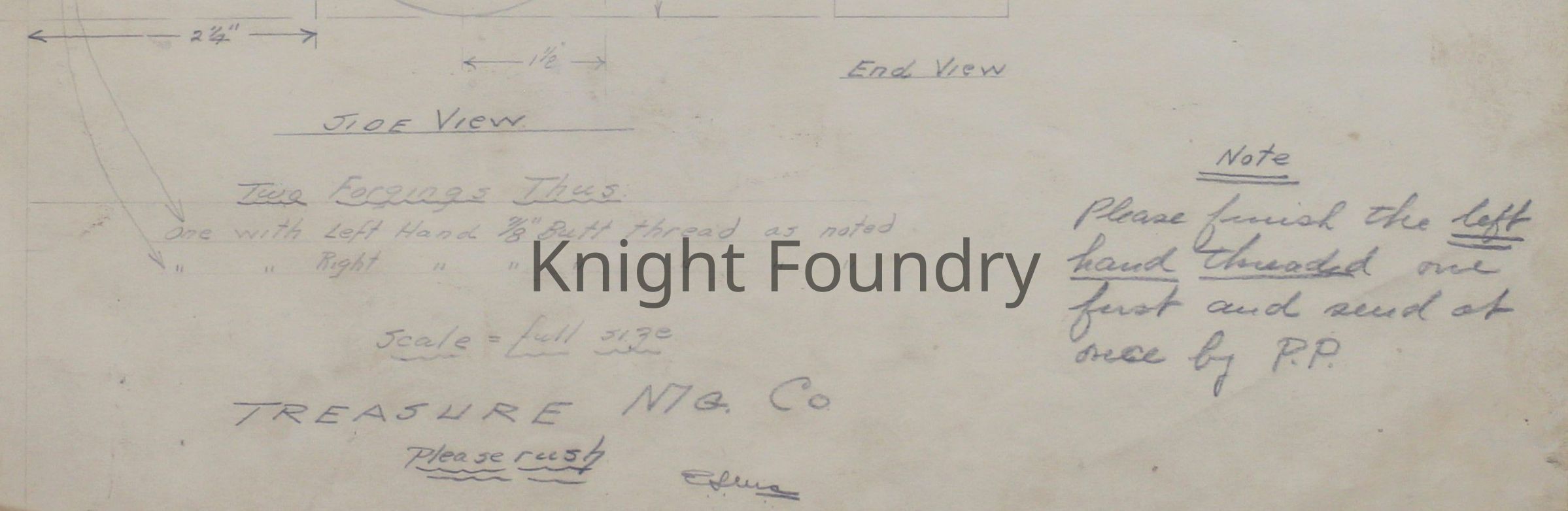 Drawing of two items that contain a left hand 7/8 inch butt thread. The notes on this drawing read "Two Forgings Thus. - One with Left Hand 7/8" Butt thread as noted Right", "Please Rush", and "Please finish the left hand threaded one first and send at once by P.P."Collection