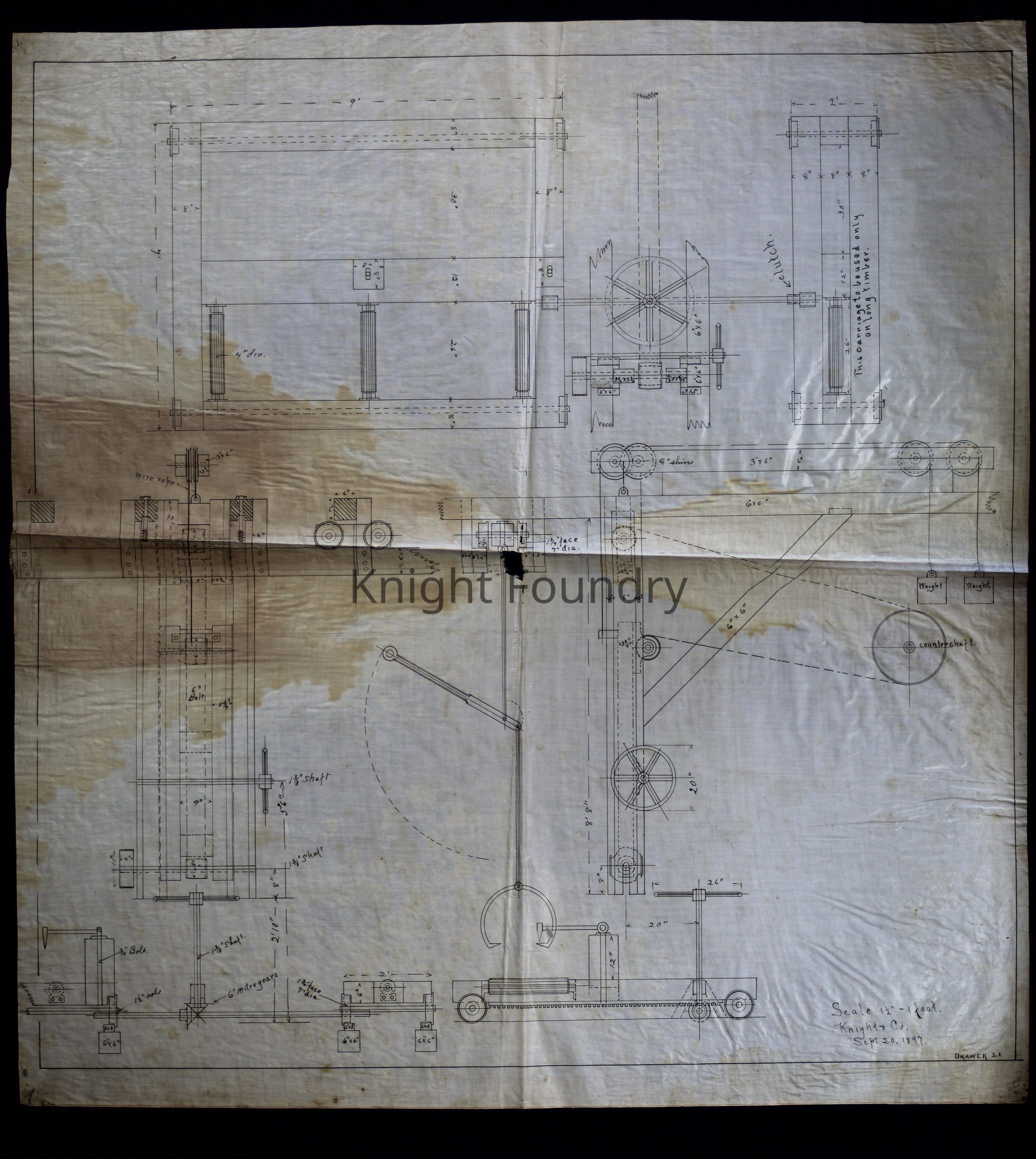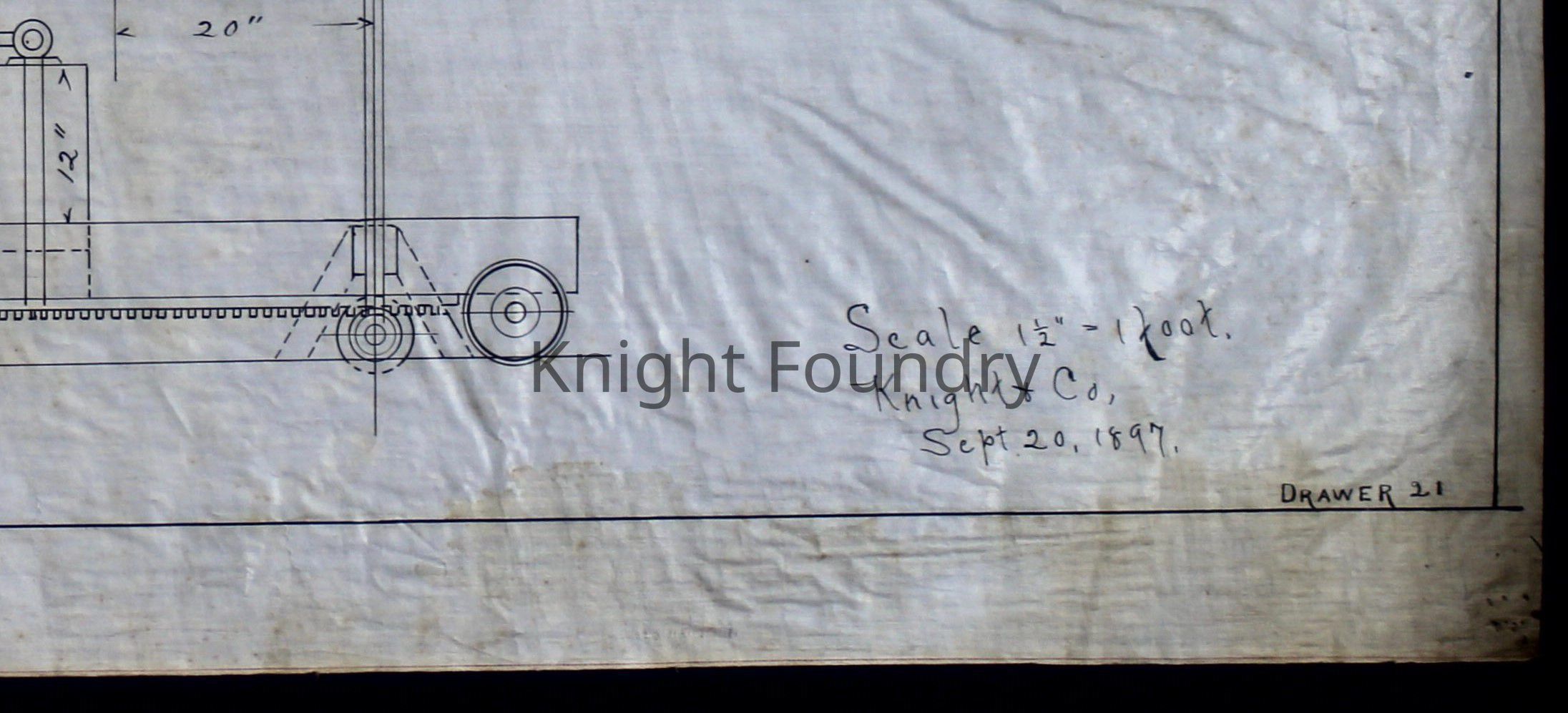 Drawing of a timber planer and carriage. Includes multiple views. The drawing is marked drawer 21.Collection