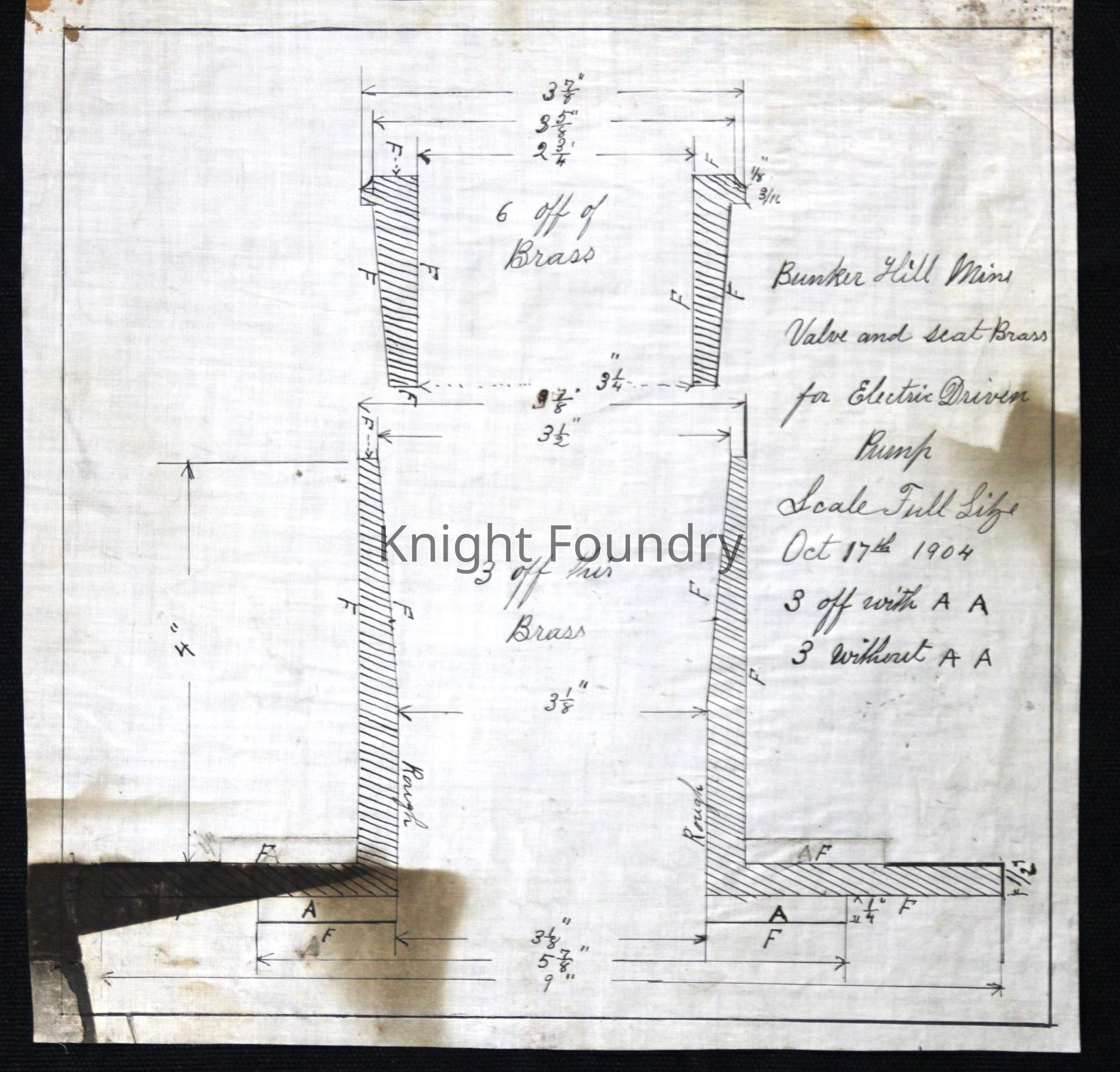 Drawing of a valve and seat brass for an electric driven pump for the Bunker Hill Mine. Drawing specifies 3 off with AA and 3 without AA.Collection