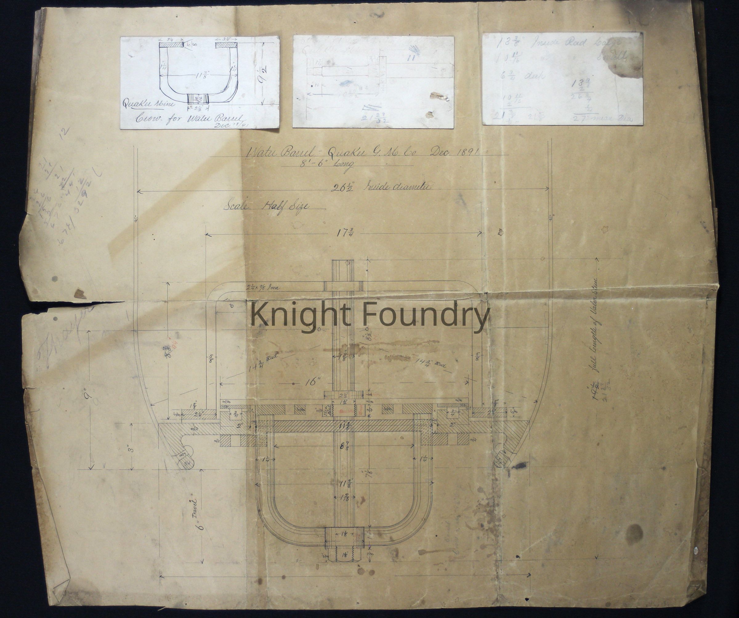 Drawing of a water barrel for the Quaker G. Mining Co. It is labeled as 8 feet 6 inches long with a 26 1/2 inch inside diameter. There are three 3 x 5 cards glued on to the original that include more water barrel details.Collection