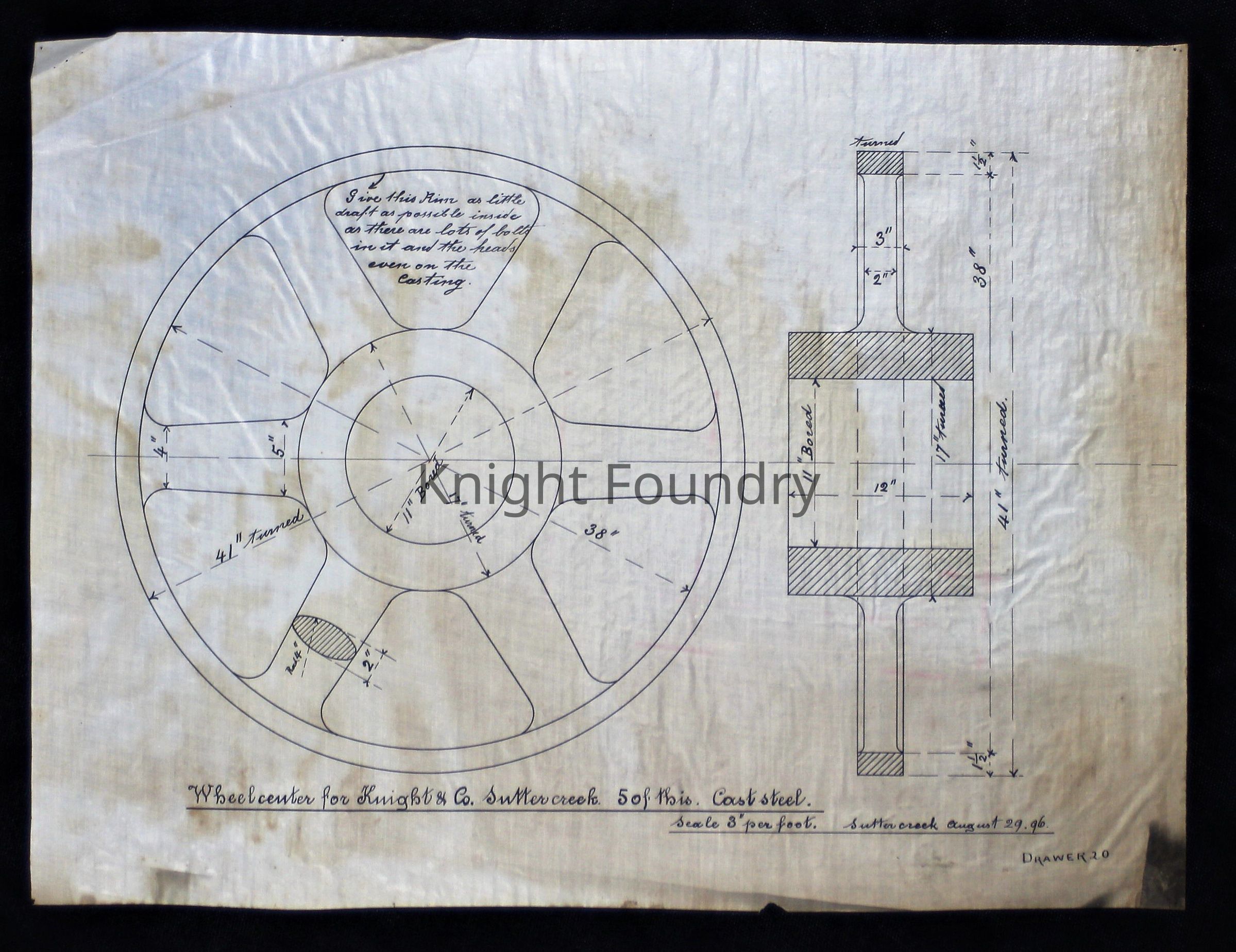 Drawing of the center of a cast steel wheel center for Knight and Company. The drawing states "give this Rim as little draft as possible inside as there are lots of bolts in it and the heads even on the casting". It is marked drawer 20.Collection