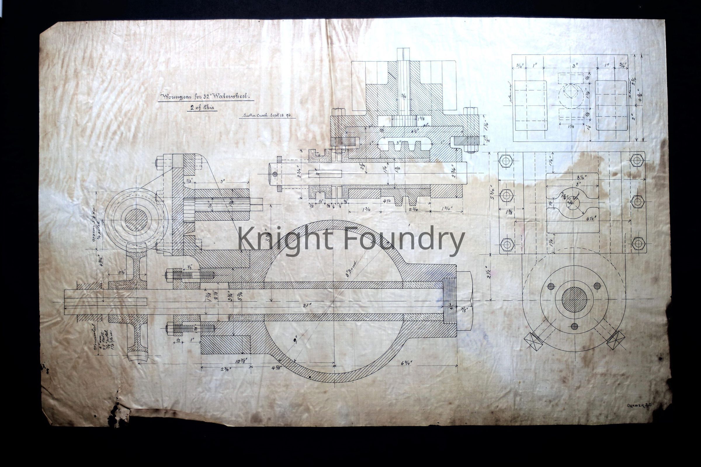 A drawing of a worm gear for a 32 inch waterwheel. The drawing notes "2 of this" and is marked drawer 20.