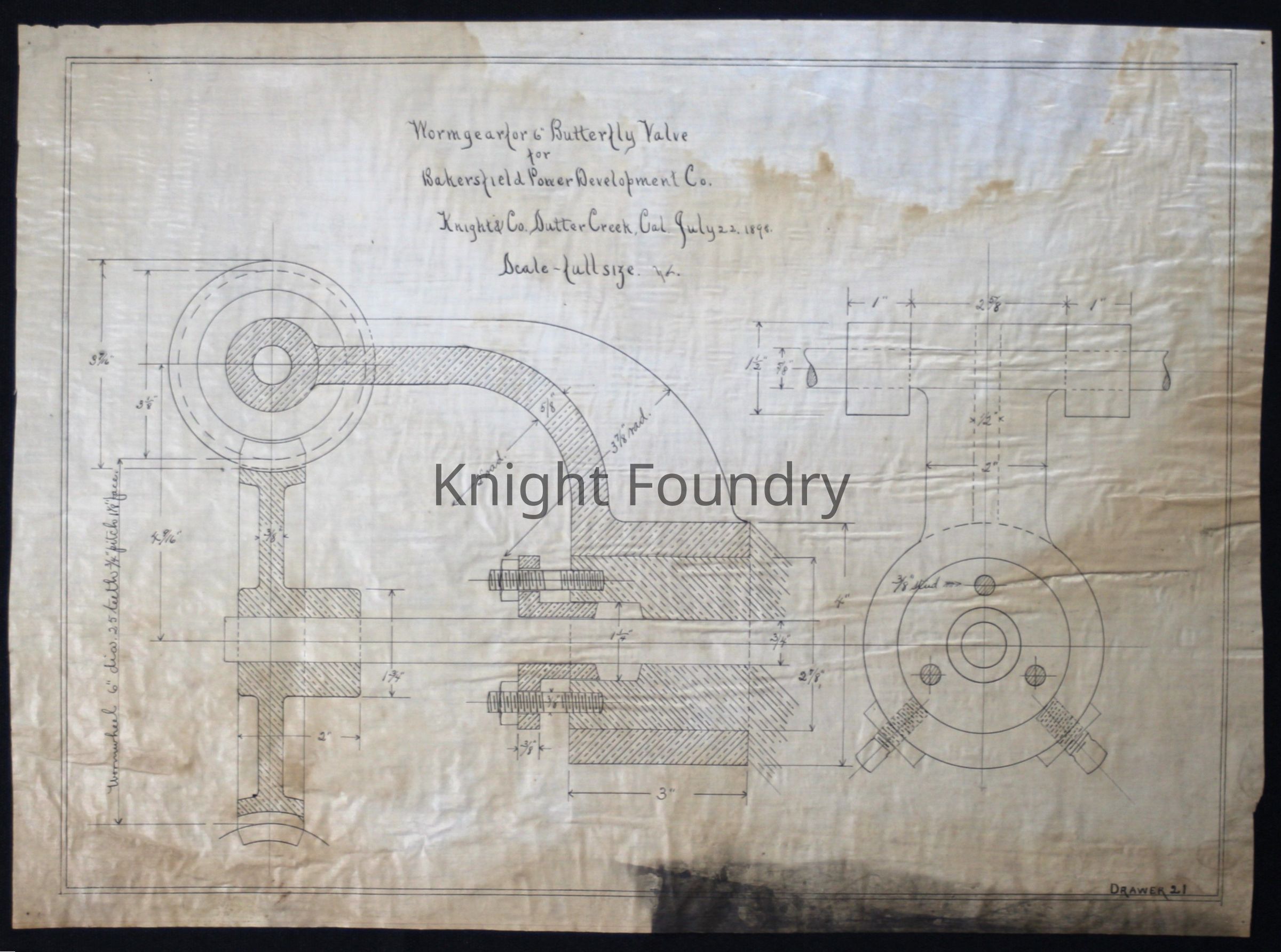 Drawing of a worm gear for a 6 inch butterfly valve for the Bakersfield Power Development Company. The drawing is marked drawer 21.