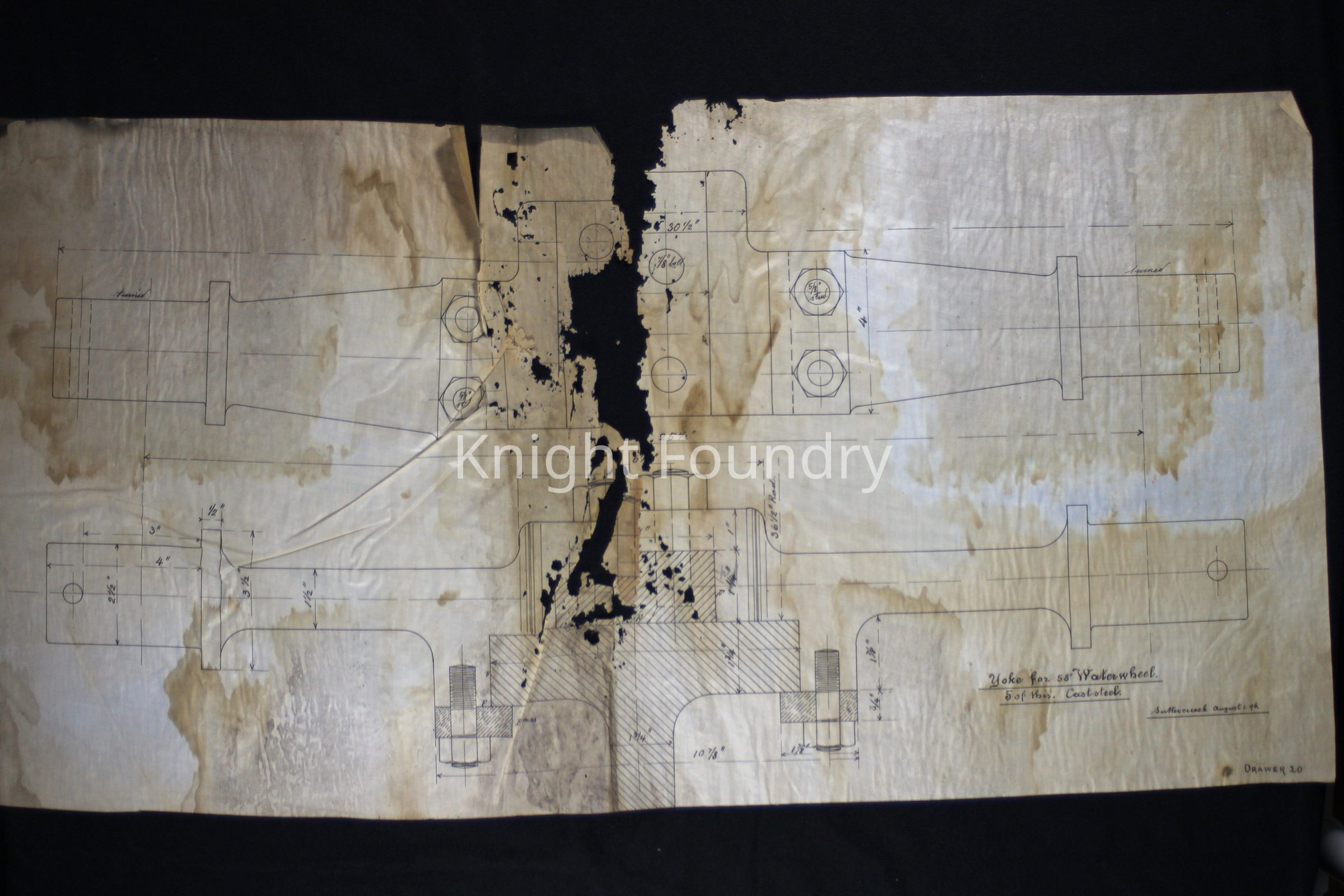 A drawing of a yoke for a 58 inch waterwheel. The drawing is marked drawer 20 and reads "5 of this, Cast steel. Sutter Creek."Collection