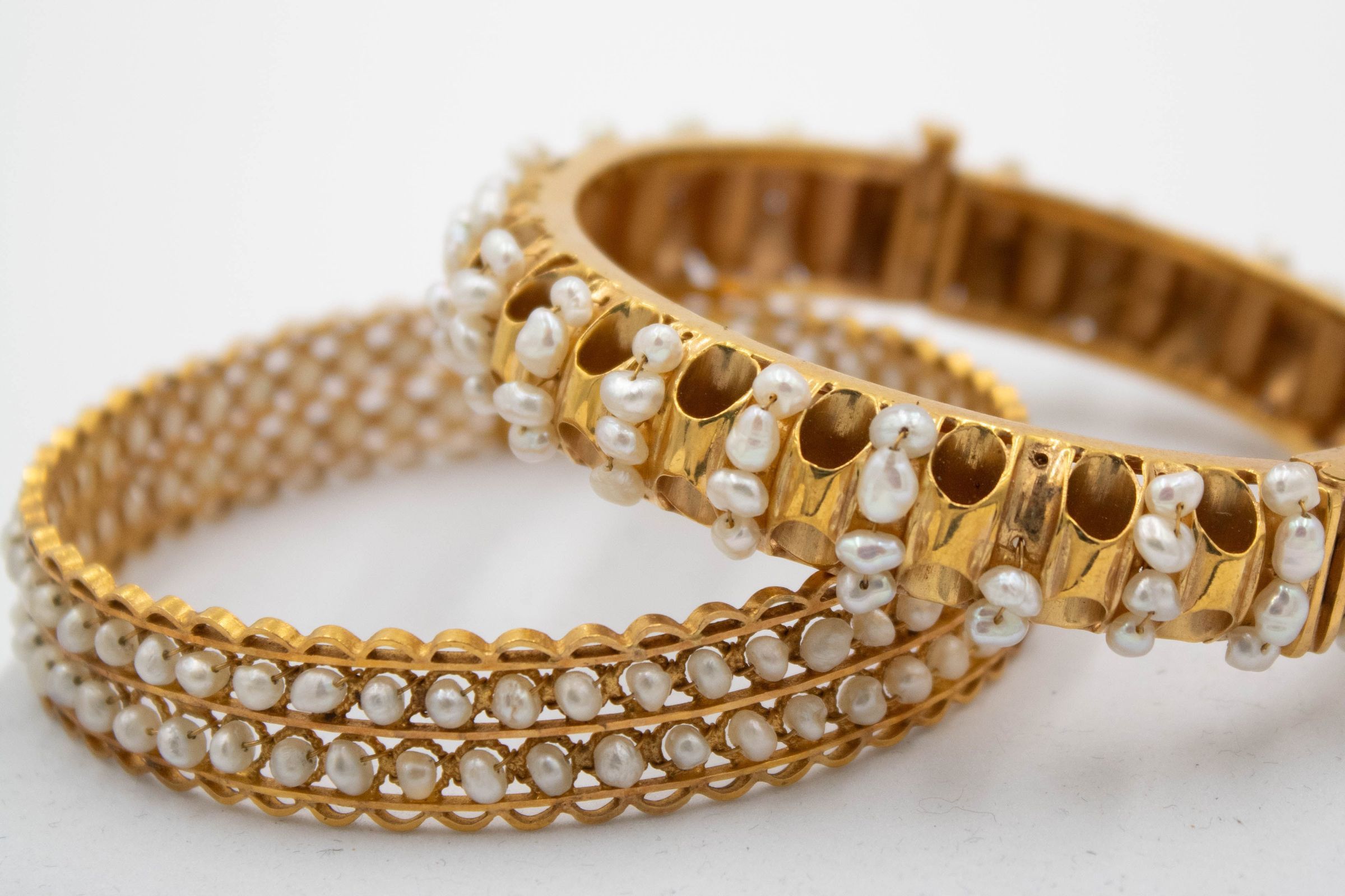 Two gold and pearl bracelets. One with two "channels" of pearls around bracelet and one with multiple rows of pearls set across the band.Context