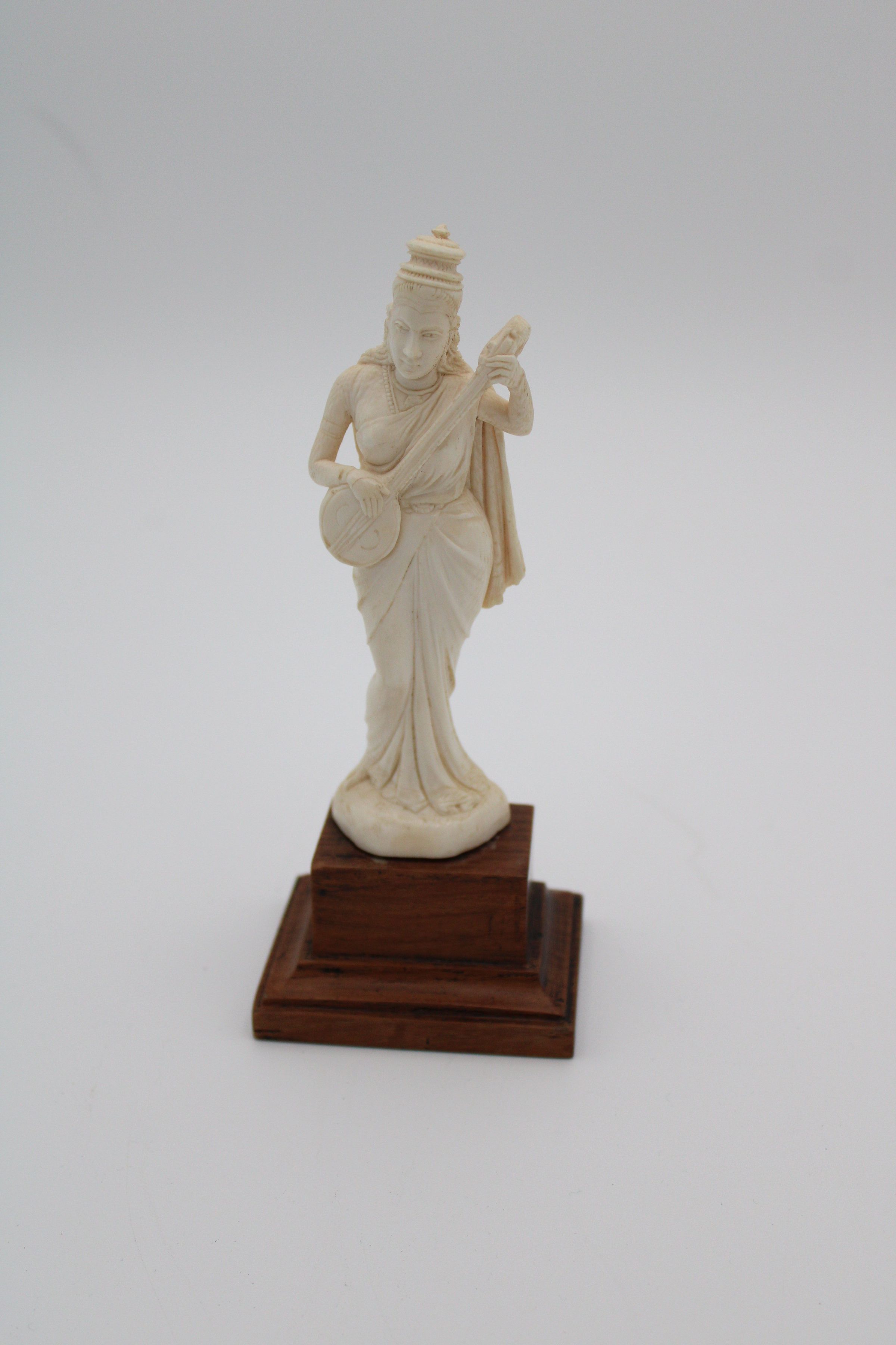 The image depicts an intricately carved ivory figurine of a woman holding a stringed instrument, standing on a wooden pedestal. She wears a long layered dress fitted to her body.