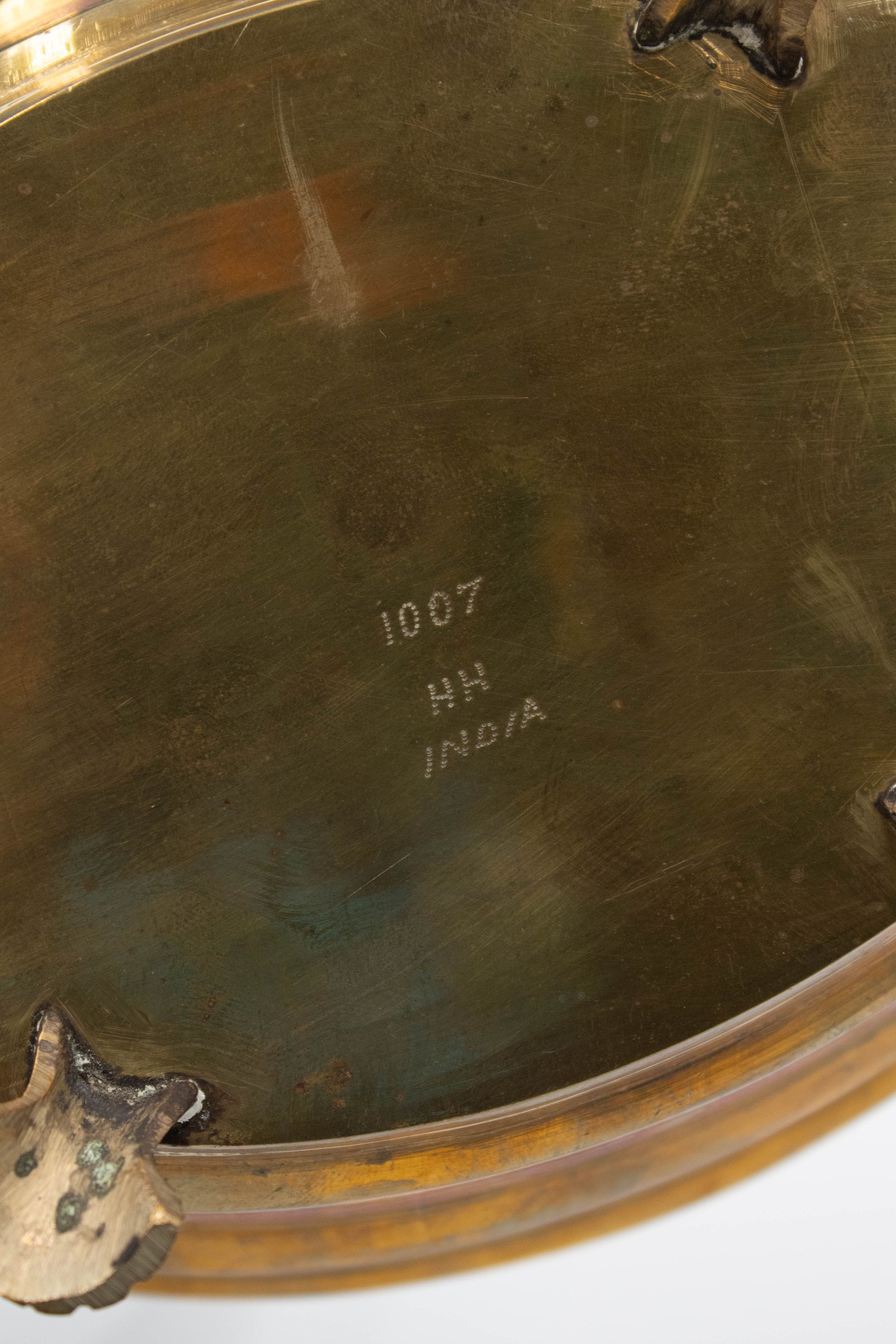 A boat shaped pot with pink and white stripes. The top has Arabic script, and the bottom two have leaf designs. It has four small feet lifting it an inch into the air.