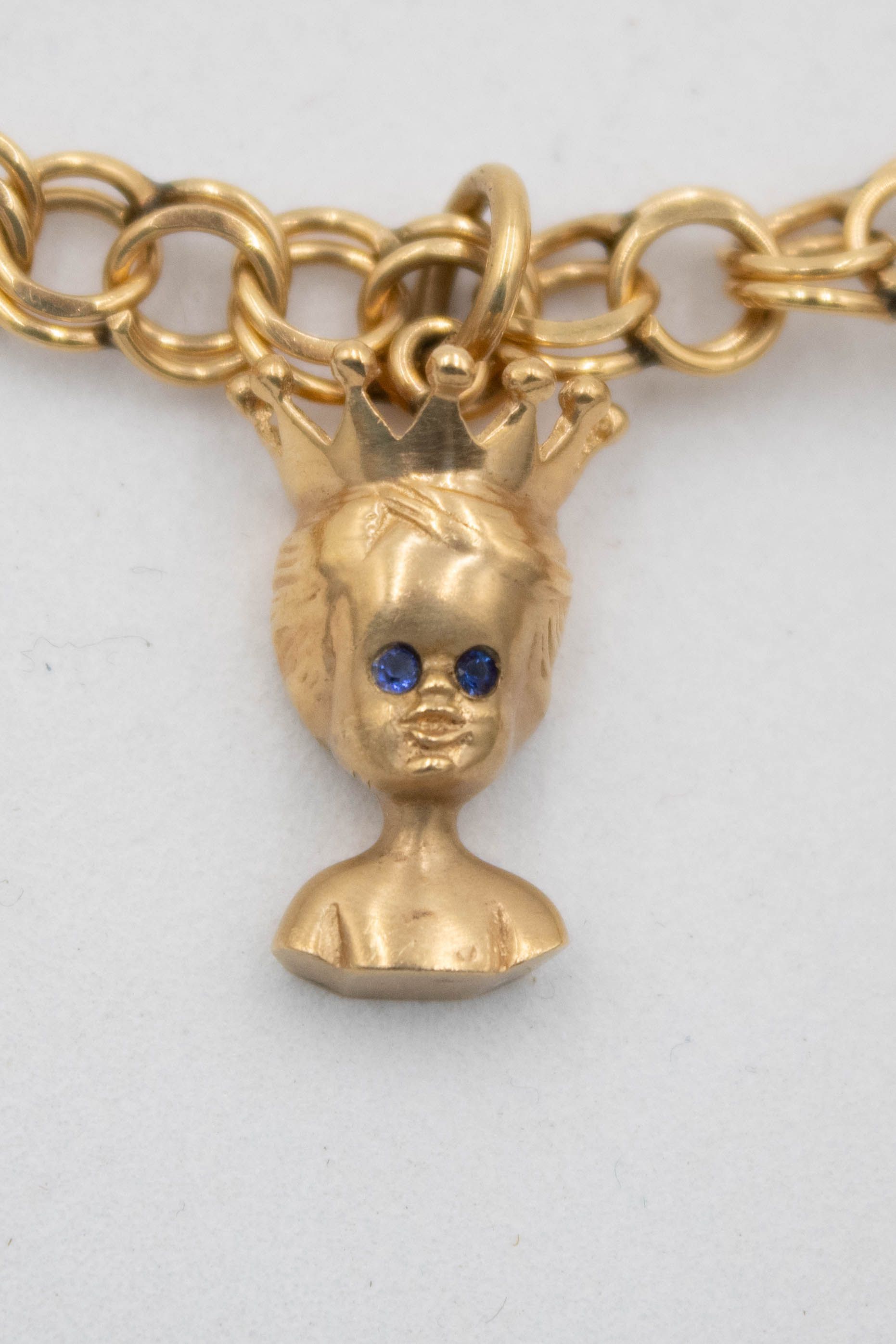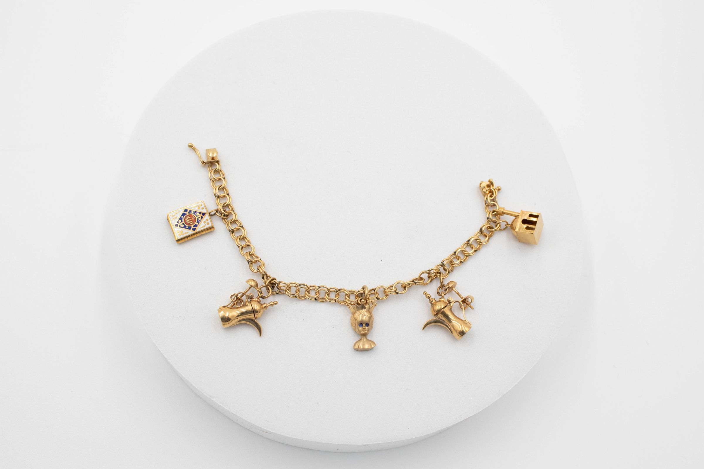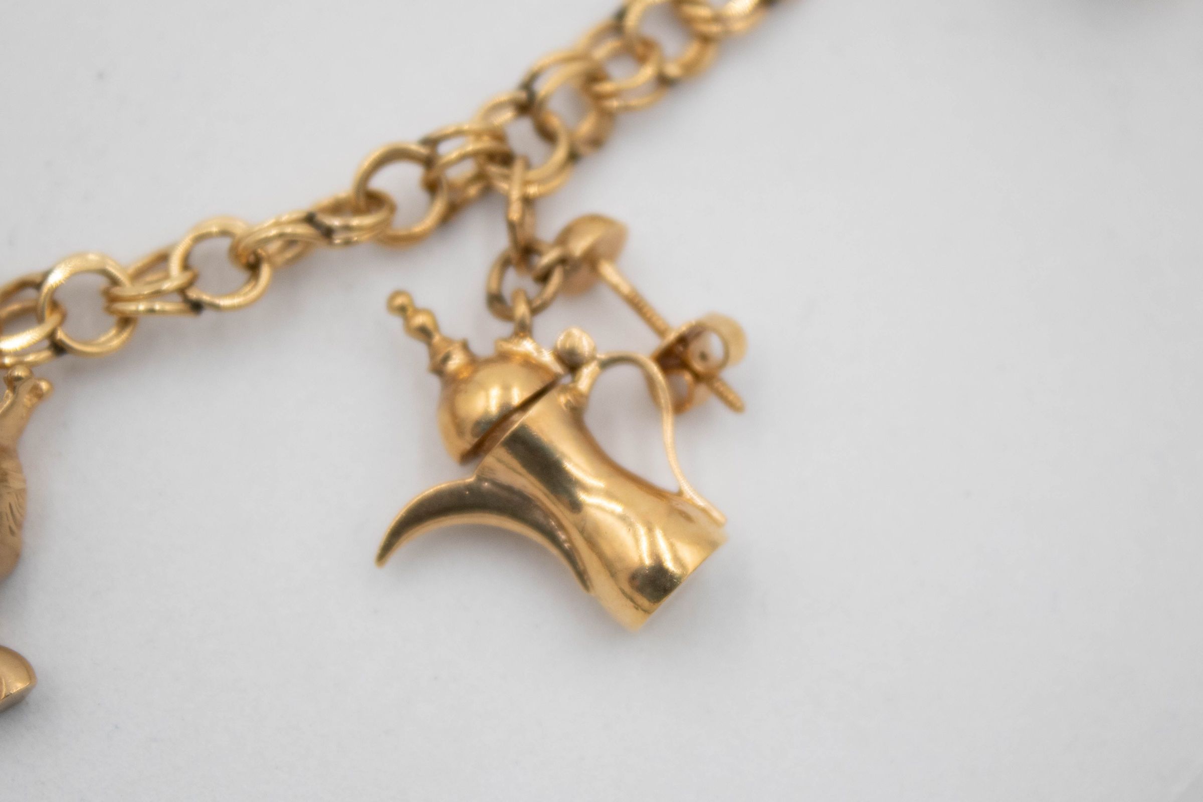 Image of the gold five-charm bracelet on gold chain. There is a book charm with Arabic script, two small Arabic coffee pots, a small mosque building, and a bust of a boy with a crown and blue gem eyes. The two coffee pot charms are earrings and still have the mechanisms attached to hang them. The bracelet bracelet is Texas barbed wire-style and clasp is a four-leaf clove.